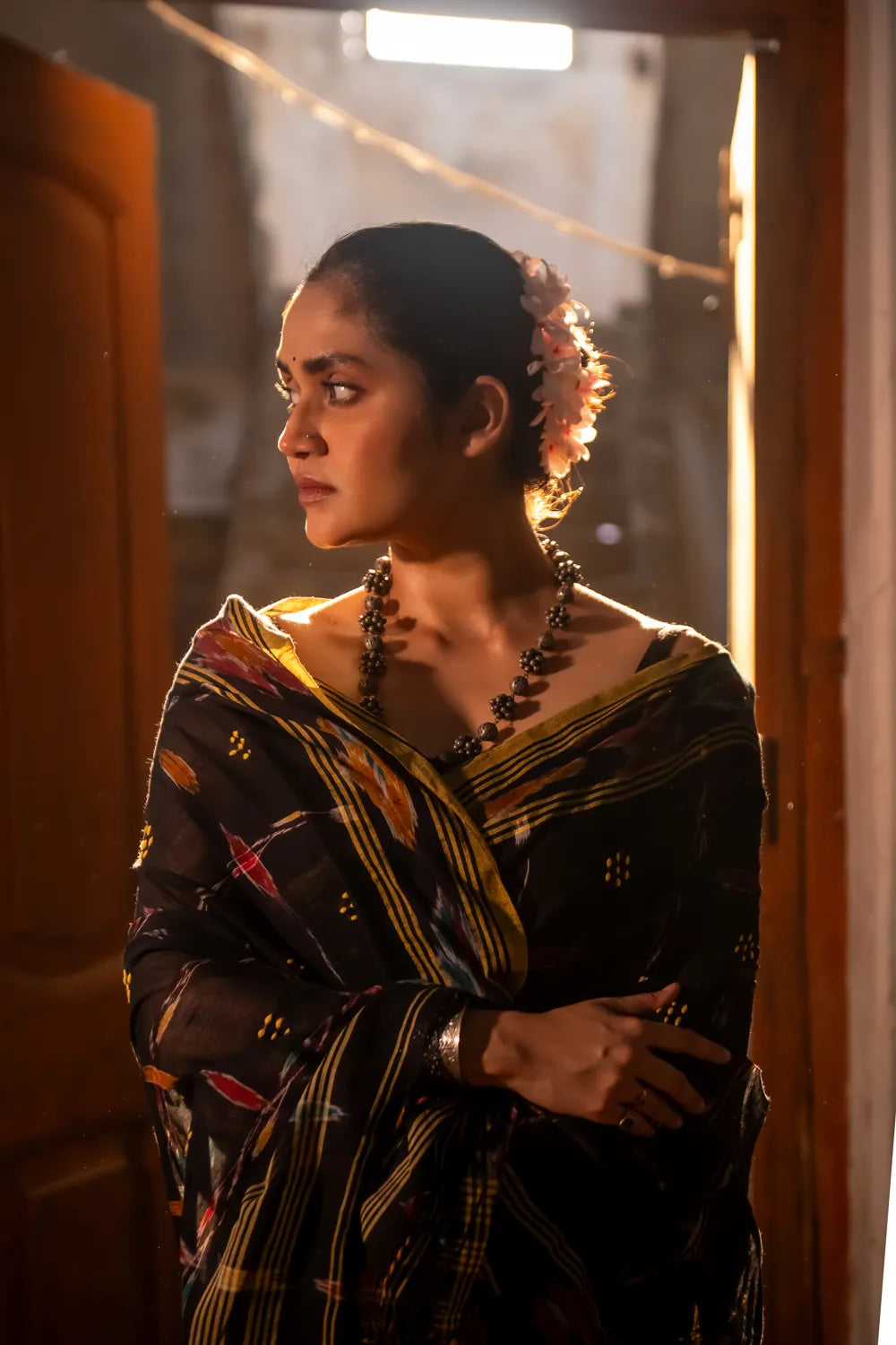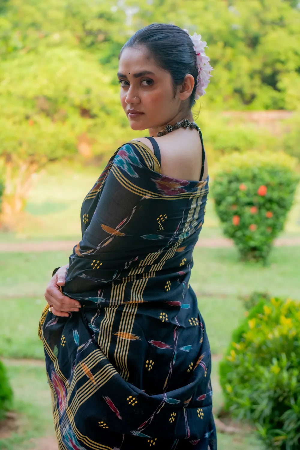 Understated and elegant, this Handloom Black Pure Cotton Saree is enhanced with a striking Ikkat border that adds a bold, artisanal touch. Woven from breathable cotton, it offers comfort without compromising on style. Perfect for both everyday grace and cultural gatherings, this saree is a beautiful blend of tradition, craftsmanship, and effortless sophistication.