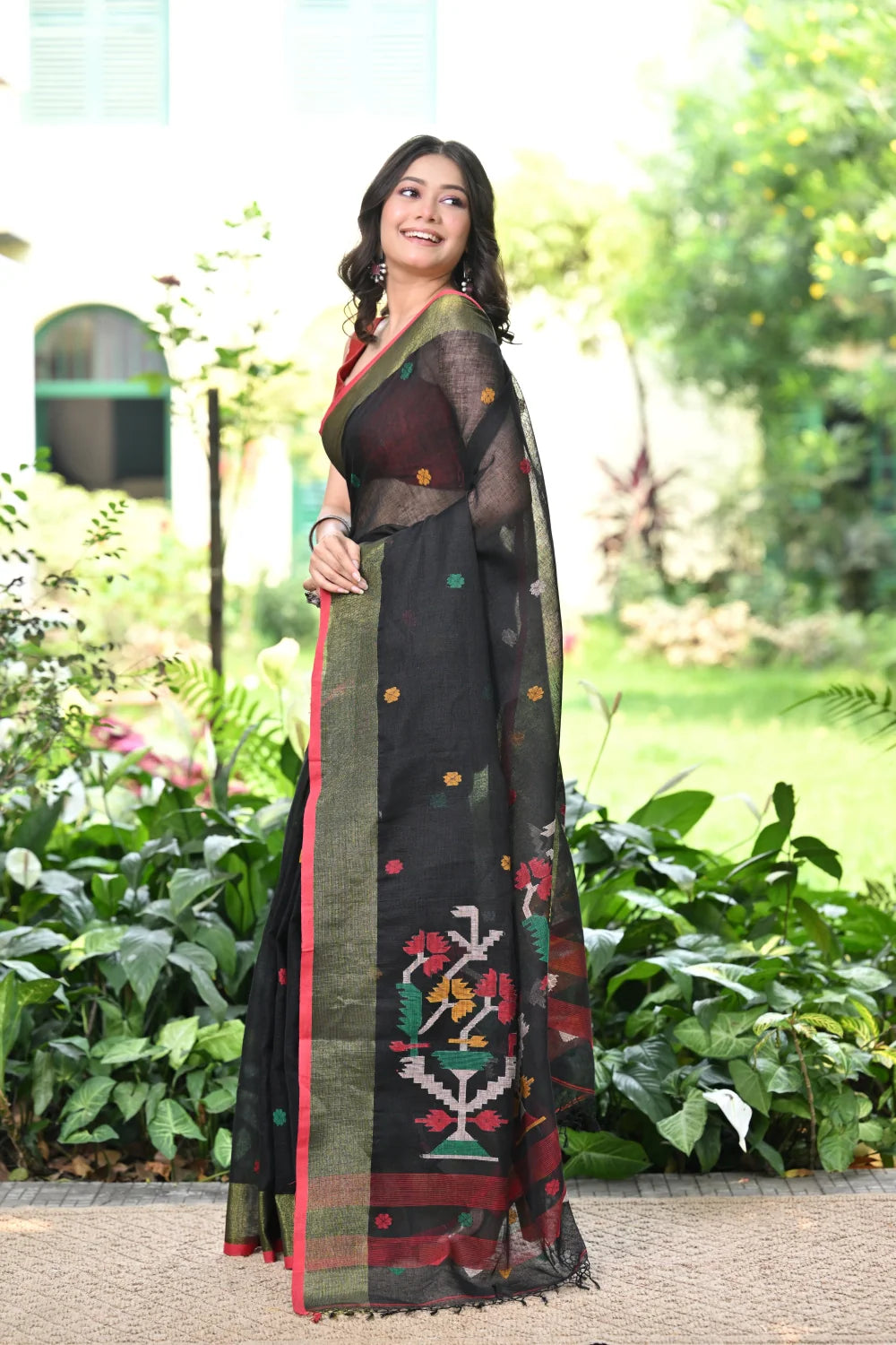 Handloom Black Pure Linen Zari Jamdani Saree, an epitome of timeless sophistication. Meticulously handcrafted, this saree showcases intricate zari Jamdani work on pure linen fabric, exuding elegance with every drape. The bold black hue is accentuated by a broad gold zari border, adding a touch of regal charm. Elevate your style with this exquisite saree, a perfect blend of tradition and modernity.