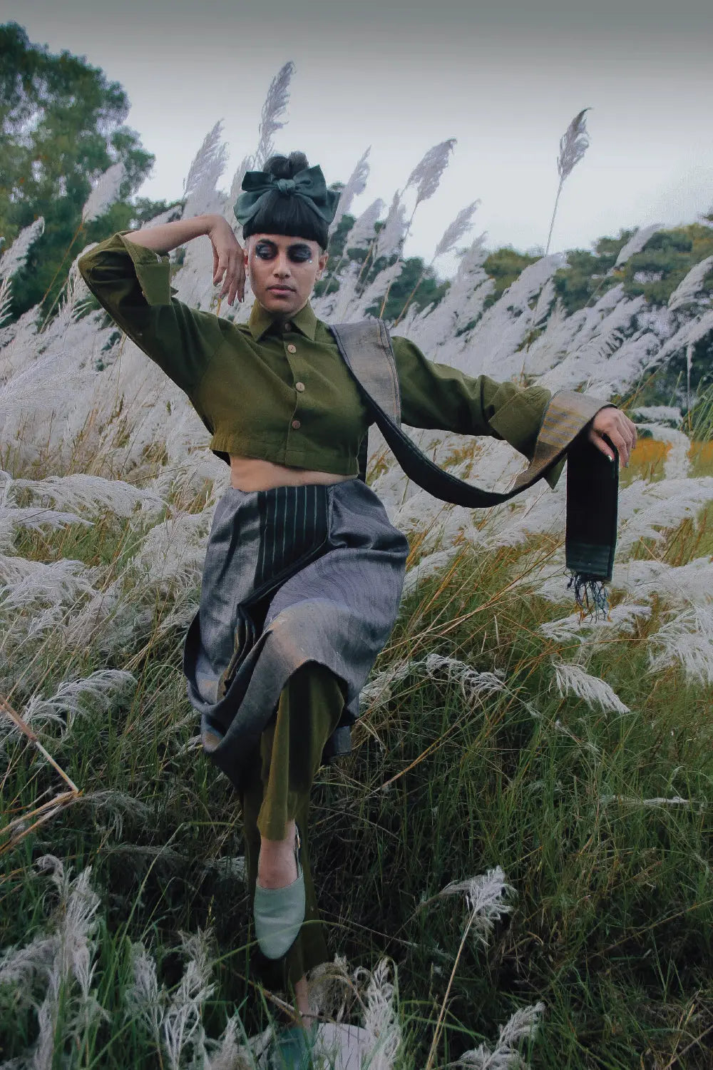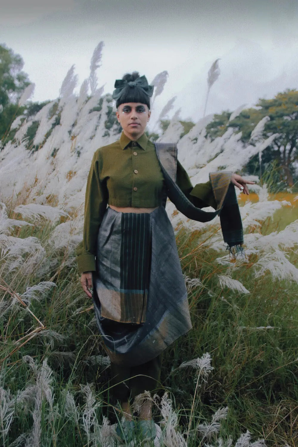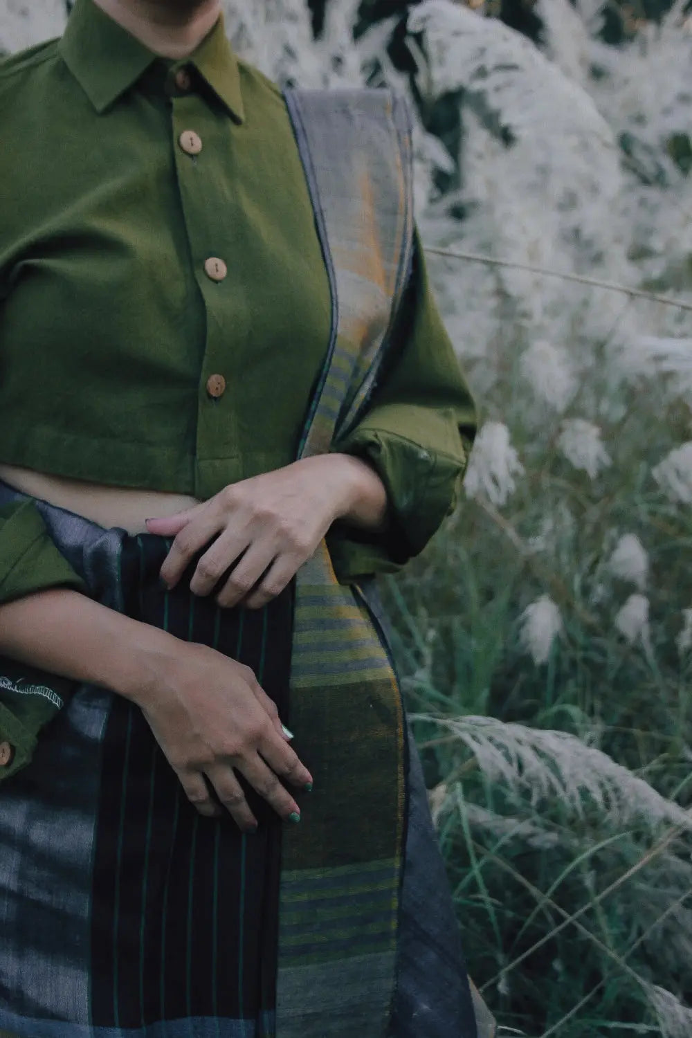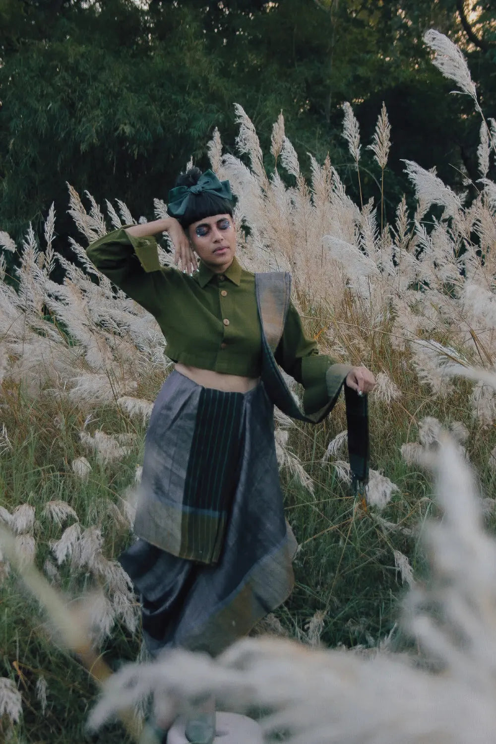 Handloom Grey Kosa Silk Saree With Broad Zari Border And Black & Green Pallu