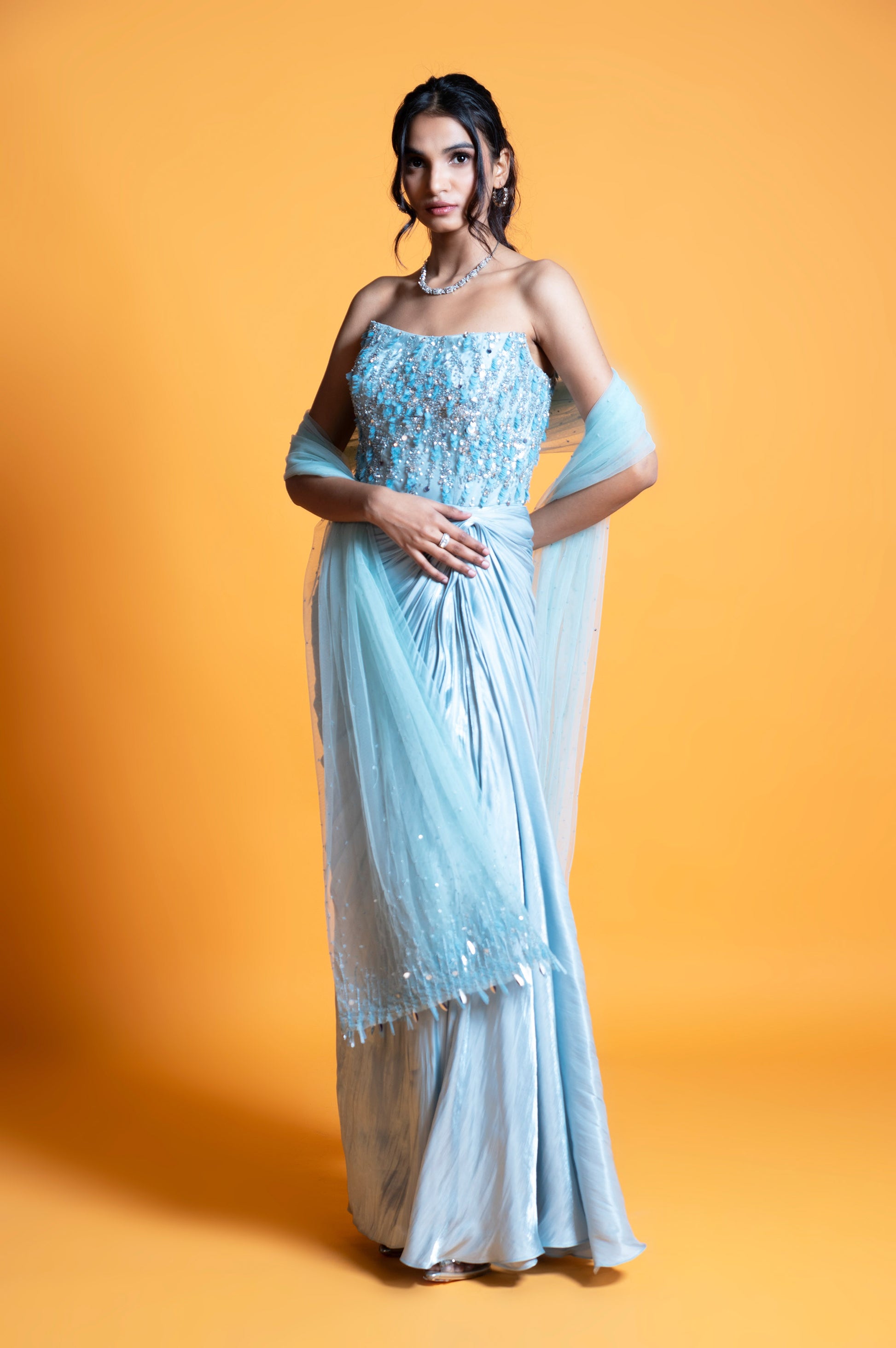 A breathtaking ice-blue gown featuring a sequined, hand-embellished bodice that cascades into a sculpted draped skirt paired with a sheer beaded dupatta.