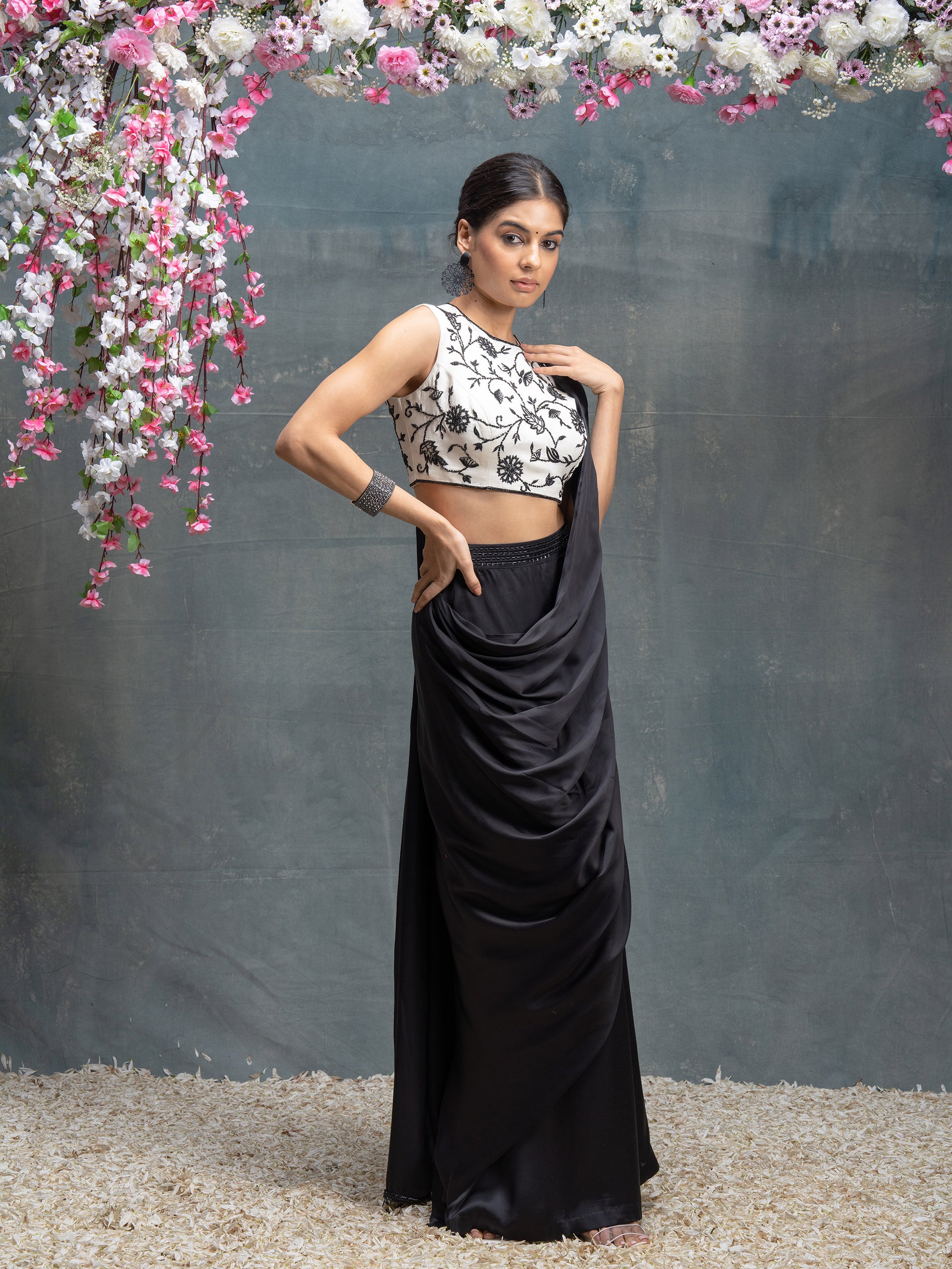 Ivory And Black Predraped Saree With Hand Embroidered Blouse