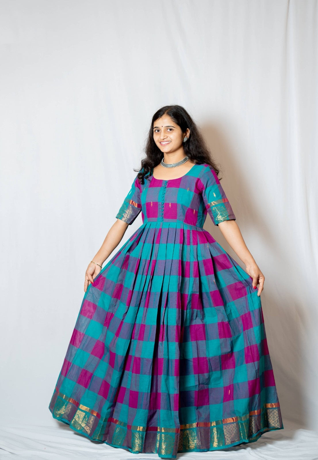 Kattam - Anarkali dress in chettinad cotton in Teal and Pink checks
