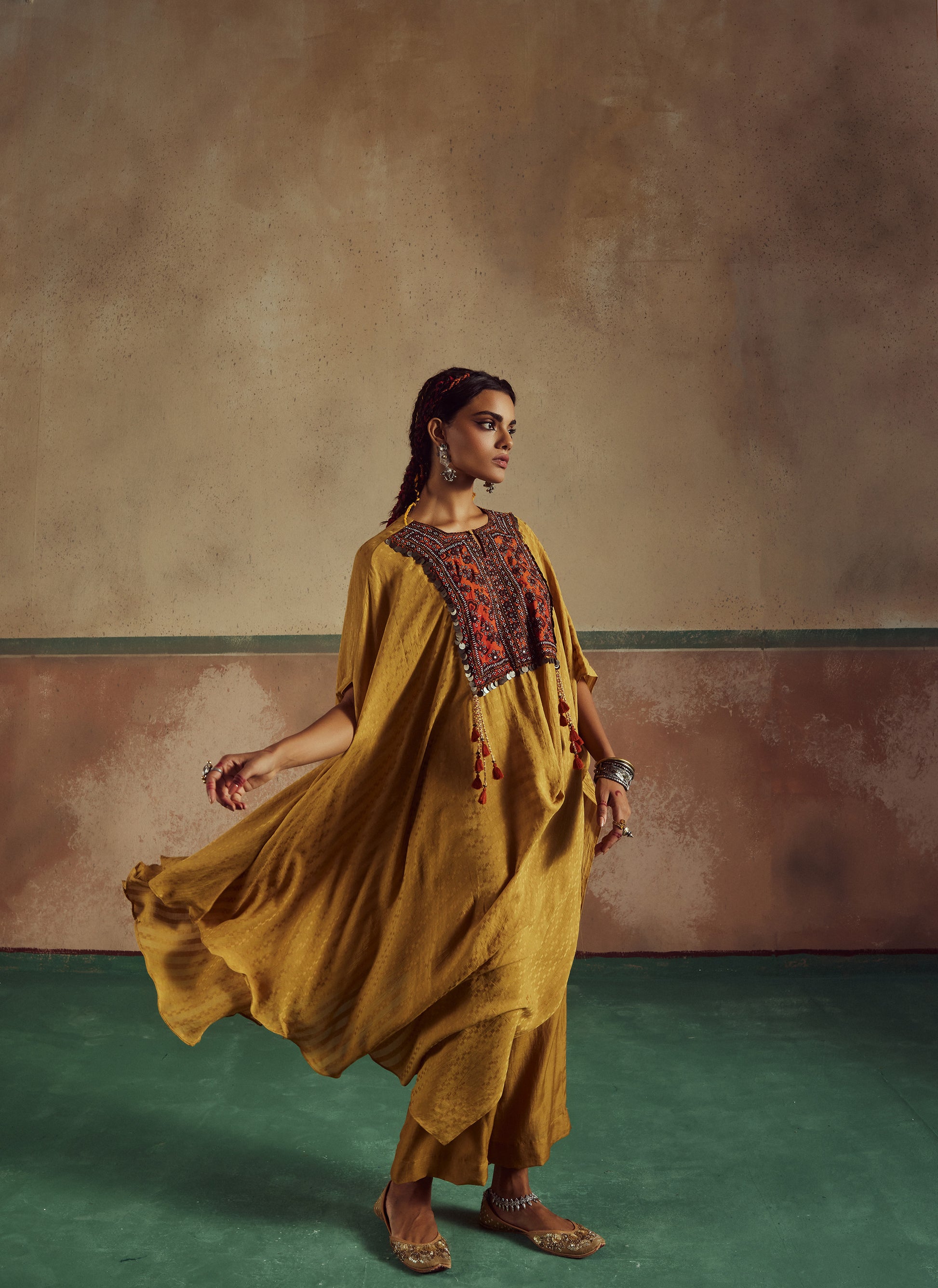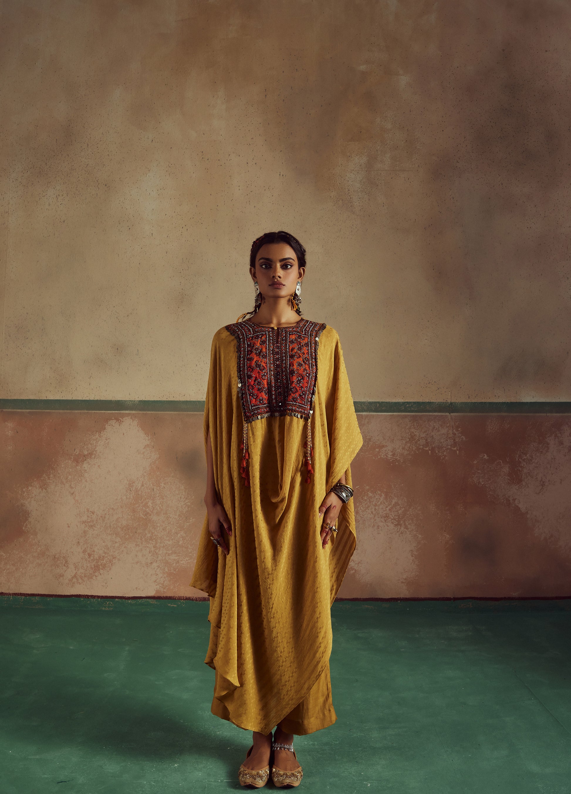 feturing kesari mustard assyemtrical cowl cape which is adnorned by a tribal boho patch work. It has been paired up with pants.