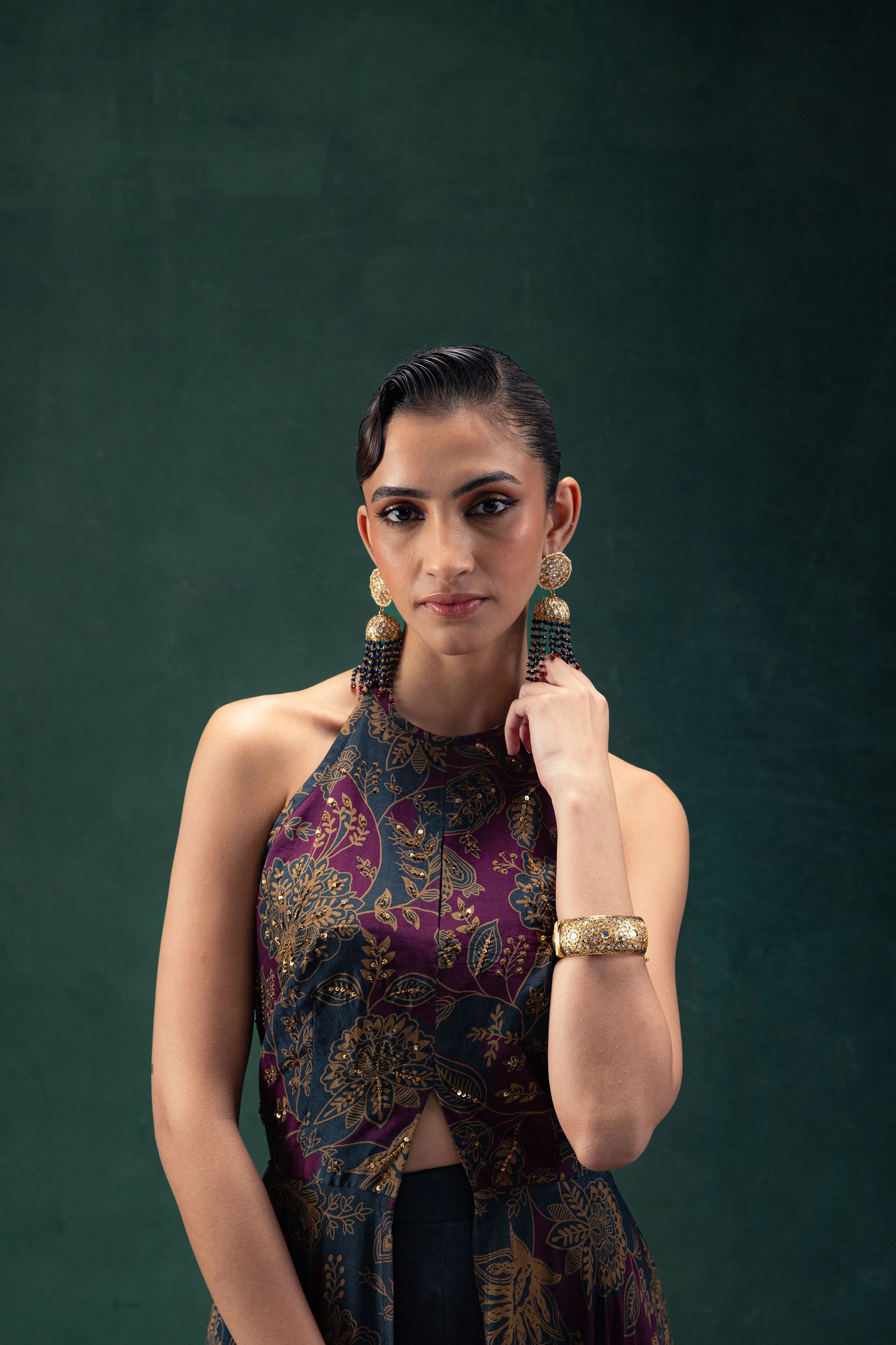 Purple and Blue Floral Silk Tunic Set with Gold HandworkThe Laila Set features a halter neck silk tunic with an abstract floral print in purple and blue, enhanced with gold handwork on the bodice. A center slit adds movement, while raw silk blue straight pants complete the look.Product Type: Two-Piece SetPattern: Abstract Floral Print with Hand EmbellishmentsLength: Tunic – Floor-Length | Pants – Full-LengthClosure: Slip-OnLining: Fully Lined