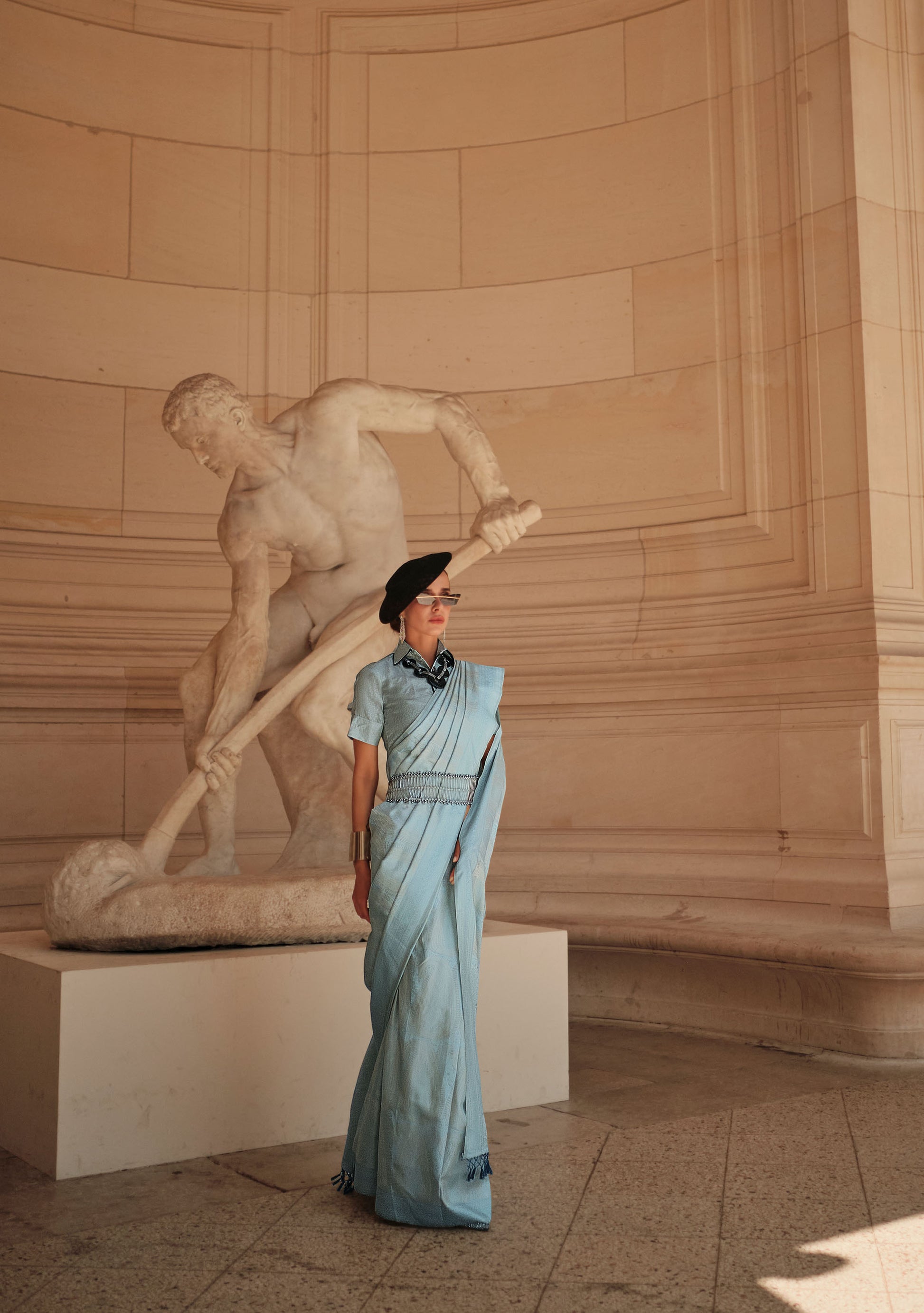 Does your wardrobe need more versatility? Then, check out this. Let your skin feel the refreshing touch as you adorn this superior-quality lightweight Saree to match the overall modest design.