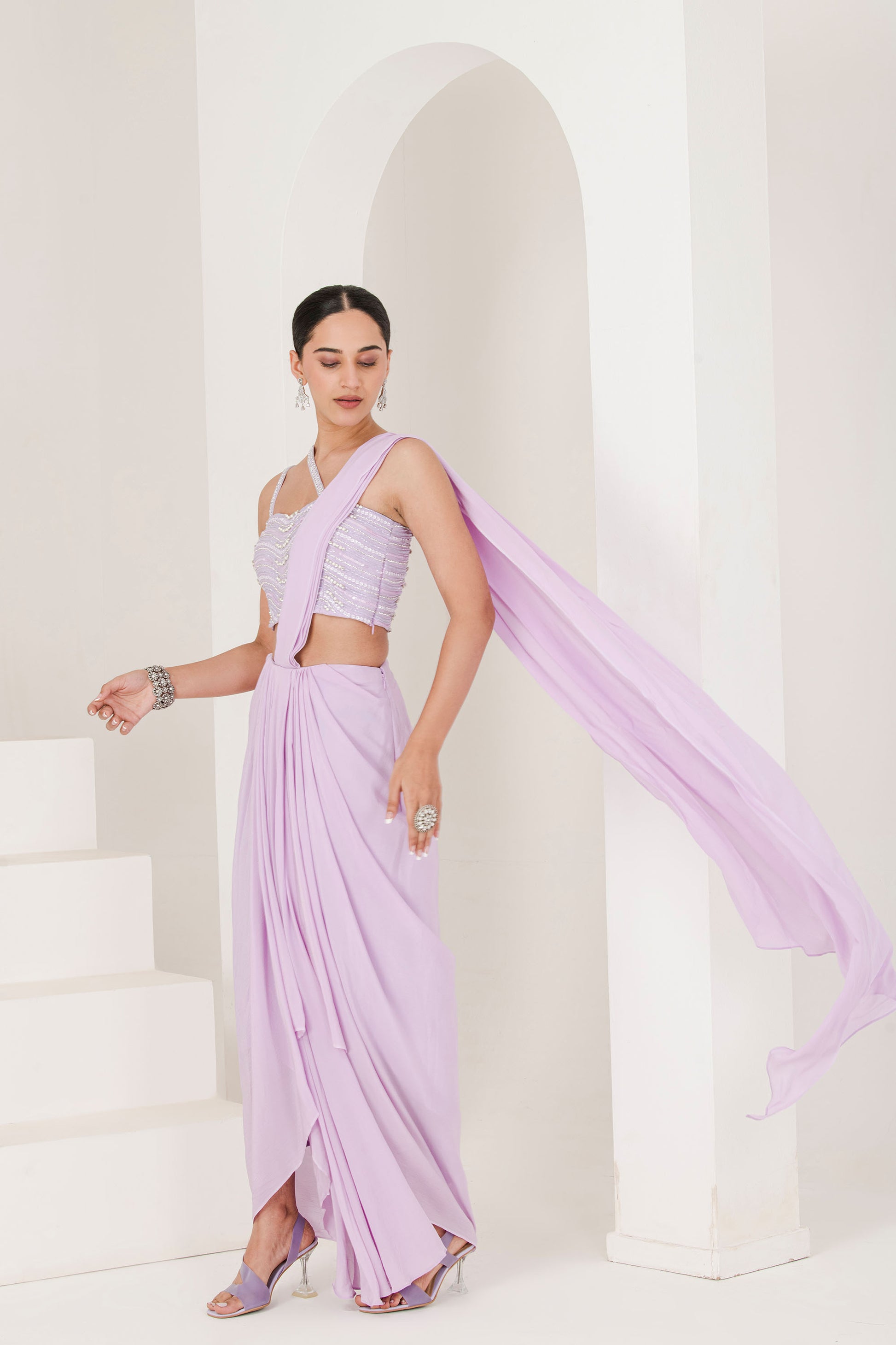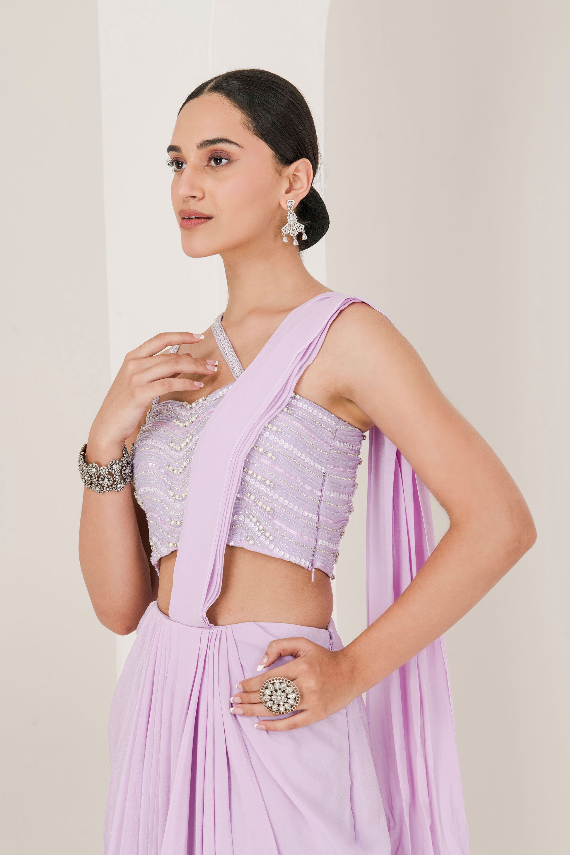 Lilac hand embroidered pre stitched saree