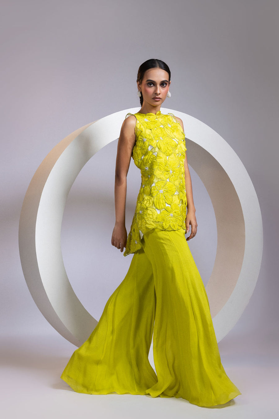 A three-piece coord set in chartreuse yellow, featuring a white inner layer and a statement cutwork top adorned with oversized 3D organza florals. Each bloom is finished with pearl clusters and fine beadwork for a soft, textured sparkle. Paired with wide-leg palazzo pants, the silhouette is crisp yet playful. A refreshing pick for daytime festivities and summer celebrations.