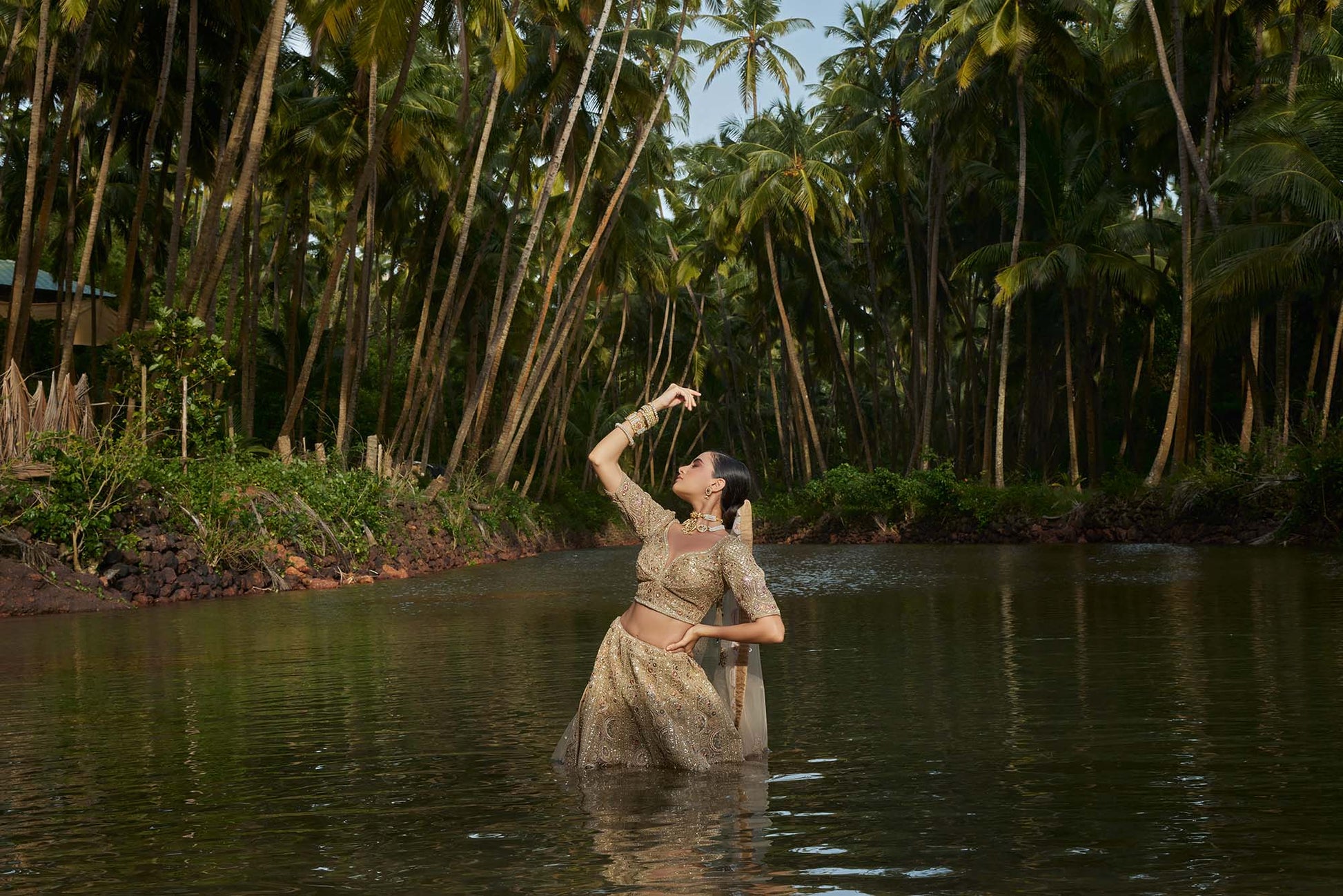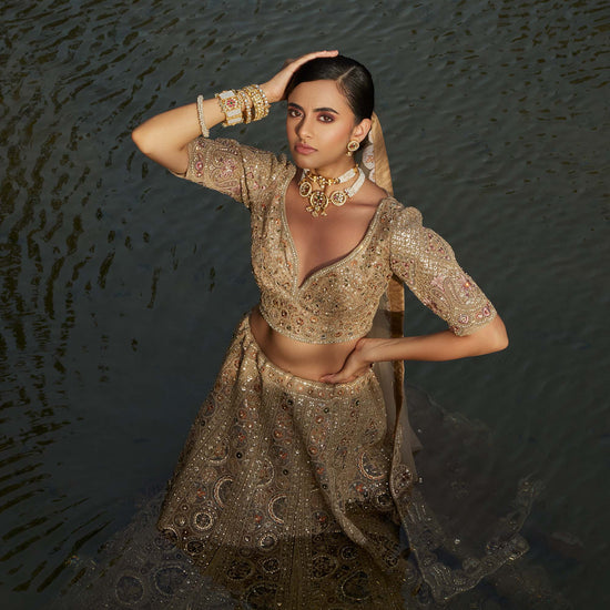 Mahavir Machine Embroidered Net Light Golden Bridal lehenga