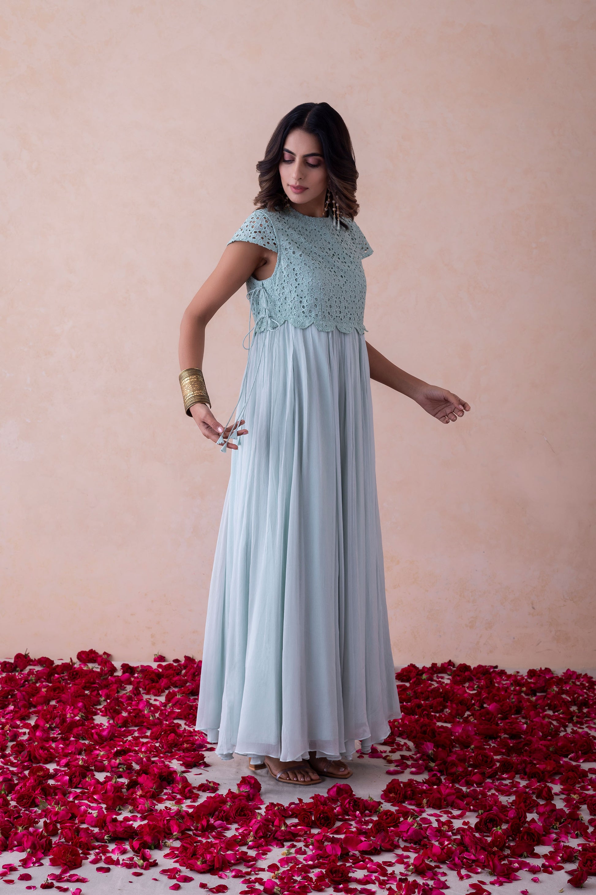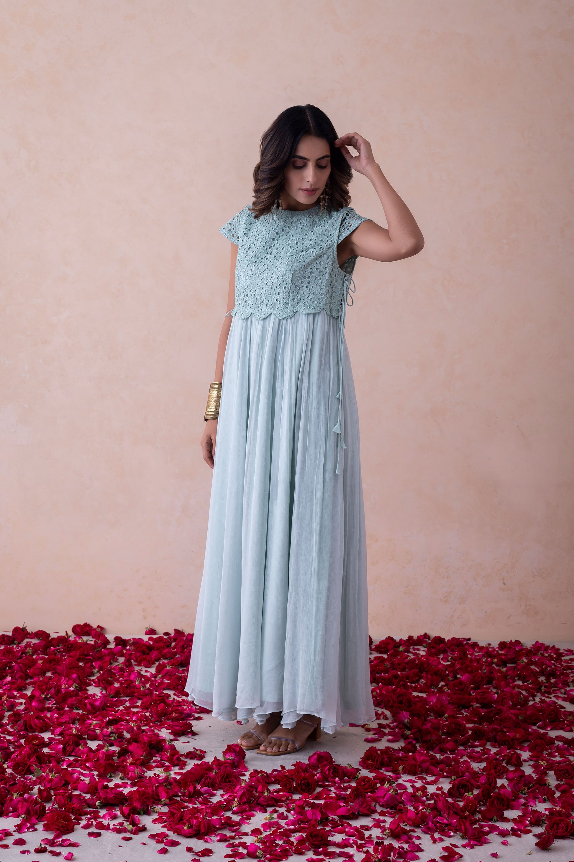 Organza and Chinnon Gown with Schiffli Embroidery and Attachable SleevesThis elegant gown features a Schiffli-embroidered bodice crafted in organza and chinnon. Designed with attachable organza sleeves for versatile styling and lined with soft shantoon for added comfort.Product Type: DressPattern: Schiffli EmbroideryLength: Floor-LengthClosure: Side ZipLining: Fully Lined with Shantoonachable organza sleeves provide versatility, allowing you to style it as per the occasion. Lined with soft shantoon, the dress offers comfort along with a regal silhouette. A dreamy ensemble designed for timeless beauty