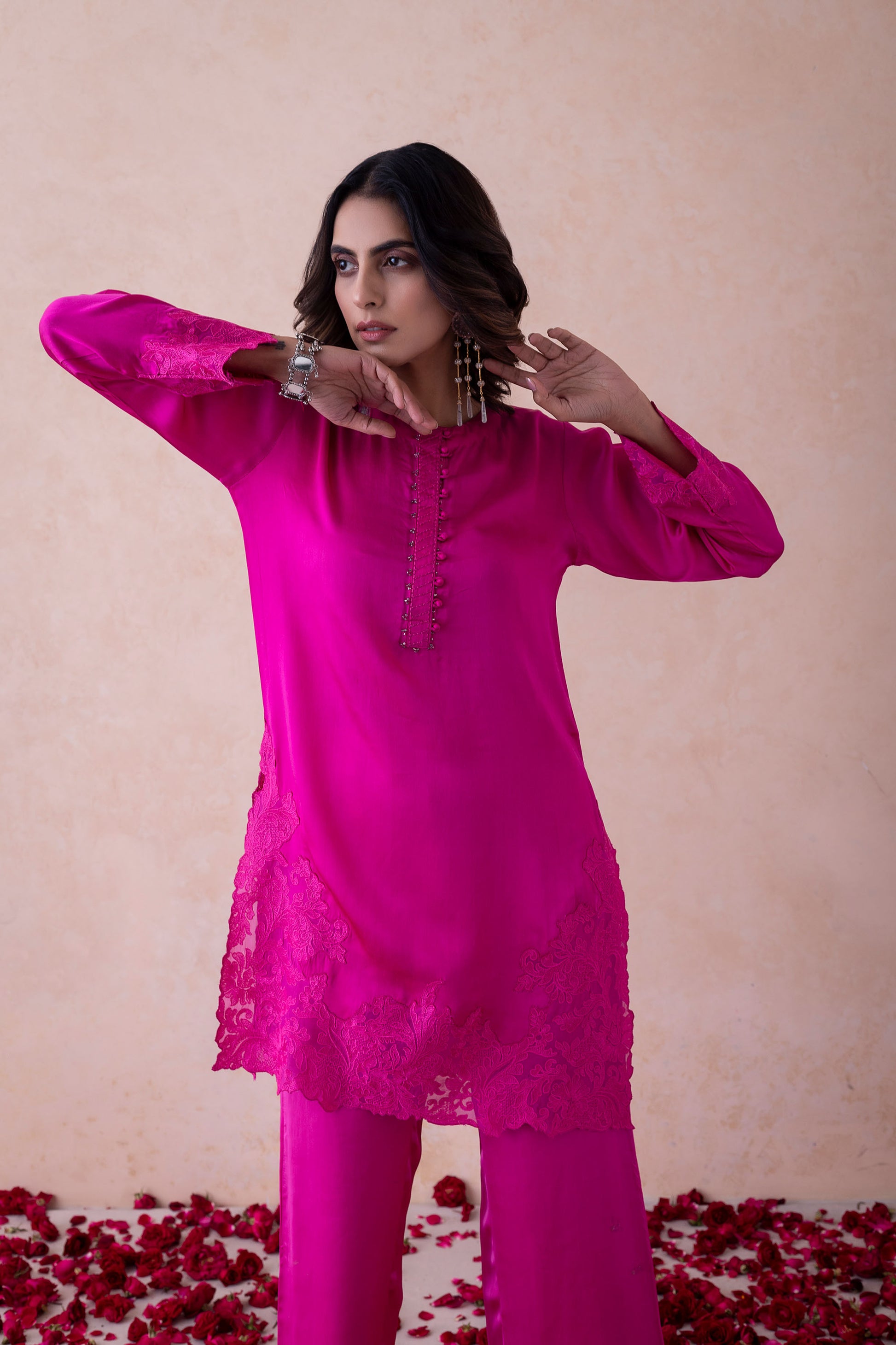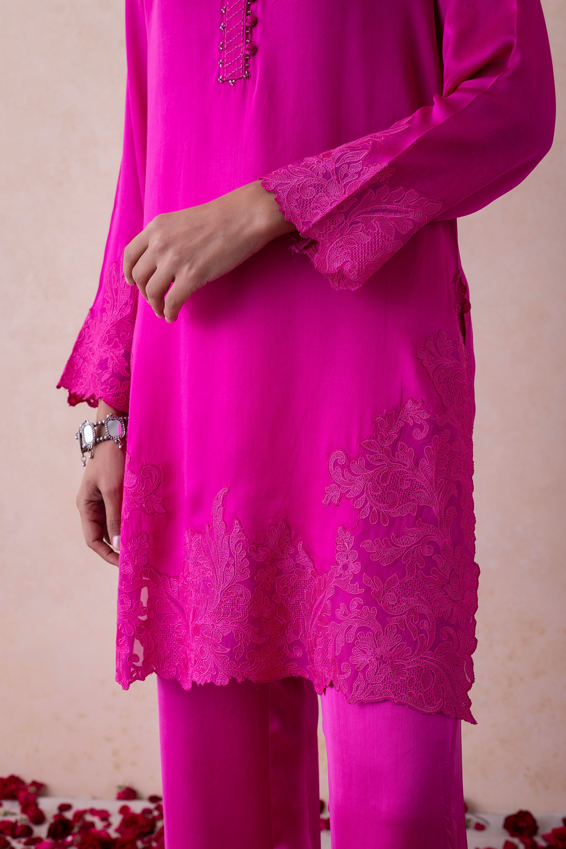 Hot Pink Satin Kurta Co-ord Set with Floral Organza EmbroideryThis vibrant co-ord set features a short full-sleeves satin kurta with embellished buttons and floral organza embroidery at the hem. Paired with matching hot pink straight pants for a bold yet comfortable look.Product Type: Two-Piece Co-ord SetPattern: Solid with Embellished Details and Floral EmbroideryLength: Kurta – Short | Pants – Full-LengthClosure: Slip-OnLining: Fully Lined