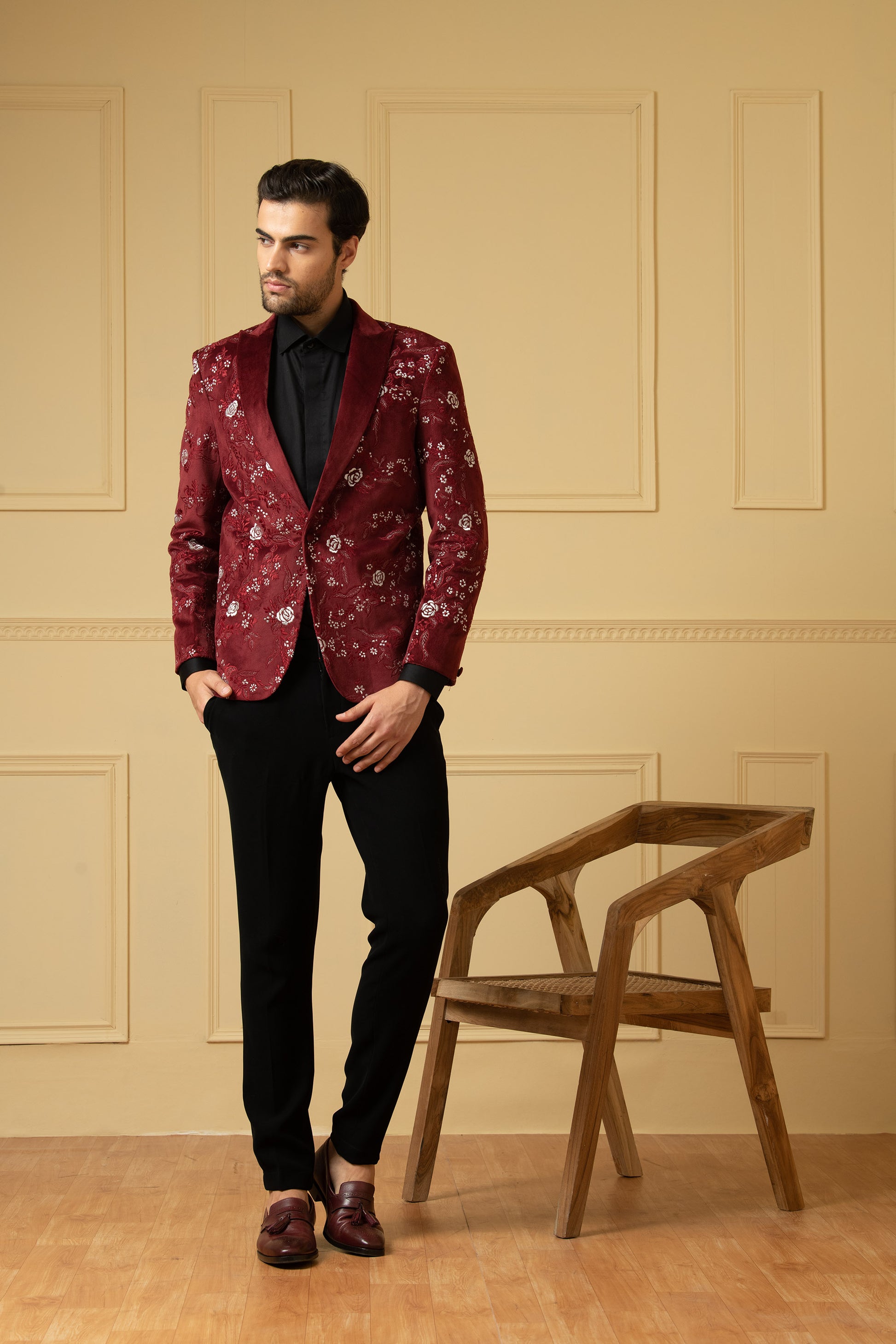 Men's Blazer in a rich maroon hue. This blazer is a perfect blend of style and sophistication, featuring exquisite machine embroidery in silver and self-floral patterns. The notch collar adds a touch of elegance to the overall design. Crafted from high-quality imported suiting fabric, this blazer ensures a comfortable fit and impeccable style.