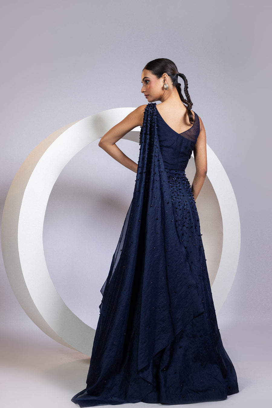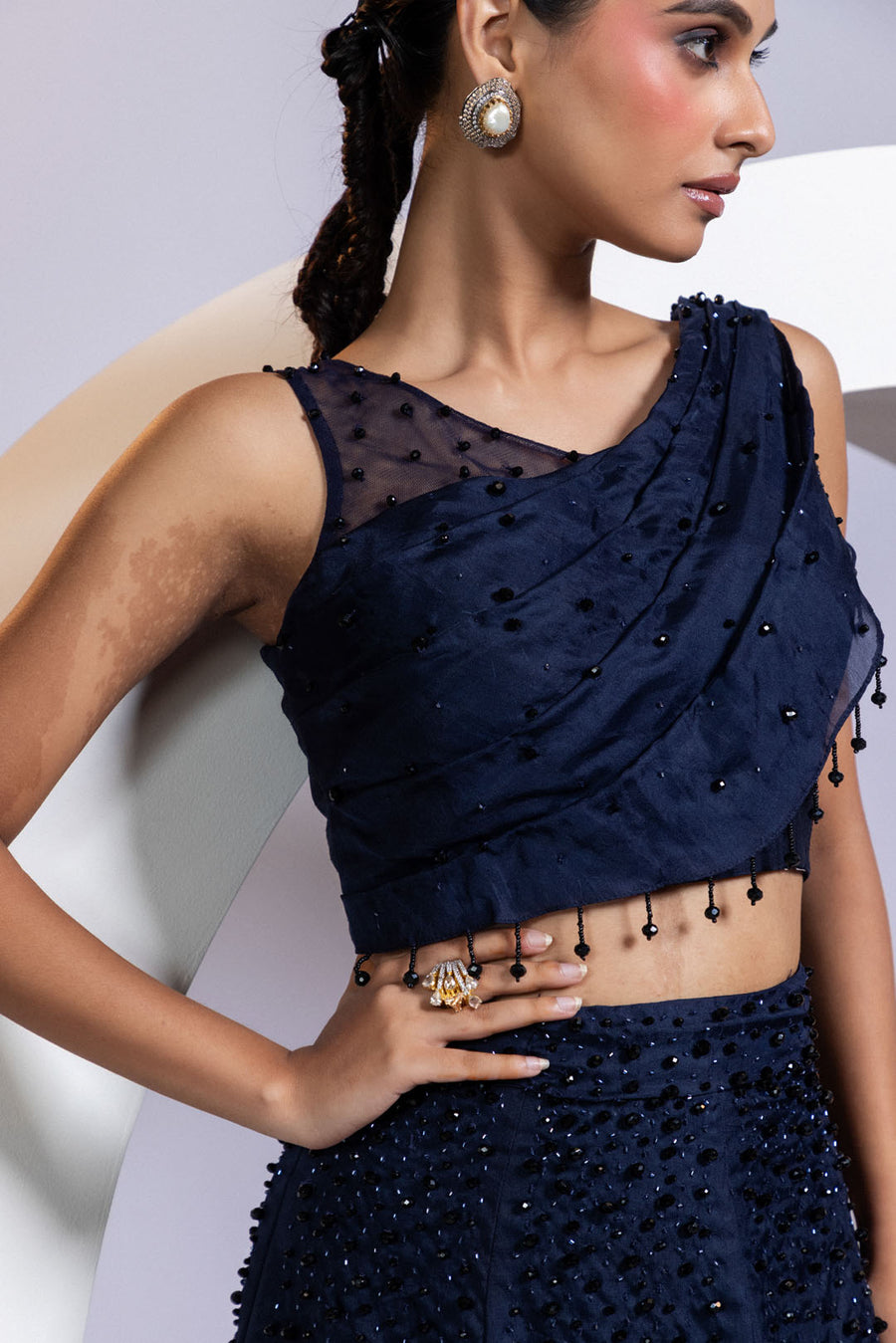 A navy blue drape lehenga set featuring a one-shoulder net strap blouse with structured pleating and an attached veil-style dupatta. The blouse and flared skirt are hand-embellished with scattered black crystals, creating a soft, starry shimmer. Fluid yet sculpted, the silhouette is equal parts drama and grace. Perfect for cocktail weddings, receptions, and elegant evening affairs.