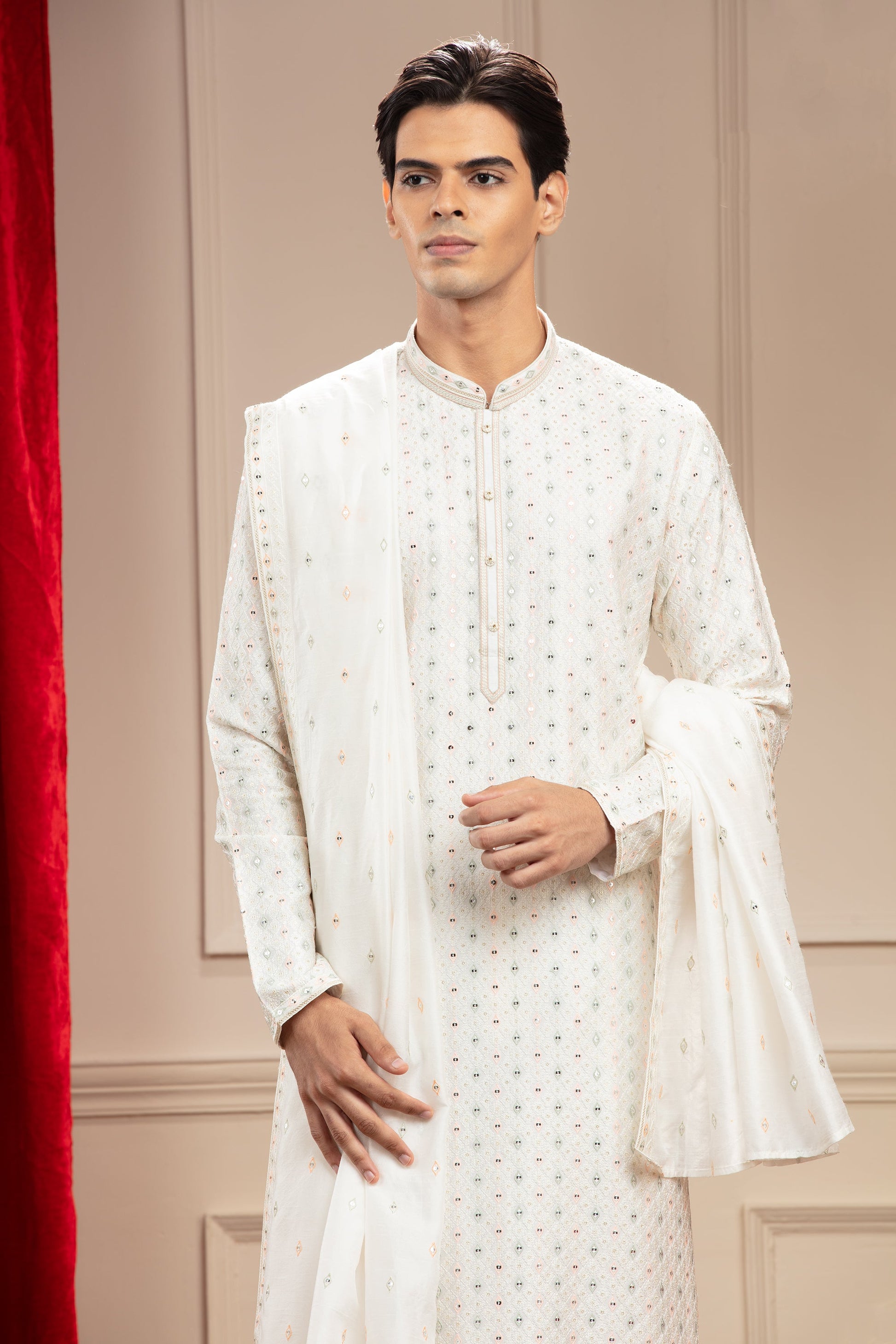 A rare milky white kurta set with dupatta, made exquisitely using Banarasi Silk, and embroidered with Resham & mirror work. Get your hands on it now!