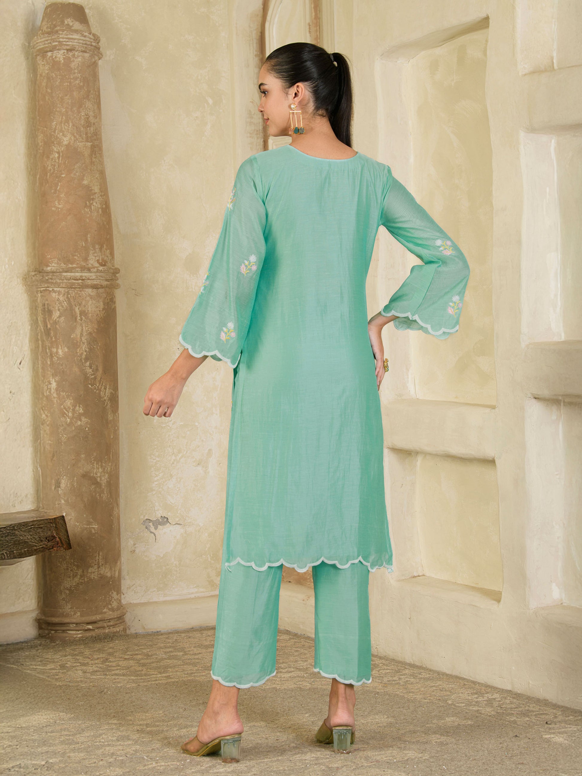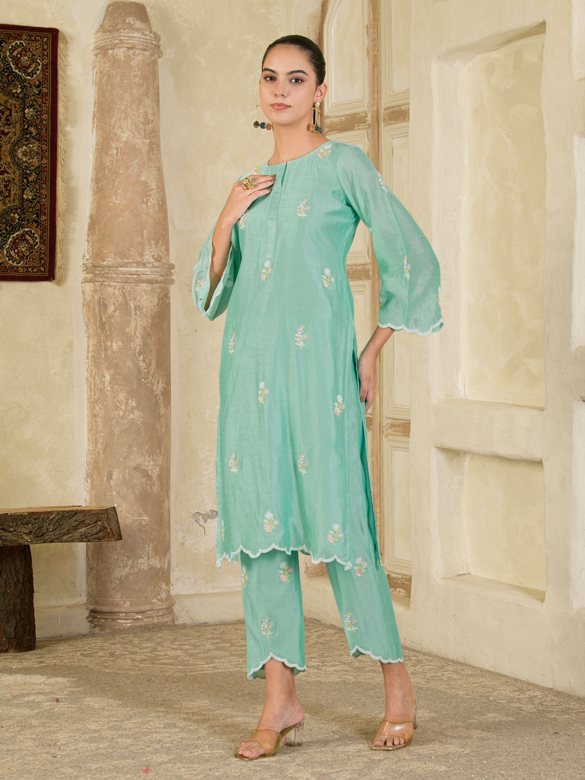 Mint Green Hand Embroidered Chanderi Kurta and Pants ( Set of 2 )