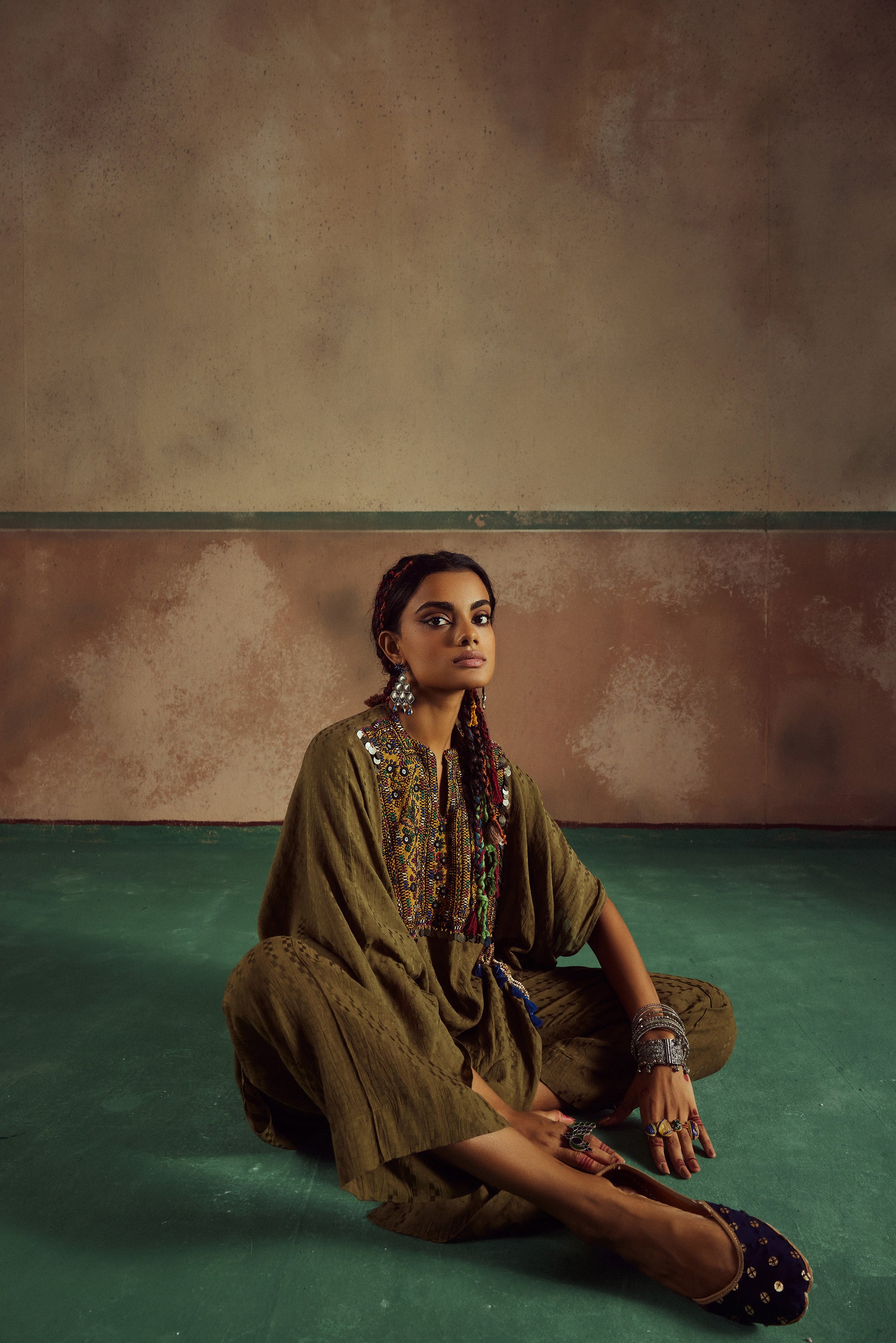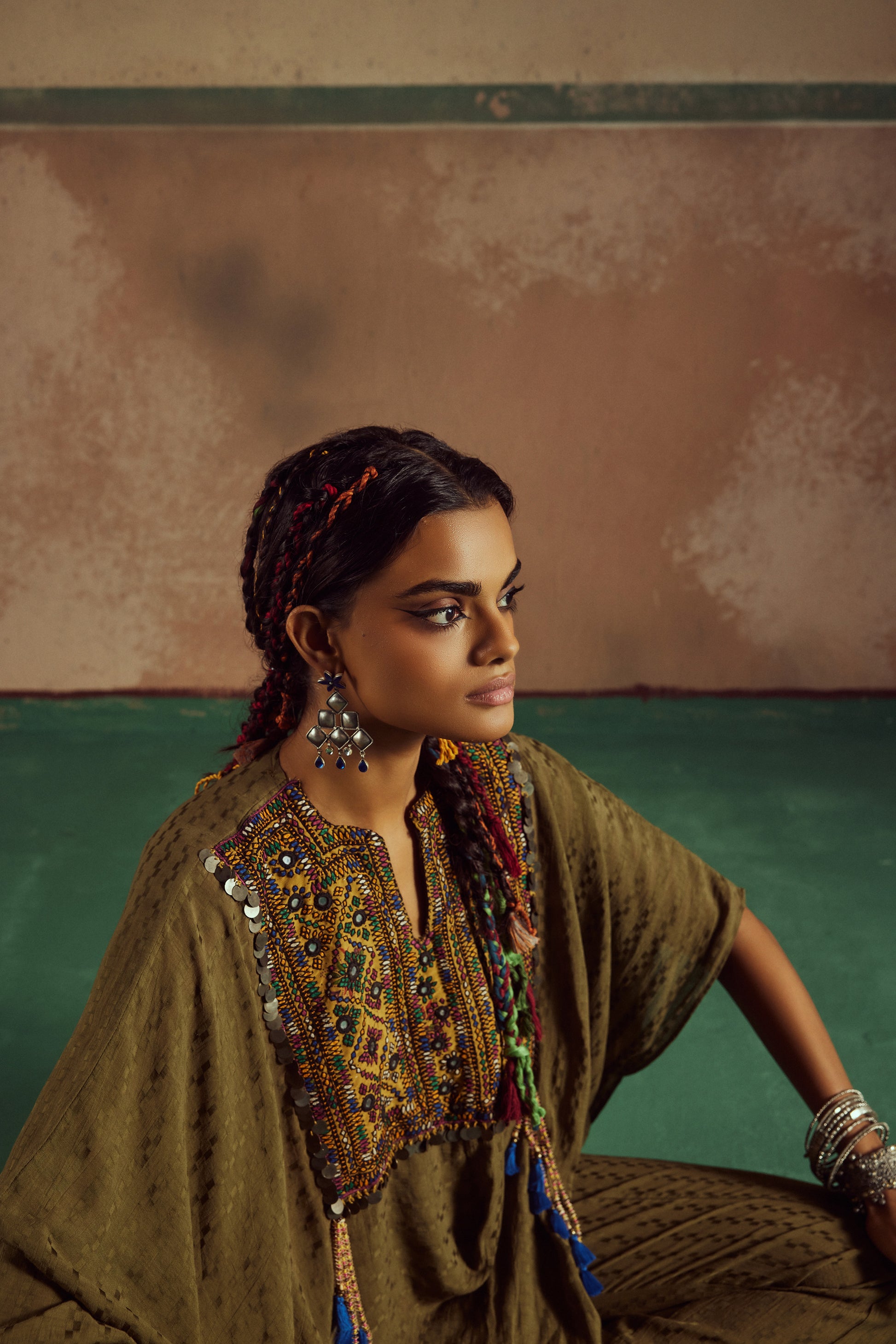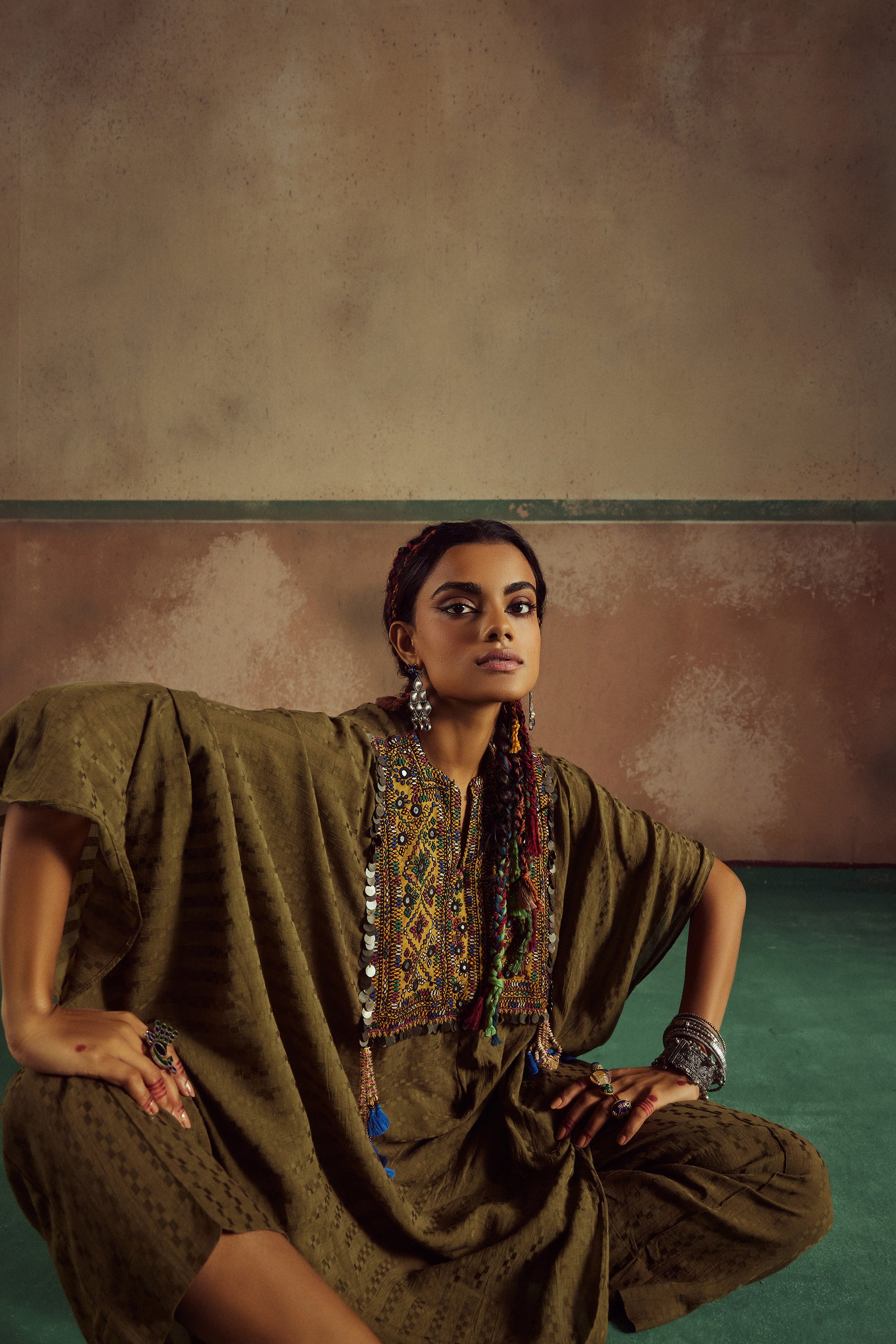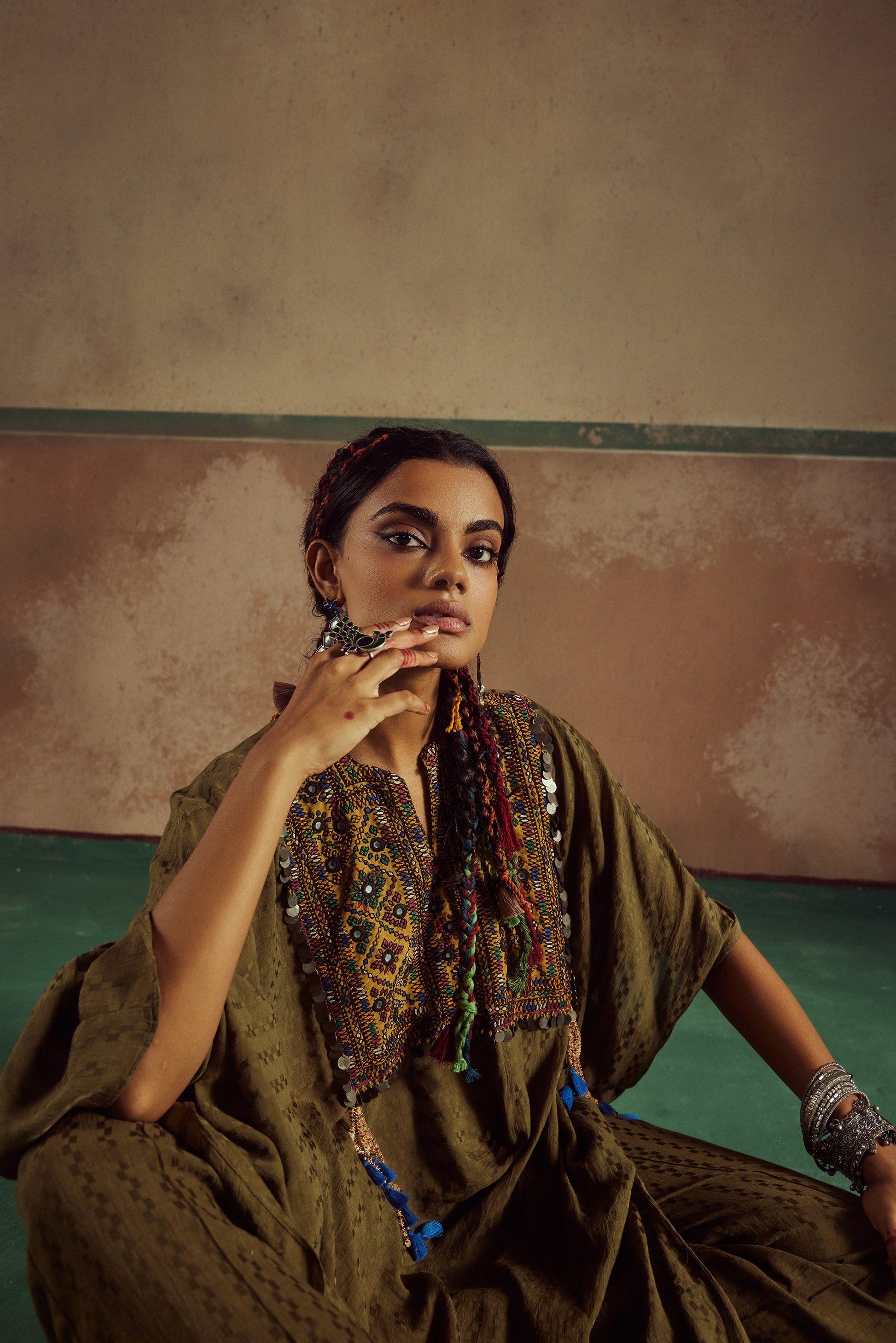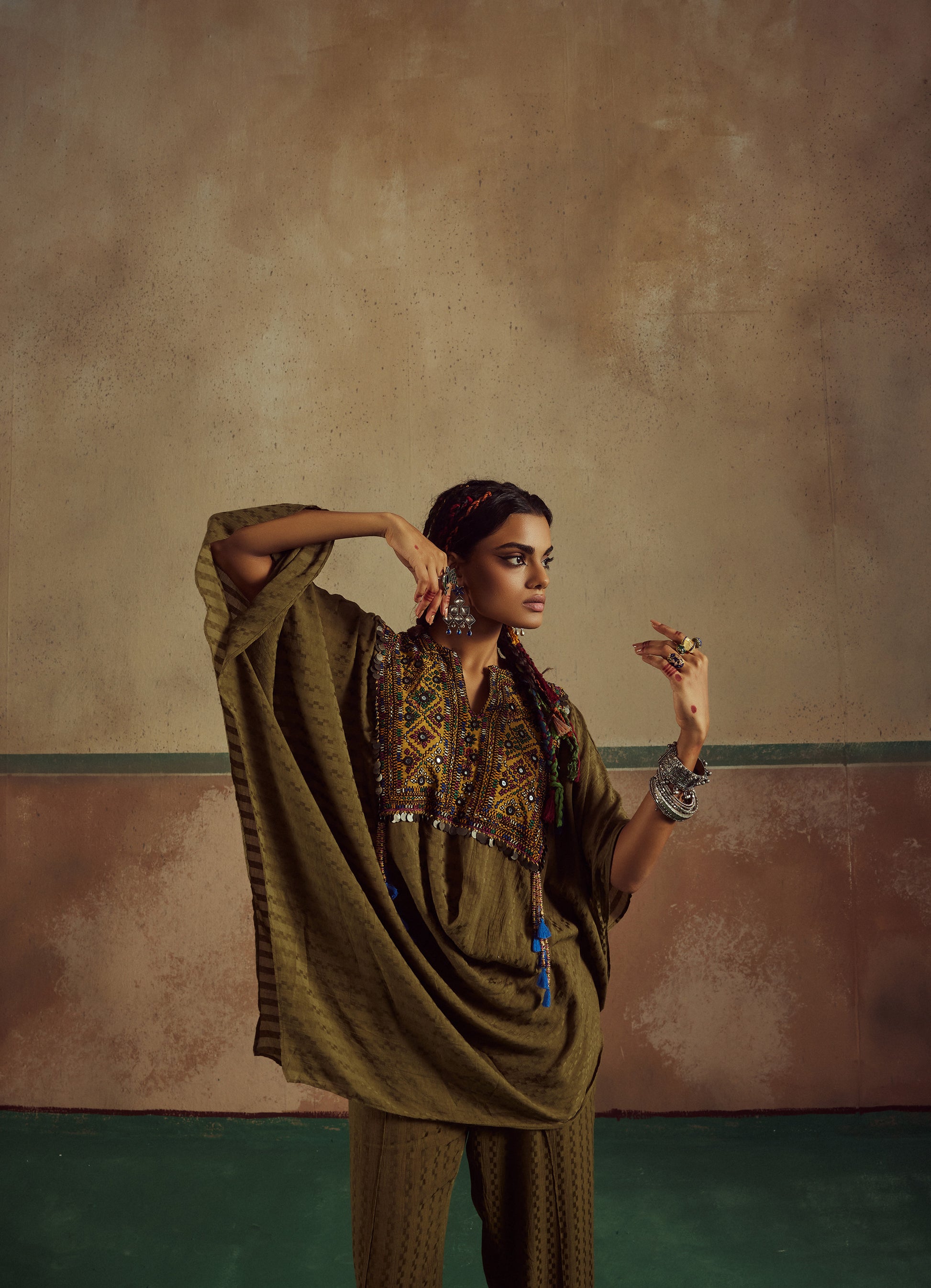 feturing moss green assyemtrical cowl cape which is adnorned by a tribal boho patch work. It has been paired up with pants.