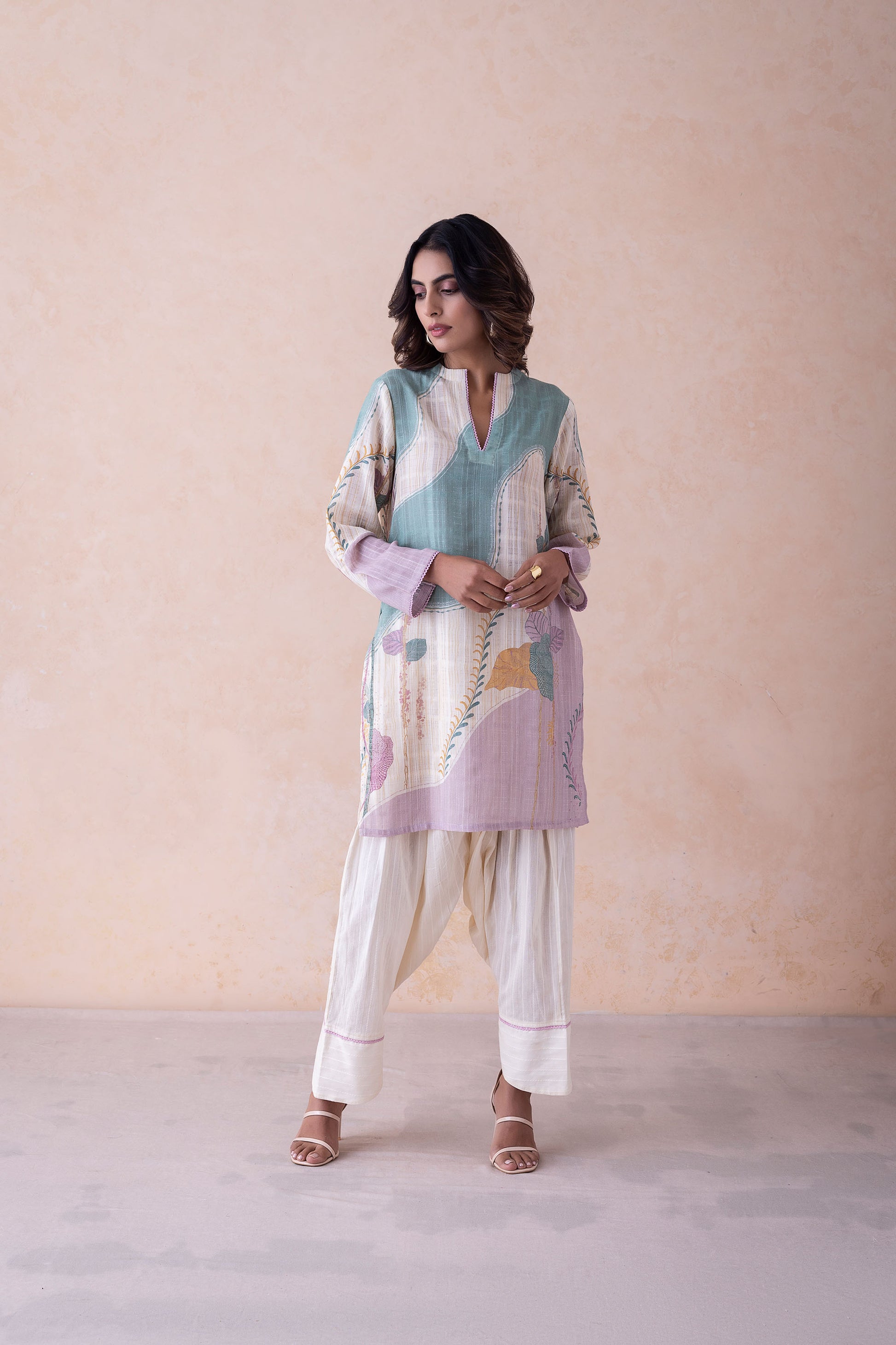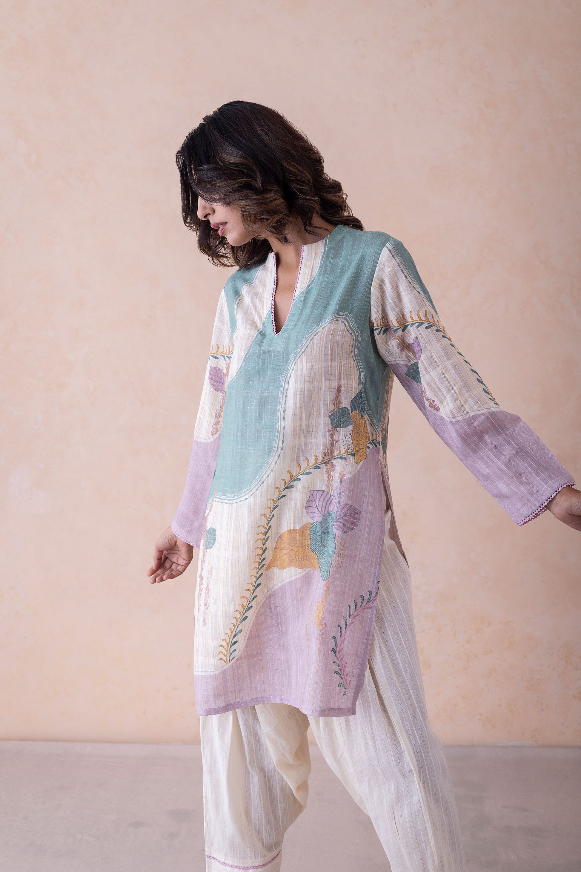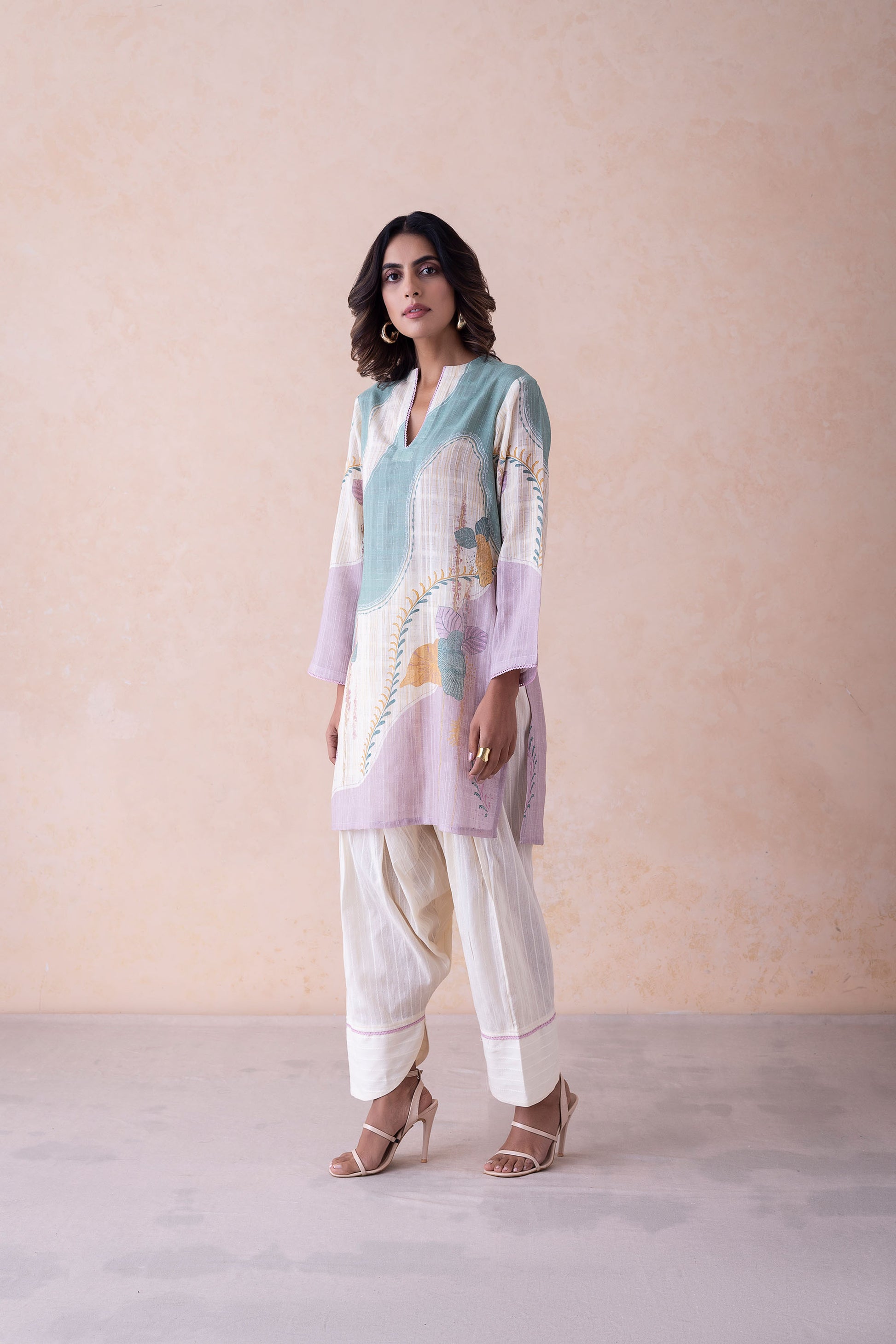 Pastel Cotton Checks Kurta Set with Tassel DetailingThis Indo-Western kurta set features a pastel cotton checks top with playful tassel detailing. Paired with comfortable cotton bottoms and lined with cambric for a breathable, relaxed fit.Product Type: Two-Piece SetPattern: Pastel Checks with Tassel AccentsLength: Kurta – Knee-Length | Pants – Full-LengthClosure: Slip-OnLining: Fully Lined with Cambric