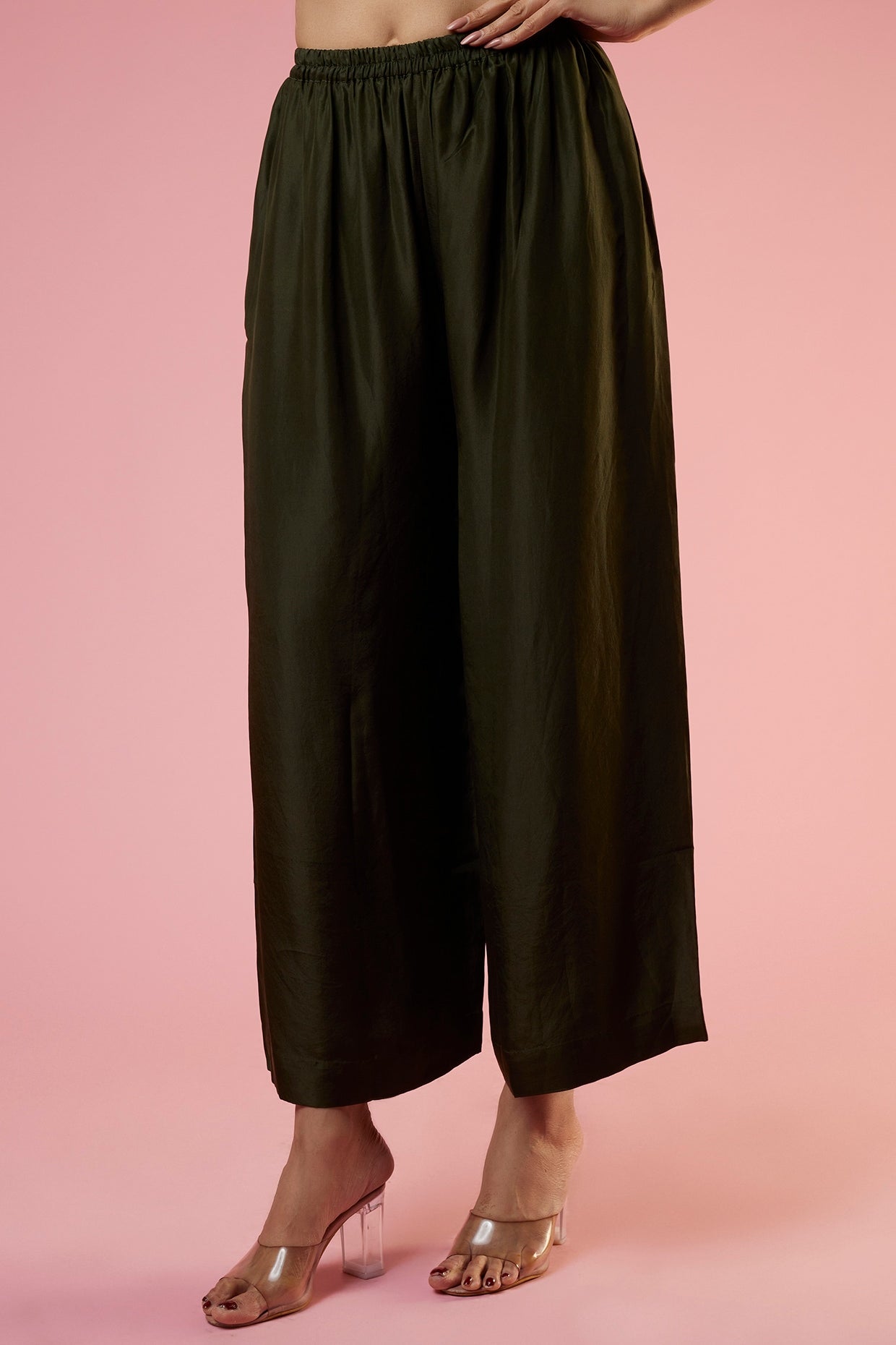 kaftan in pure silk base with print and thread hand embroidery. It is paired with matching printed palazzo.