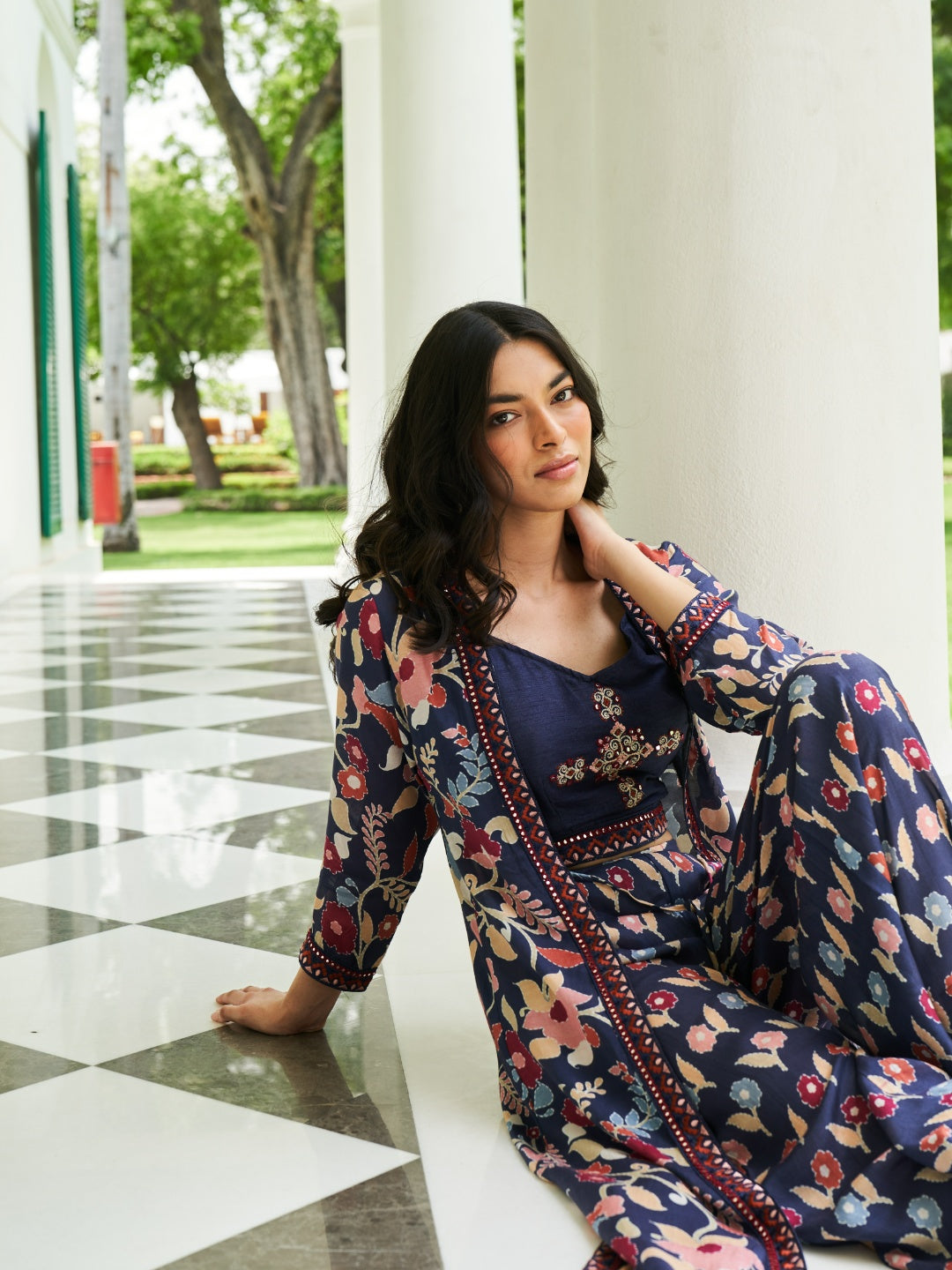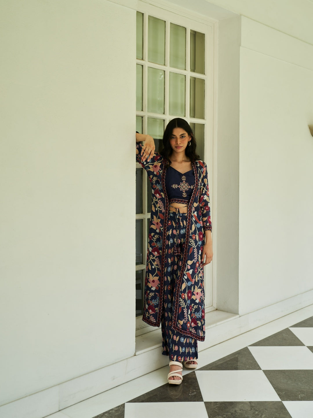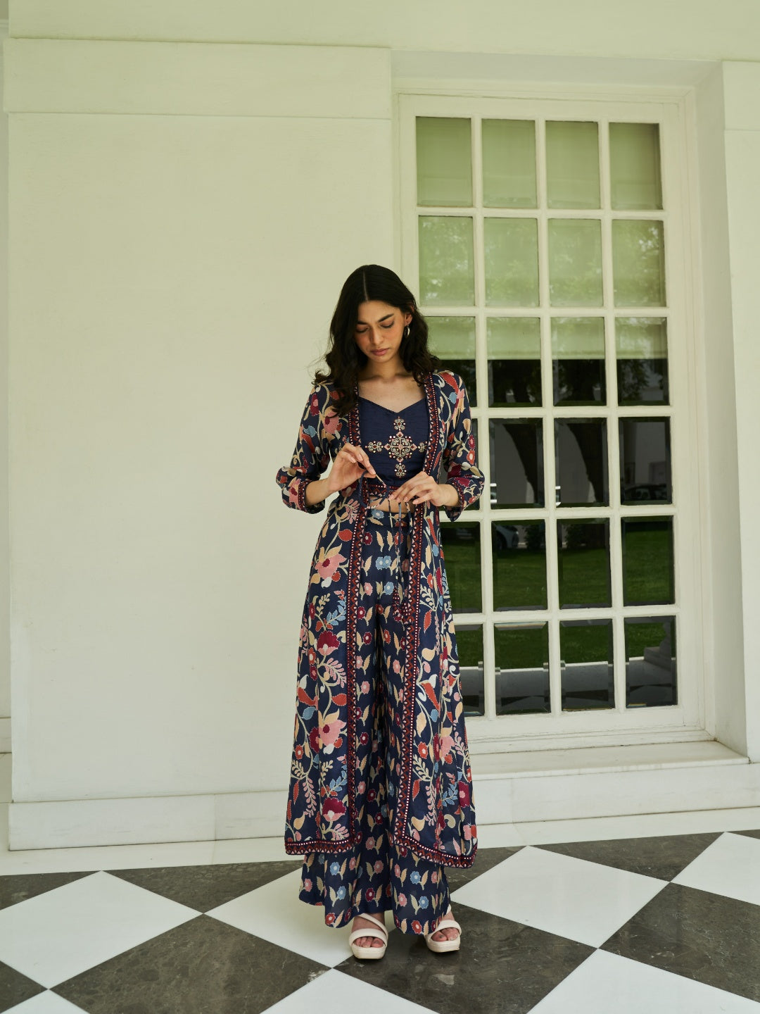 Navy Blue Digital Printed Viscose Satin With Hand Embroidery Co-ords Set With Long Shrug