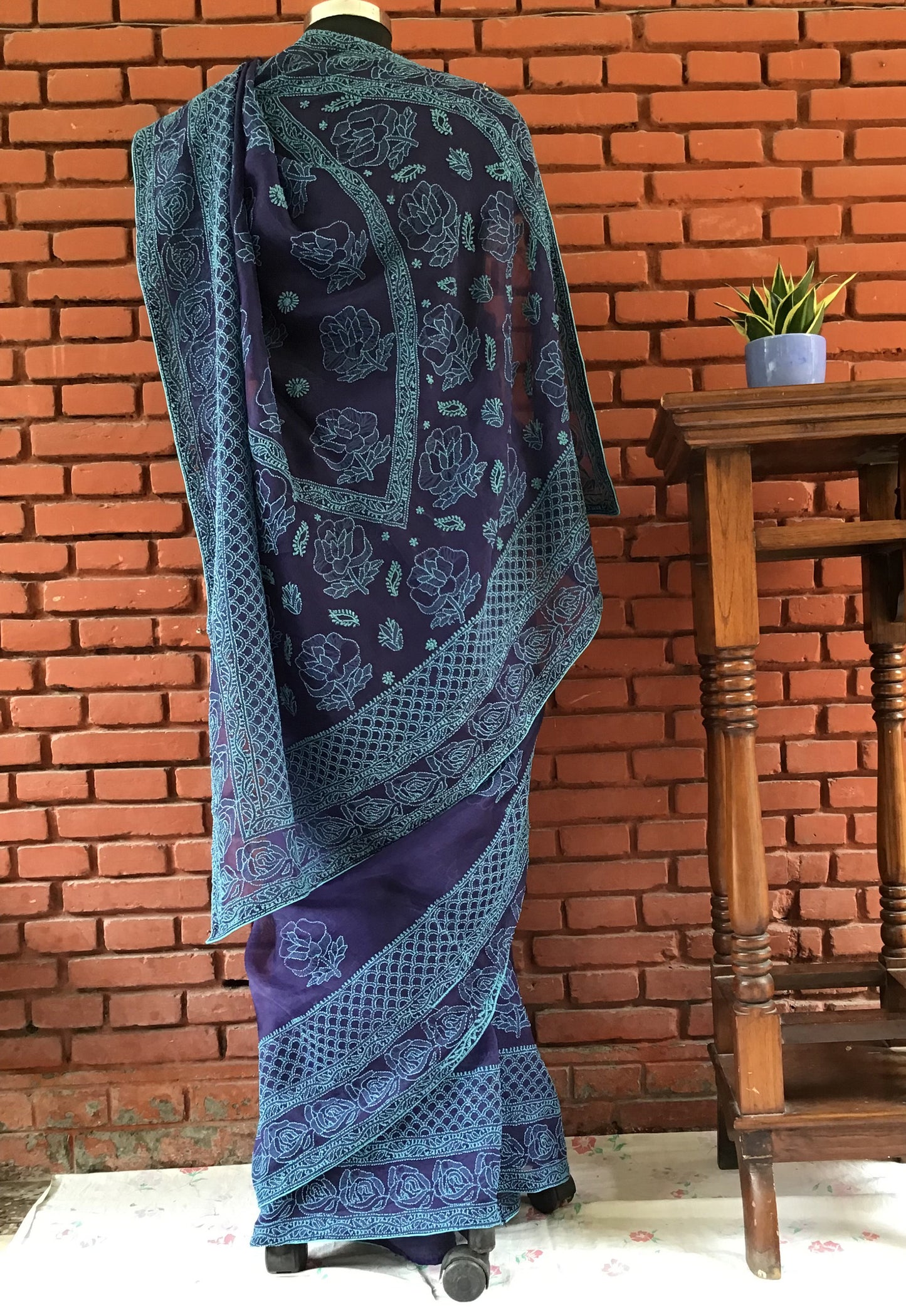 Navy Blue Pure Silk Organza Tepchi Pure Chikankari Saree