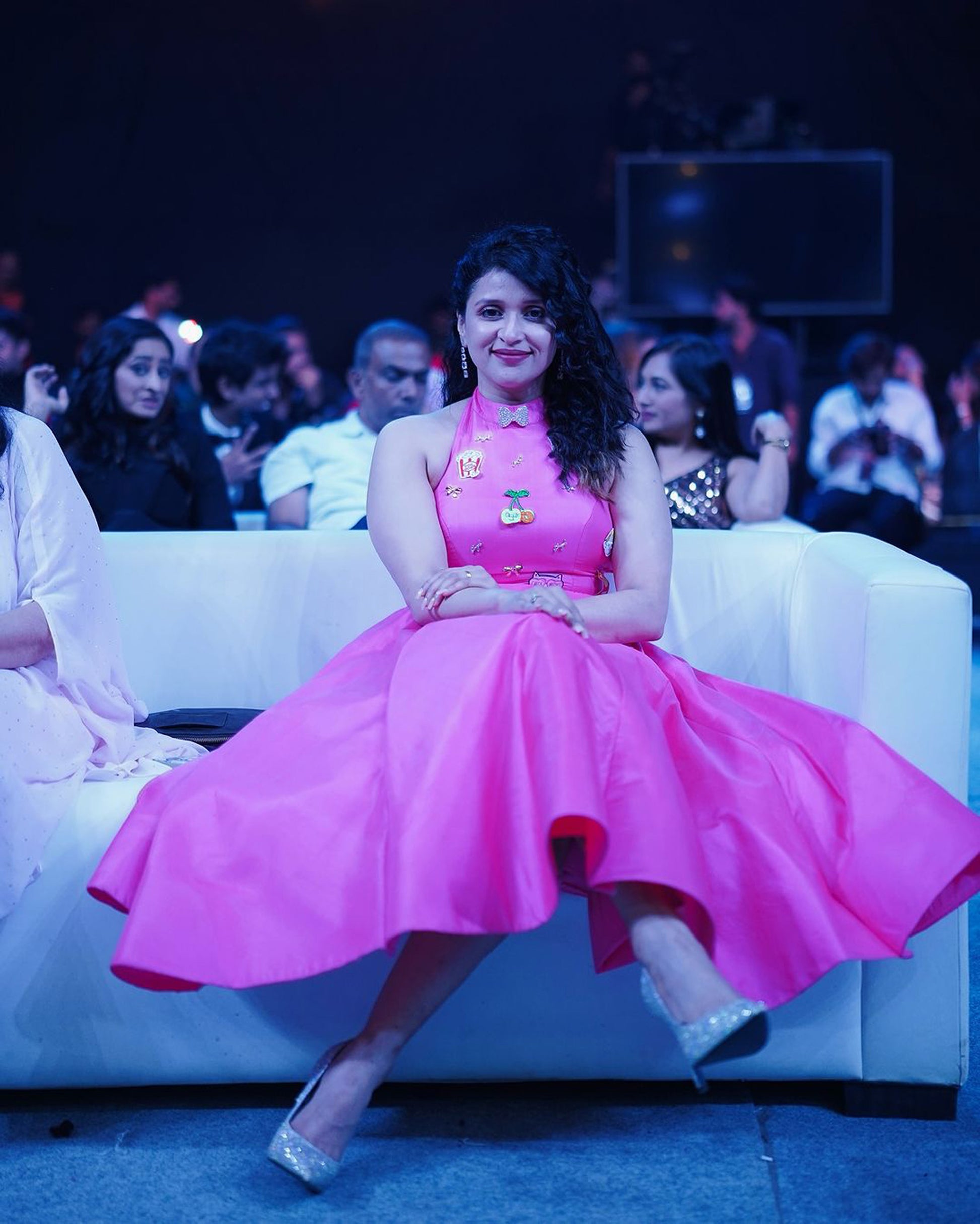 Custom couture crafted in refreshing neon pink, featuring cute and funky details, designed for the mesmerizing Mannara Chopra.