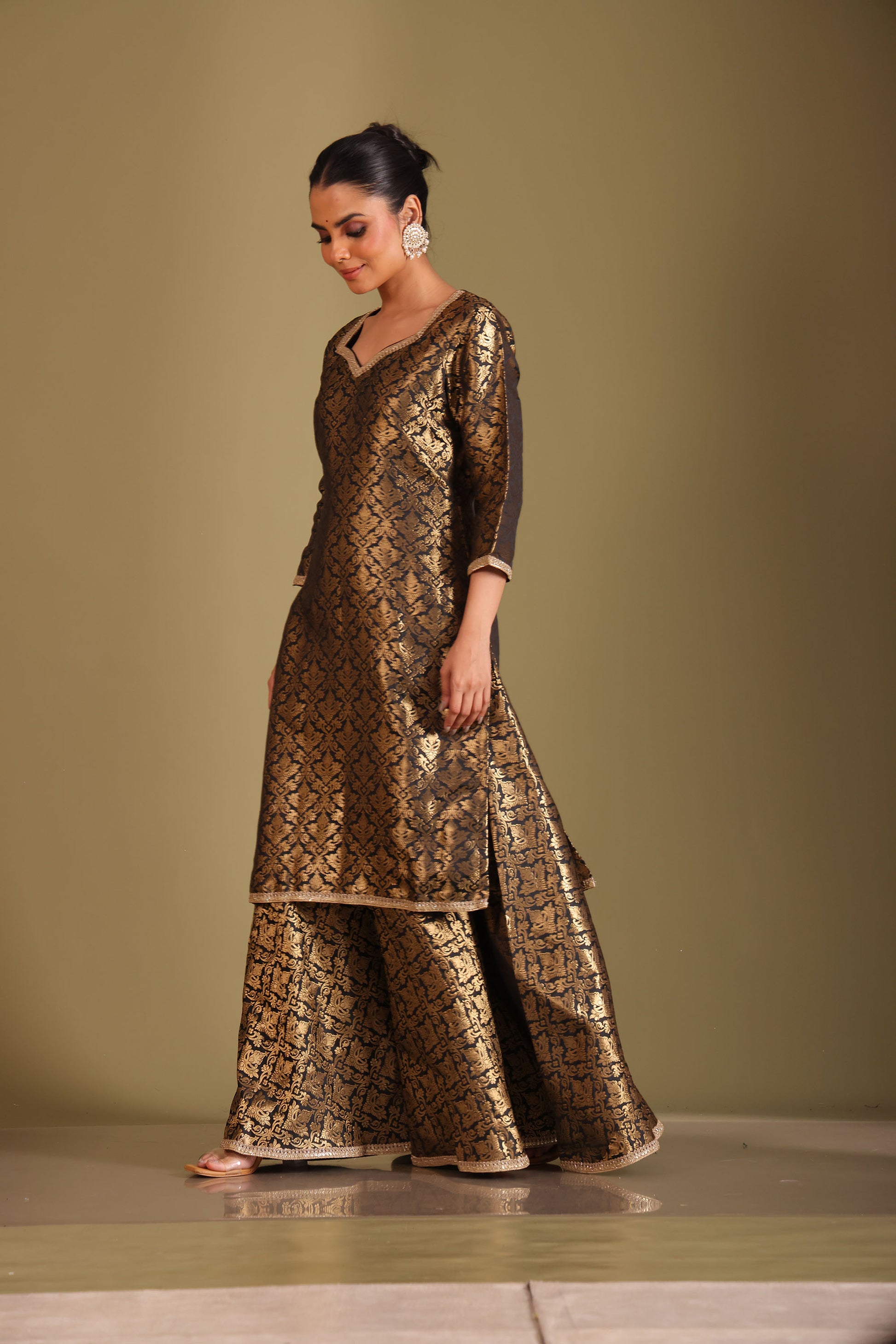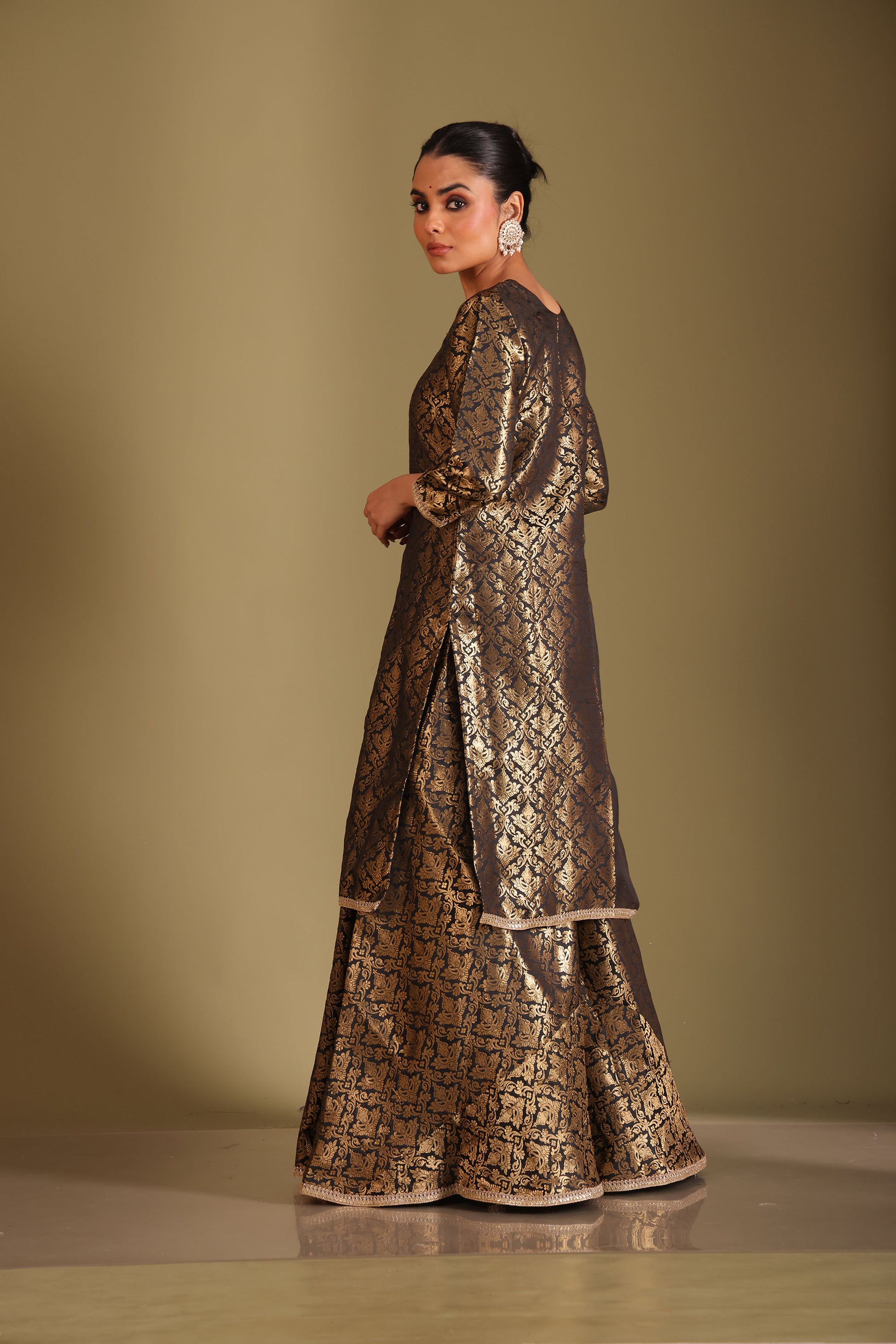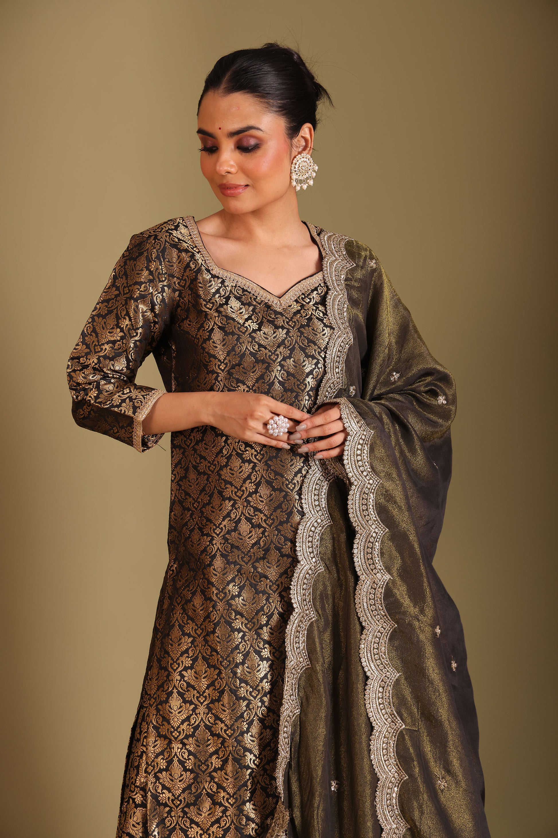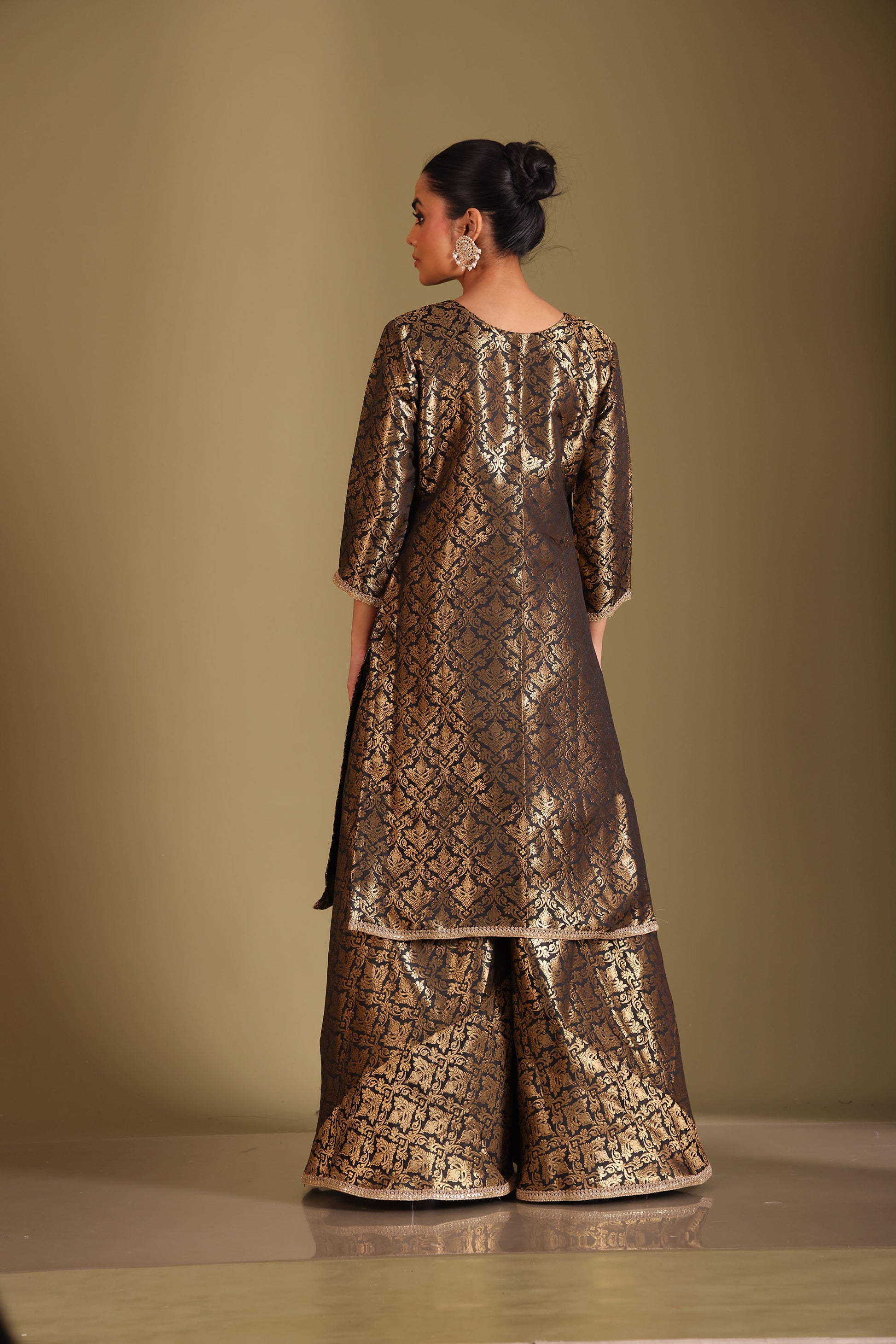 This three piece set includes Kurta, Sharara and Dupatta The Black Brocade silk kurta and pants are adorned with golden motifs, exuding a regal charm. The kurta features a flattering detailed neckline, detailing at the neck and sleeves cuffs. Paired with a embroidered scallop tissue silk dupatta highlighted with delicate hand-embellishments and border detailing, this outfit is perfect for festive gatherings or elegant evening occasions.