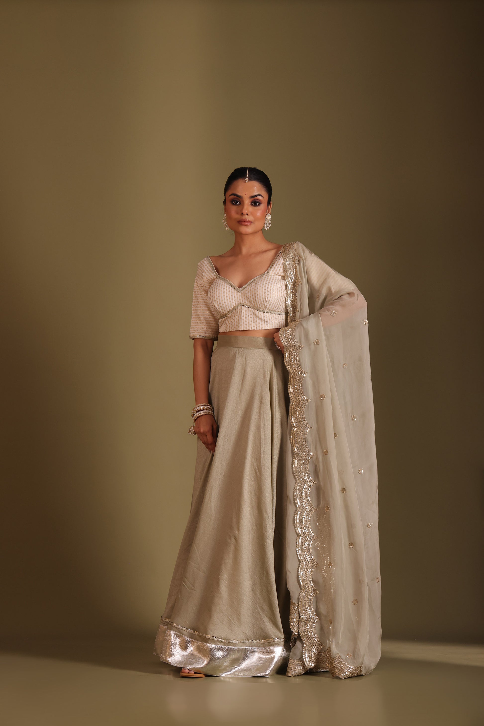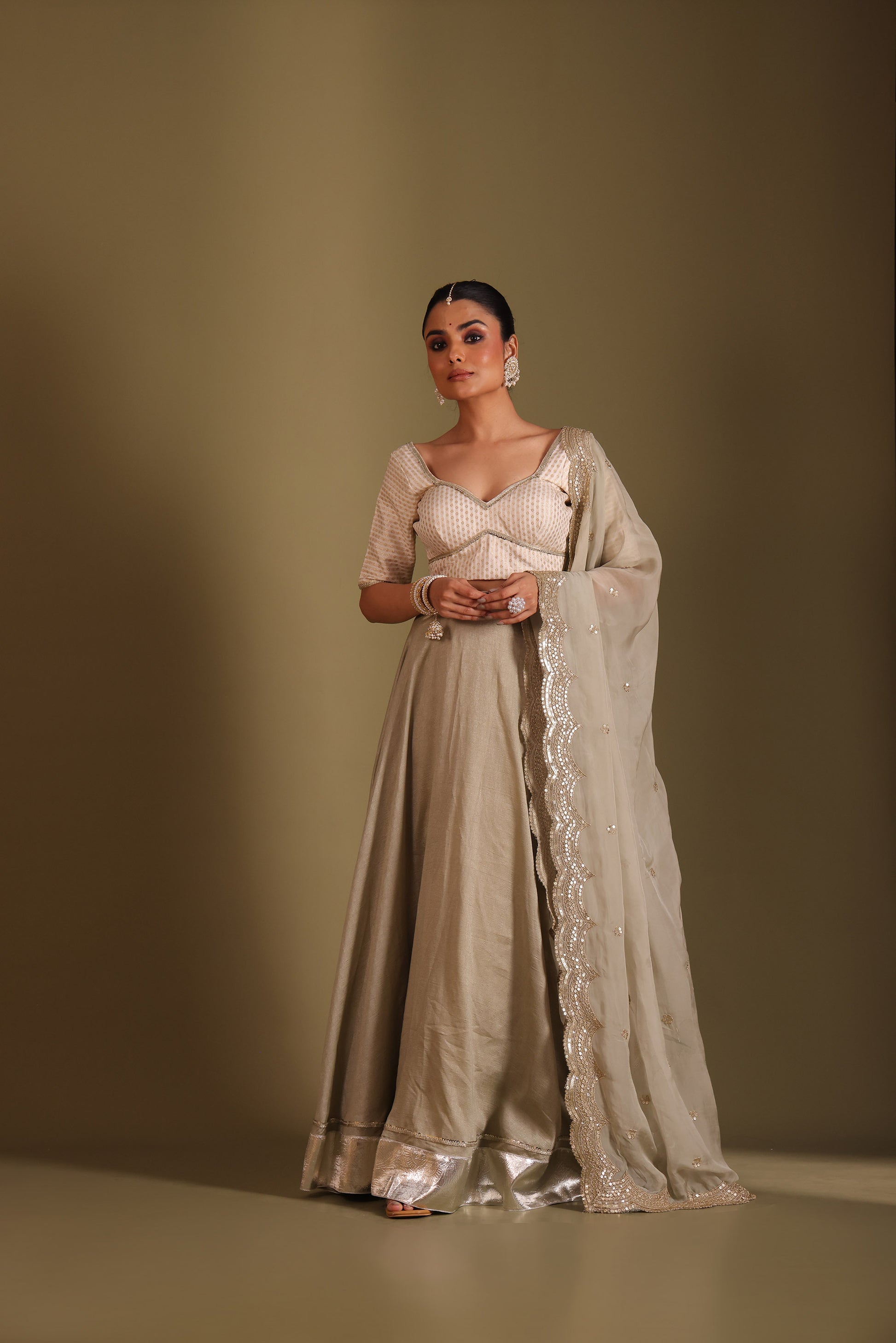 This three piece set includes Blouse, Lehenga and Dupatta Grace meets grandeur in this ethereal Ivory and sage lehenga set. The structured blouse features intricate work and a flattering sweetheart neckline with elbow-length sleeves. The silk lehenga flows in a rich flare with a gota border for added opulence. Completing the look is a sheer organza dupatta with delicate embroidery and scalloped sequin detailing along the edges, making it a perfect choice for intimate weddings, sangeet nights, or festive soirées.