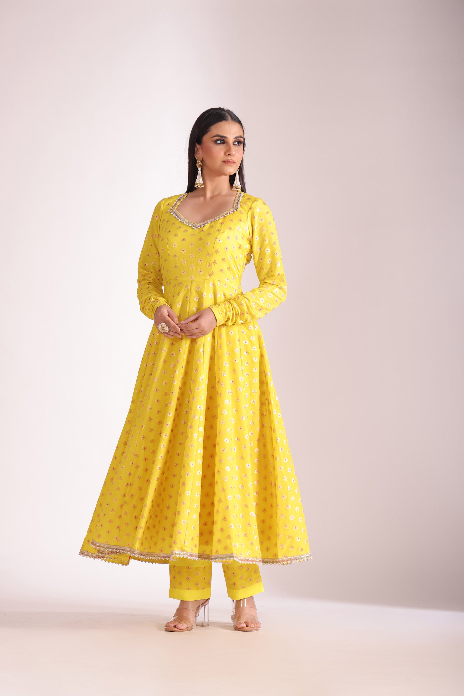 This three piece set includes Anarkali, Pant and dupatta This elegant ensemble features a yellow brocade silk Anarkali with classic churi sleeves and a flattering, flowy silhouette.It is paired with a plain yellow pant finished with a coordinated border at the hem for subtle detail. The look is completed with a contrast rani pink georgette dupatta, beautifully adorned with scalloped embroidered borders that add a rich and festive touch.