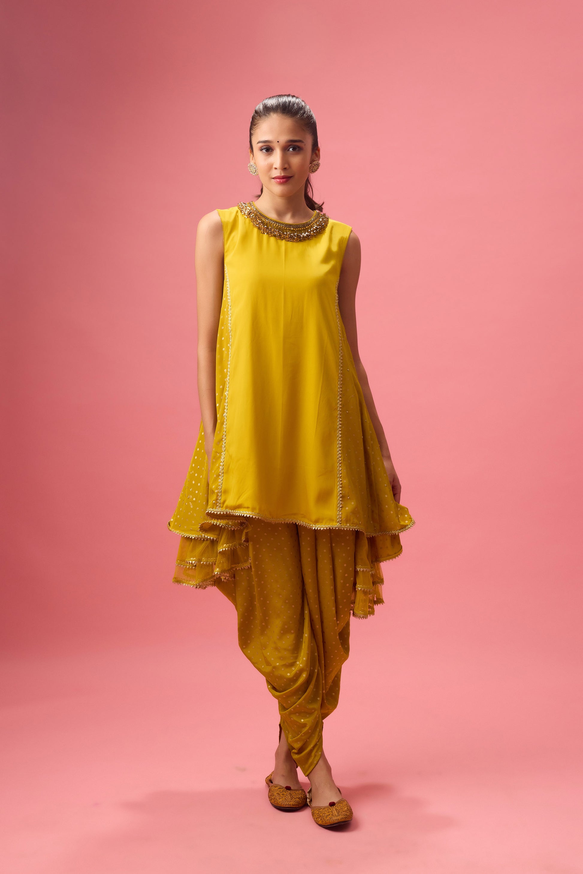 Olive ochre asymmetrical foil print hand embroidered kurta with crepe foil printed dhoti pants.