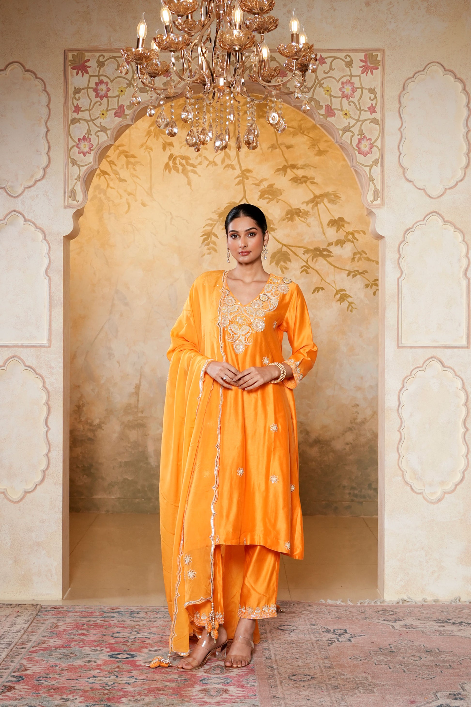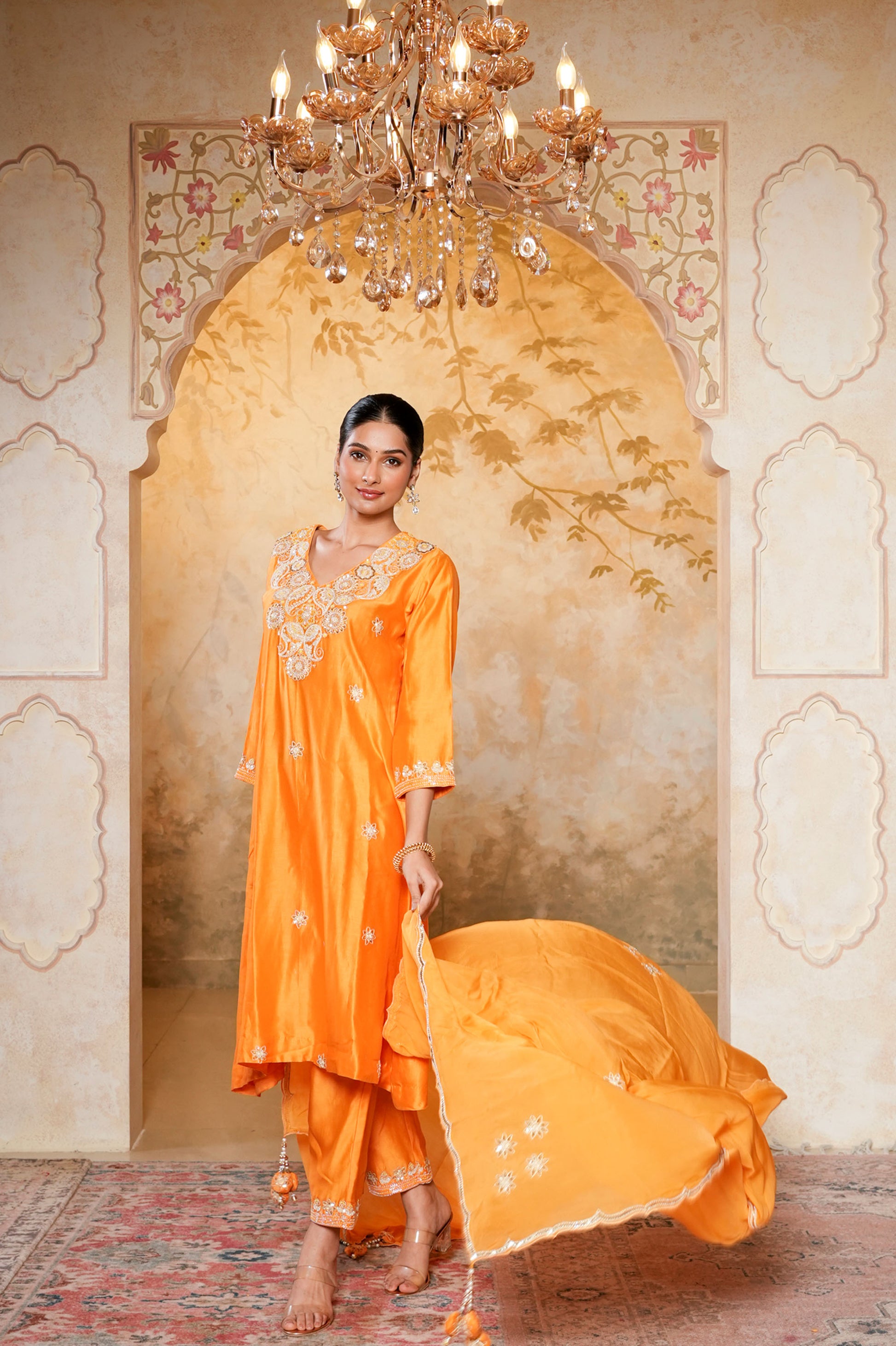 Orange Chanderi With Moti Hand Work & Embroidery Kurta Set