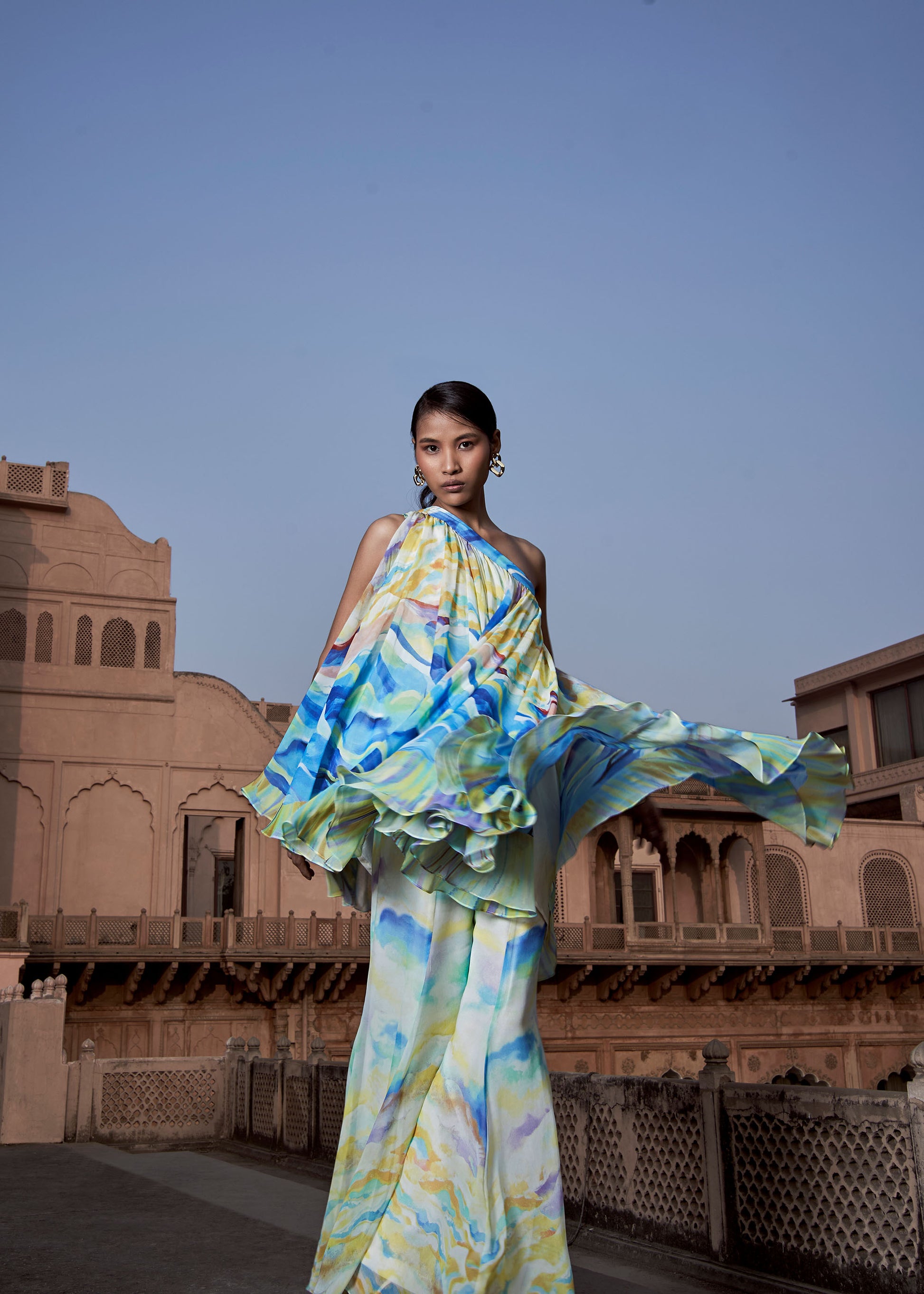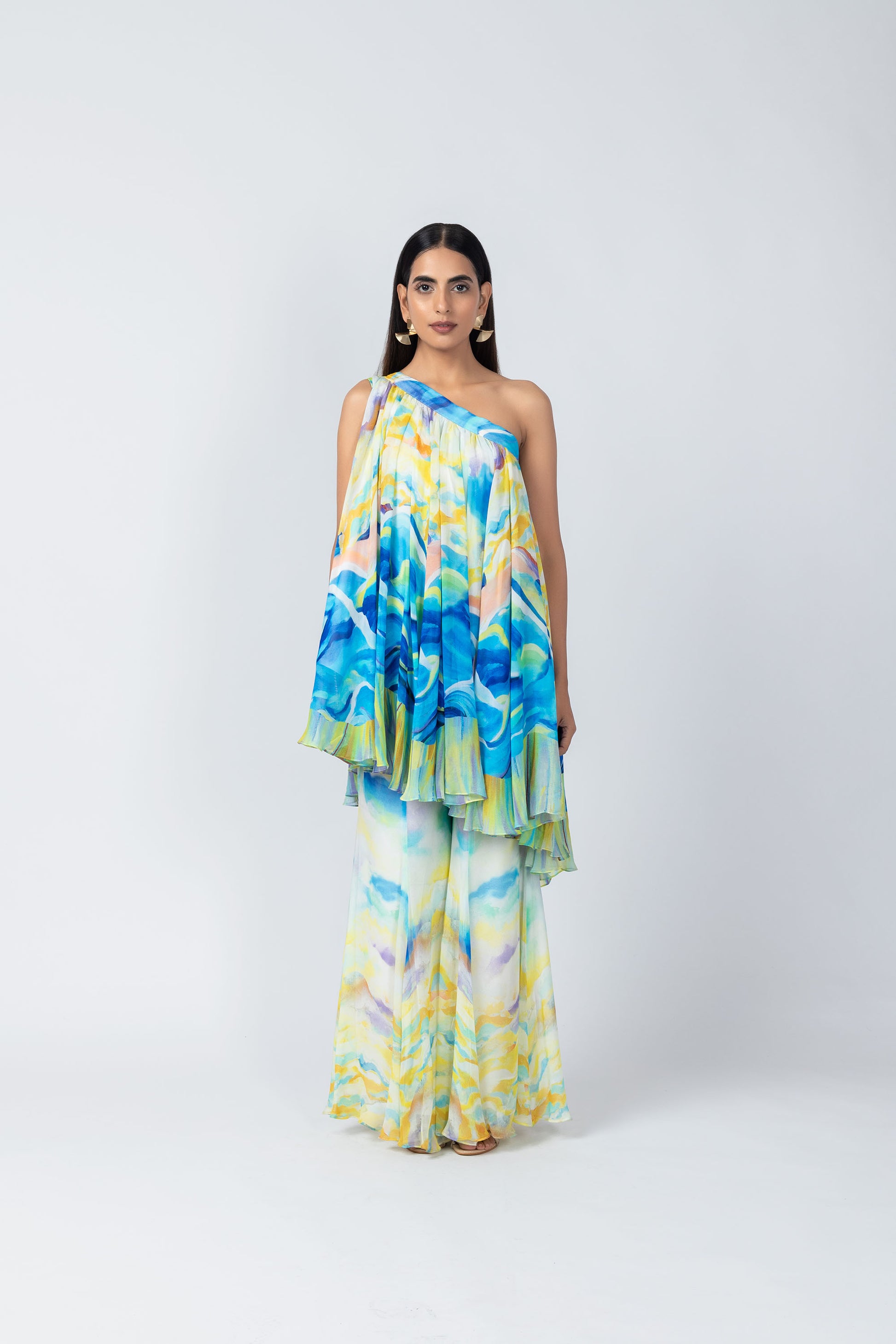 One-Shoulder Tunic with Flared Sharara PantsA hand-painted one-shoulder tunic in tranquil azure, lavender, and golden hues paired with dramatic flared sharara pants. The oversized fit flatters all body types, blending traditional style with modern charm—perfect for celebrating summer’s carefree spirit.Product Type: Two-Piece SetPattern: Hand-Painted PrintLength: Tunic – Hip; Sharara – FullClosure: Slip-OnLining: Fully Lined