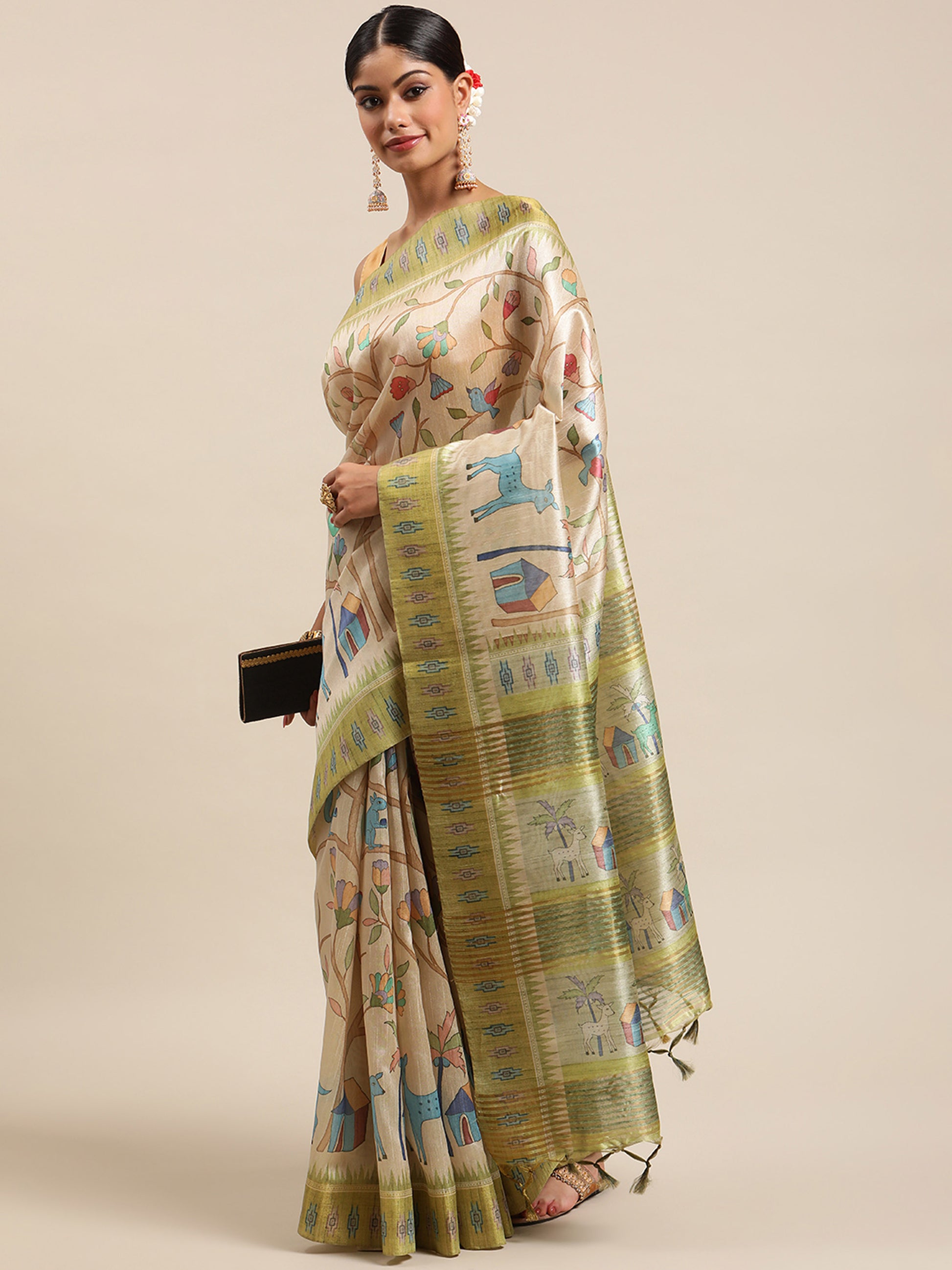 Olive Green Soft Tussar Silk Printed Kalamkari saree