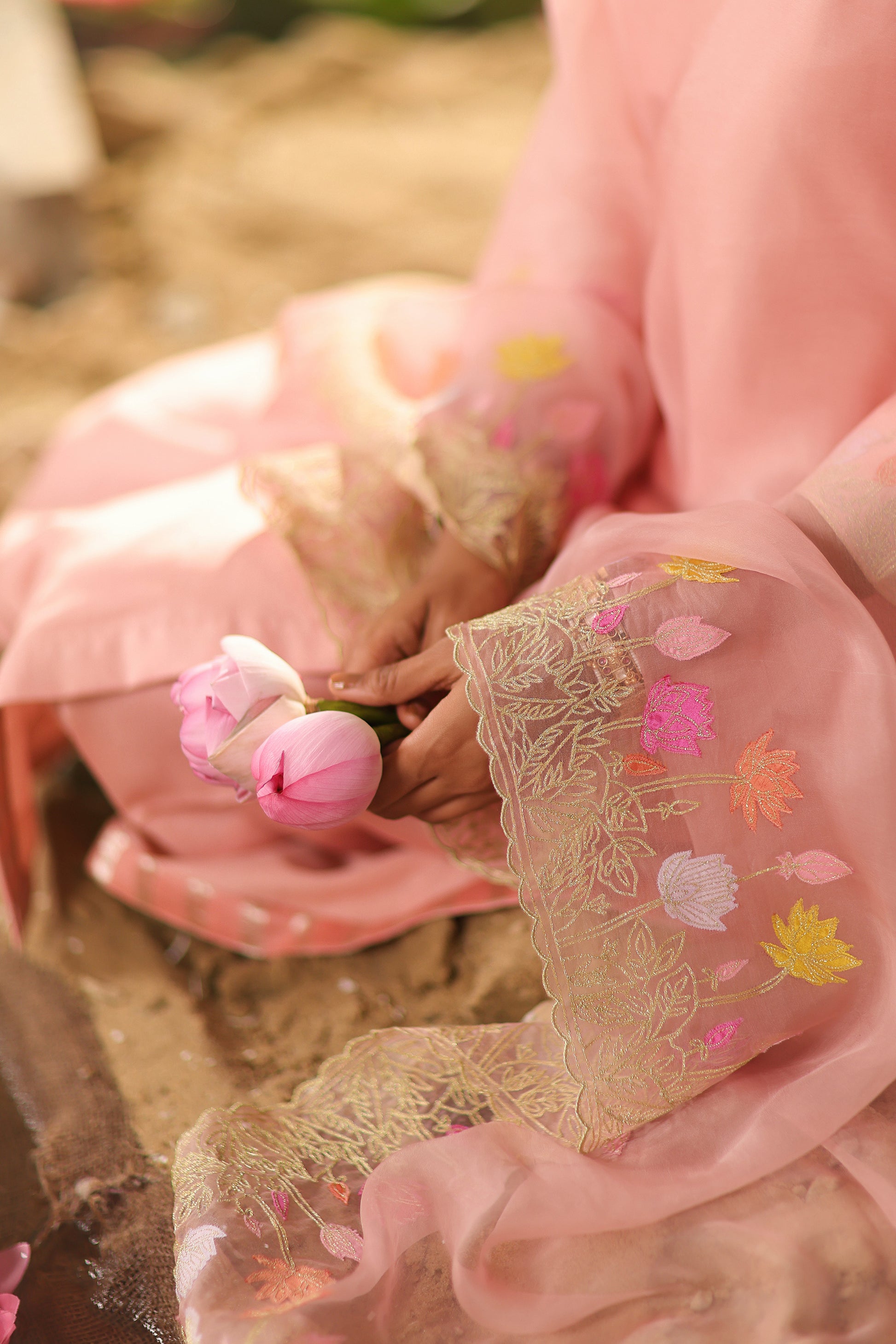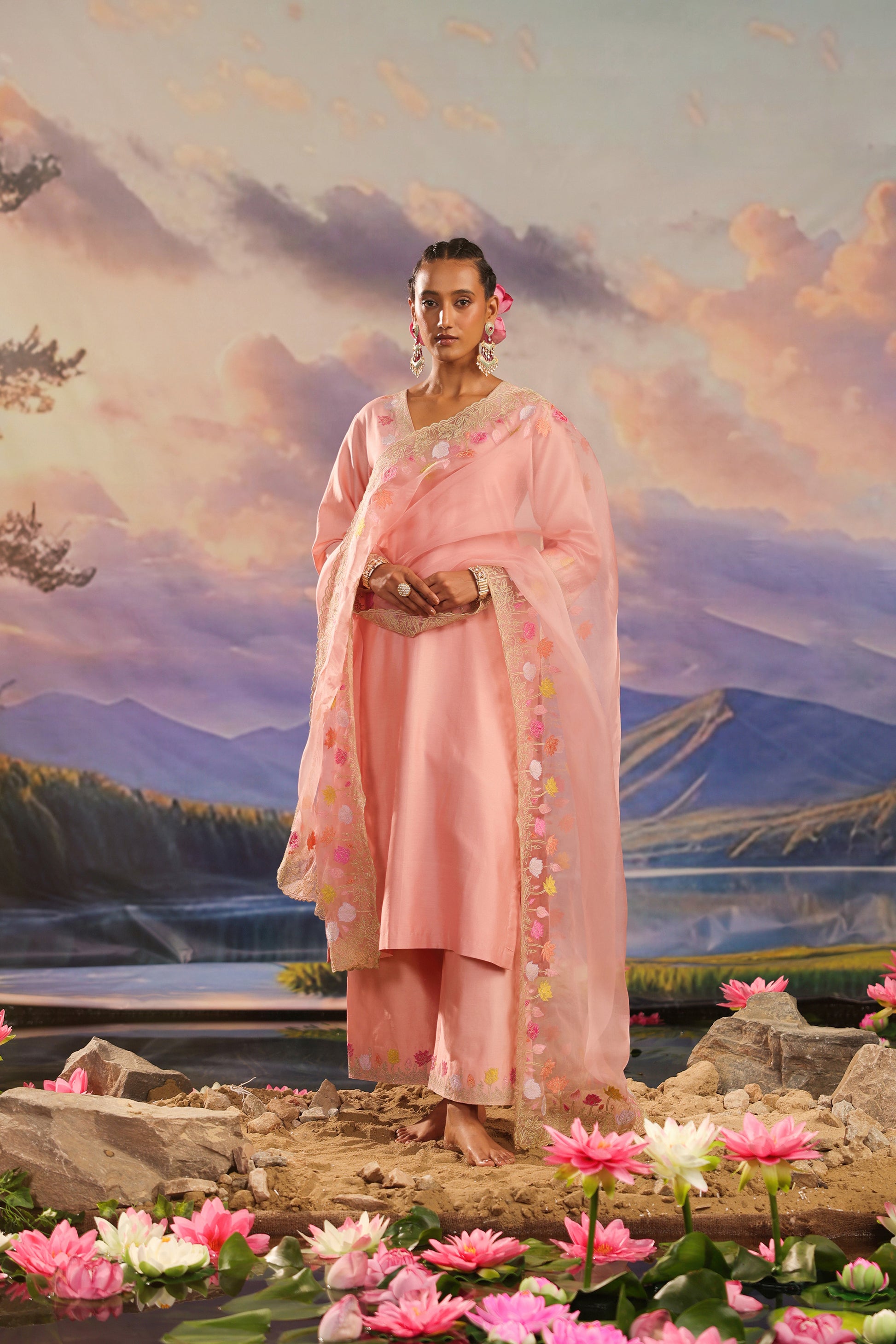 Our classic peach silk Chanderi straight suit set, adorned with intricate Kamal Kali appliqué on the glass neckline, sleeves, and scalloped palazzos. Paired with a pure organza dupatta featuring matching Kamal Kali motifs — a timeless classic, woven with elegance and tradition.