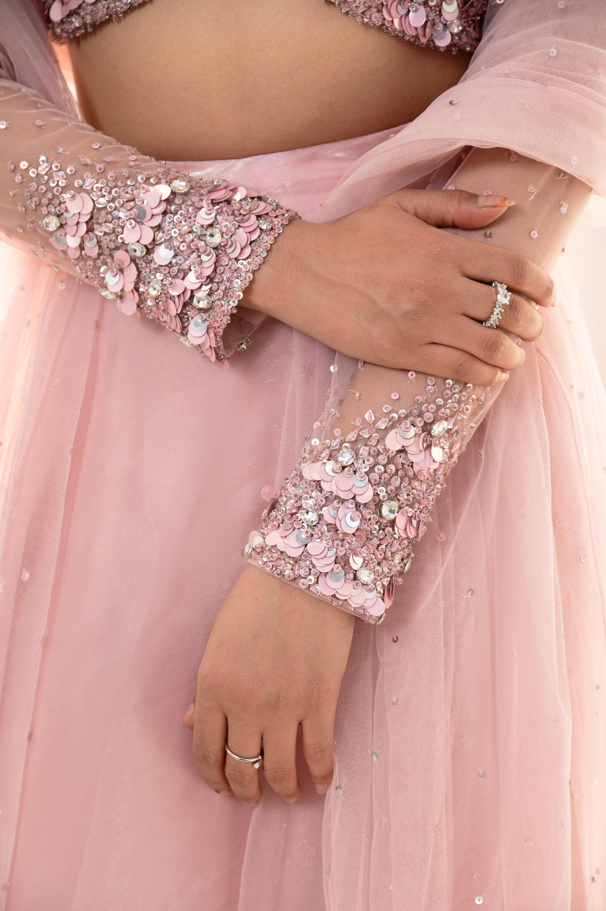 A pastel pink ensemble featuring a sheer embellished jacket, delicate hand embroidery, and a flowing organza skirt paired wit a sheer embroidered dupatta