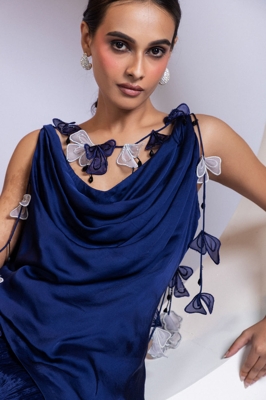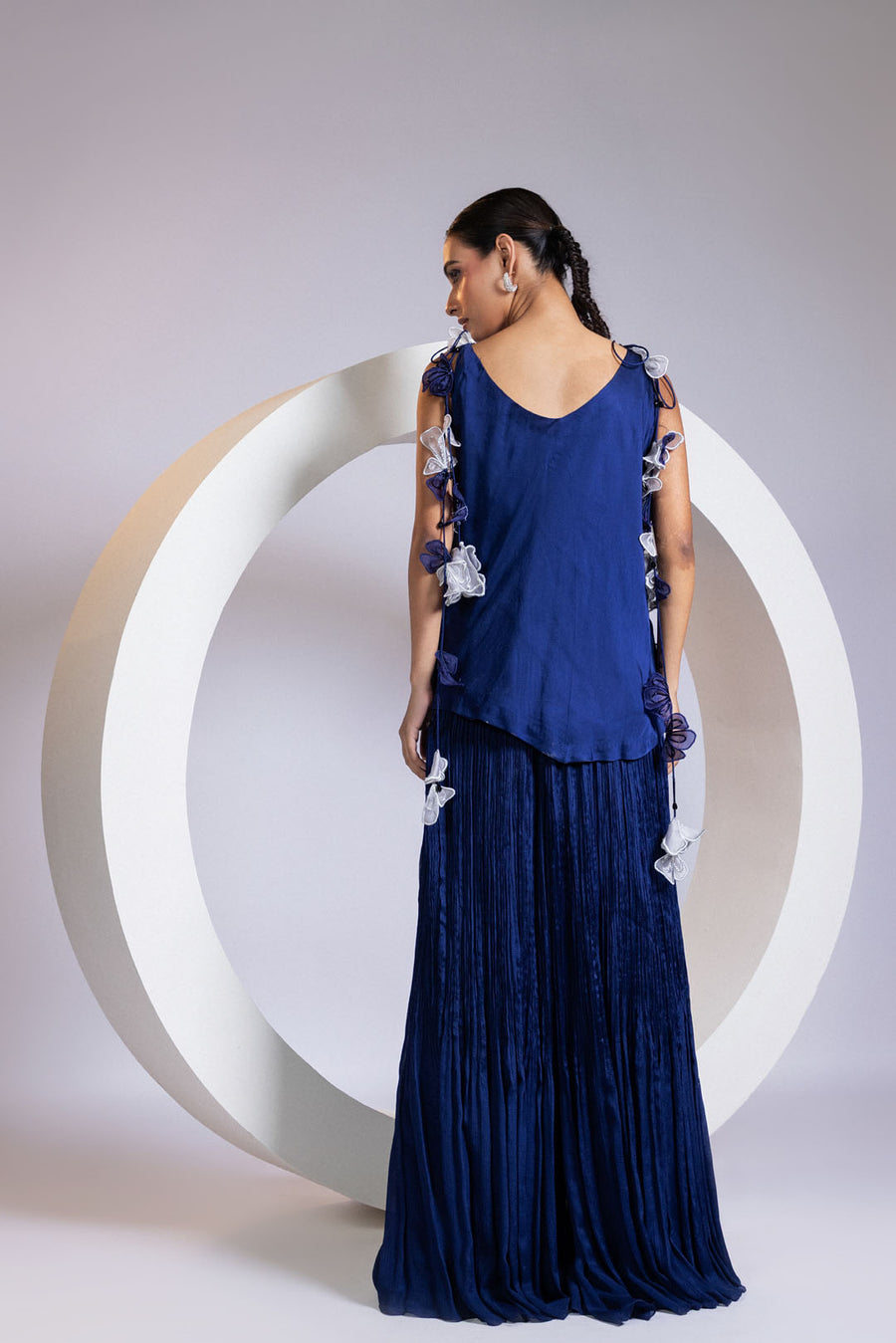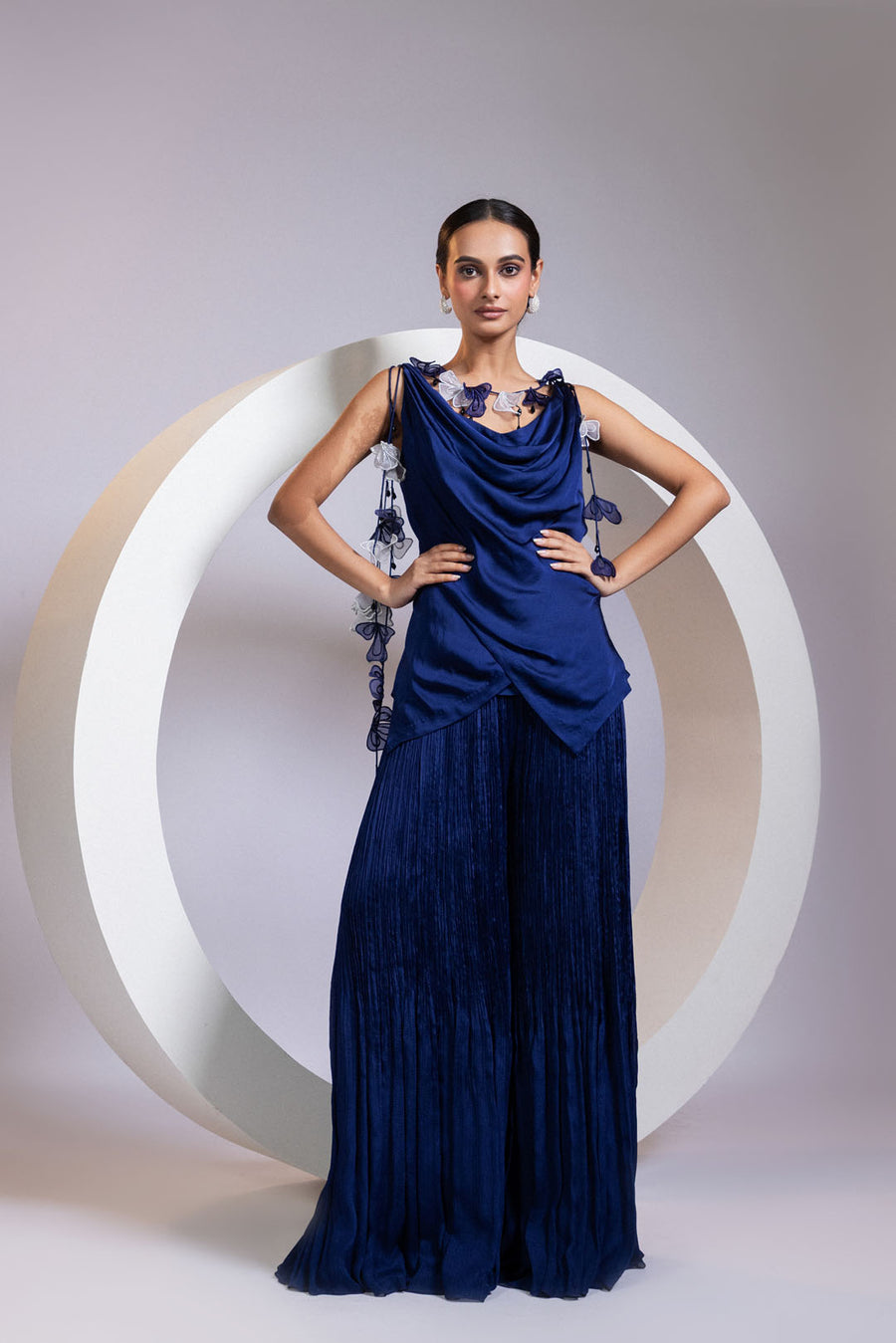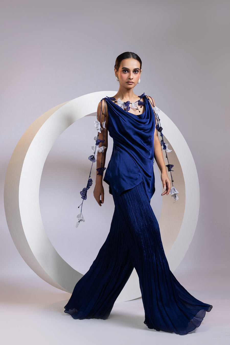 A vibrant two-piece tangerine set featuring an overlap top with cowl neckline, asymmetrical hem, and ruched palazzo pants for easy flow. The neckline is adorned with cascading floral applique strings in orange and white organza, evoking falling petals. Light, playful, and textural, it’s ideal for resort escapes and bohemian soirées.