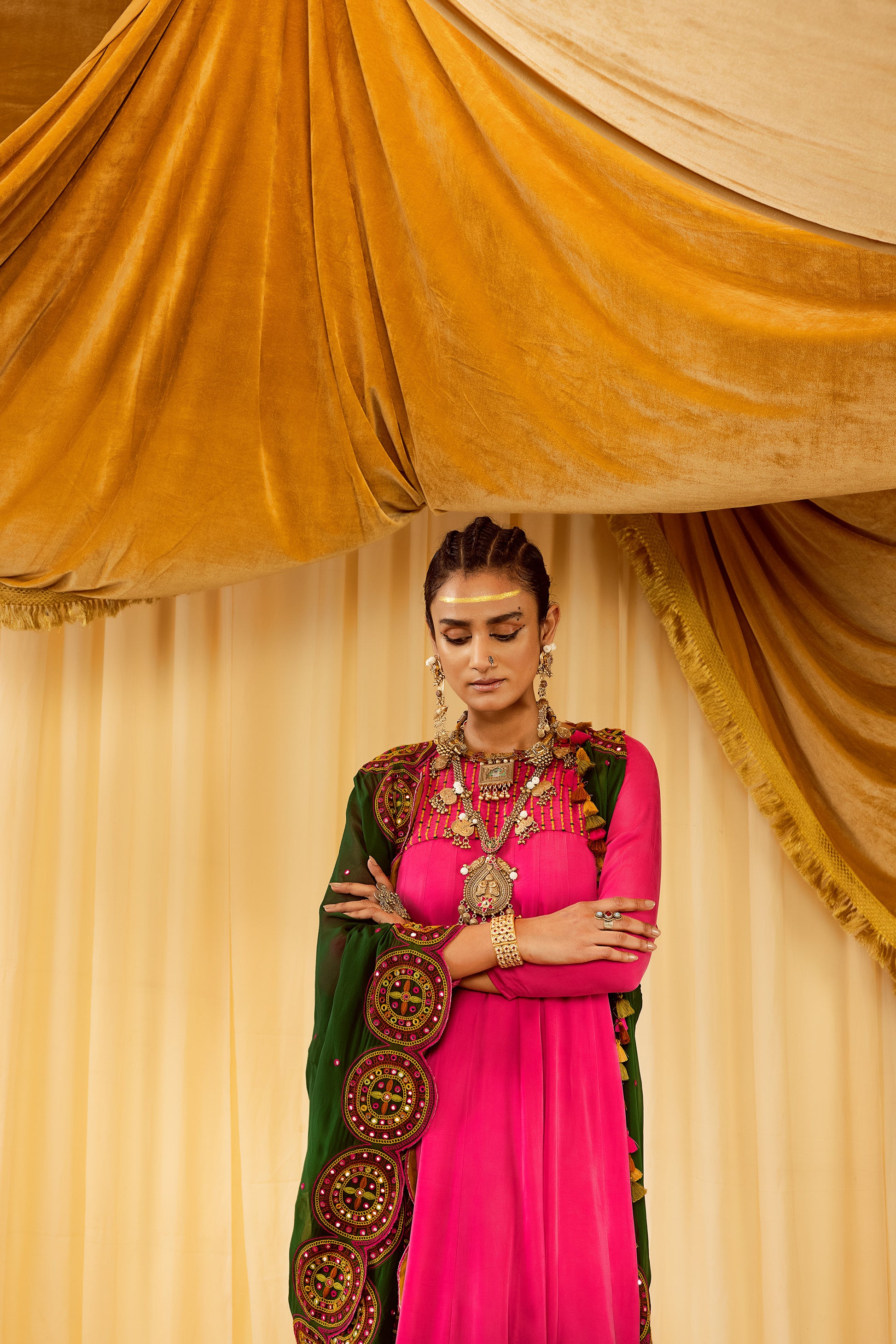 Pink small yoke Anarkali with a heavy flare is here to take your breath away. It comes featuring embroidery details on hem & yoke. Duppatta is a dark green color, with heavy circle hand embroidery & cut work, paired up with churidaar