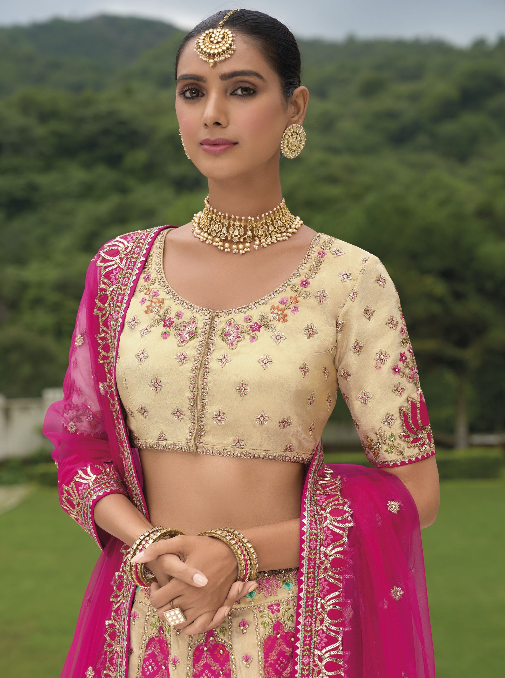 Looking for something a little out of the ordinary? We've got just the thing! This Pink and Beige Khatli and Sequence Embroidery Silk Bridal Lehenga is perfect for those who want to make a statement. With its beautiful sequins embroidery and vibrant pink color, this lehenga is sure to make you the center of attention. A bride would look gorgeous in this outfit. It is suitable for any occasion, such as weddings, receptions, engagement parties, and sangeets. So don't wait any longer, add this Pink and Beige Khatli and Sequence Embroidery Silk Bridal Lehenga to your wardrobe today!