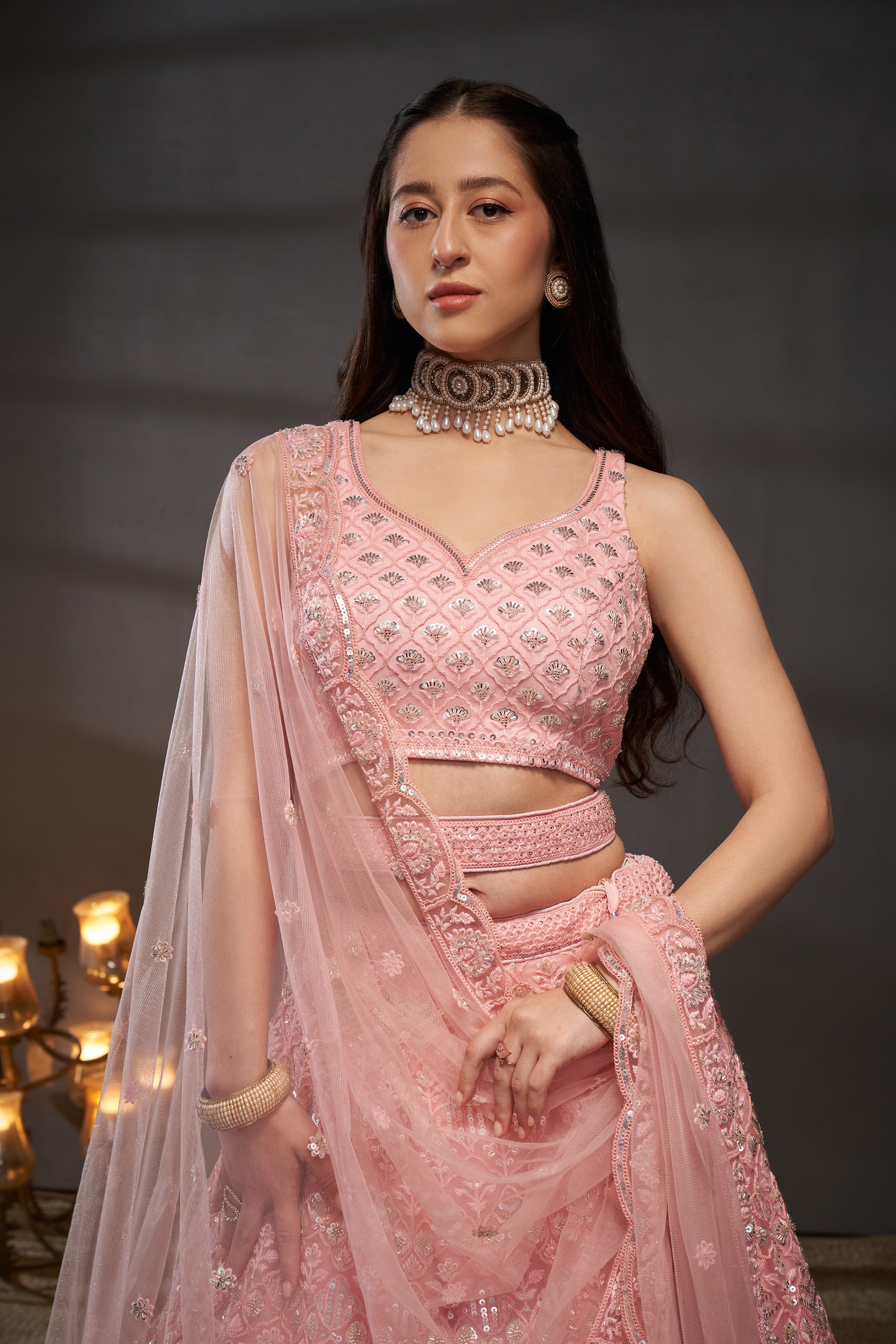 Pink Net Cutdana, Sequins and Zarkan embroidery Lehenga