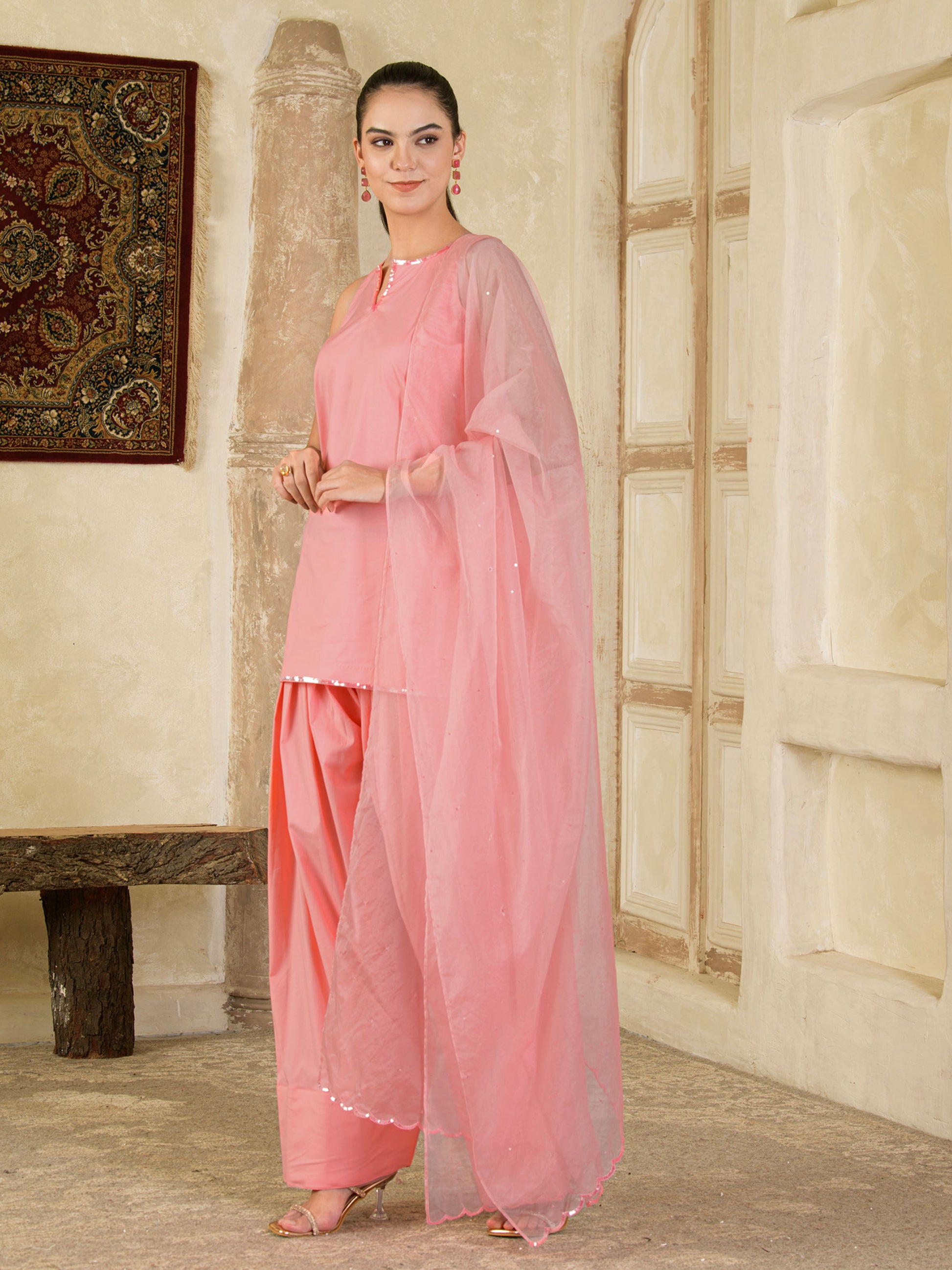 Soft, feminine, and effortlessly elegant — this pink farsi salwar suit set is crafted in breathable cotton, perfect for balmy days and festive moments alike. The sleeveless kurta features subtle sequin edging on the neckline and hem for just the right hint of shimmer. Paired with a voluminous farsi salwar and a sheer organza dupatta, lightly dusted with sequins, this set strikes a beautiful balance between comfort and understated glamour. Ideal for brunches, summer festivities, or day events.