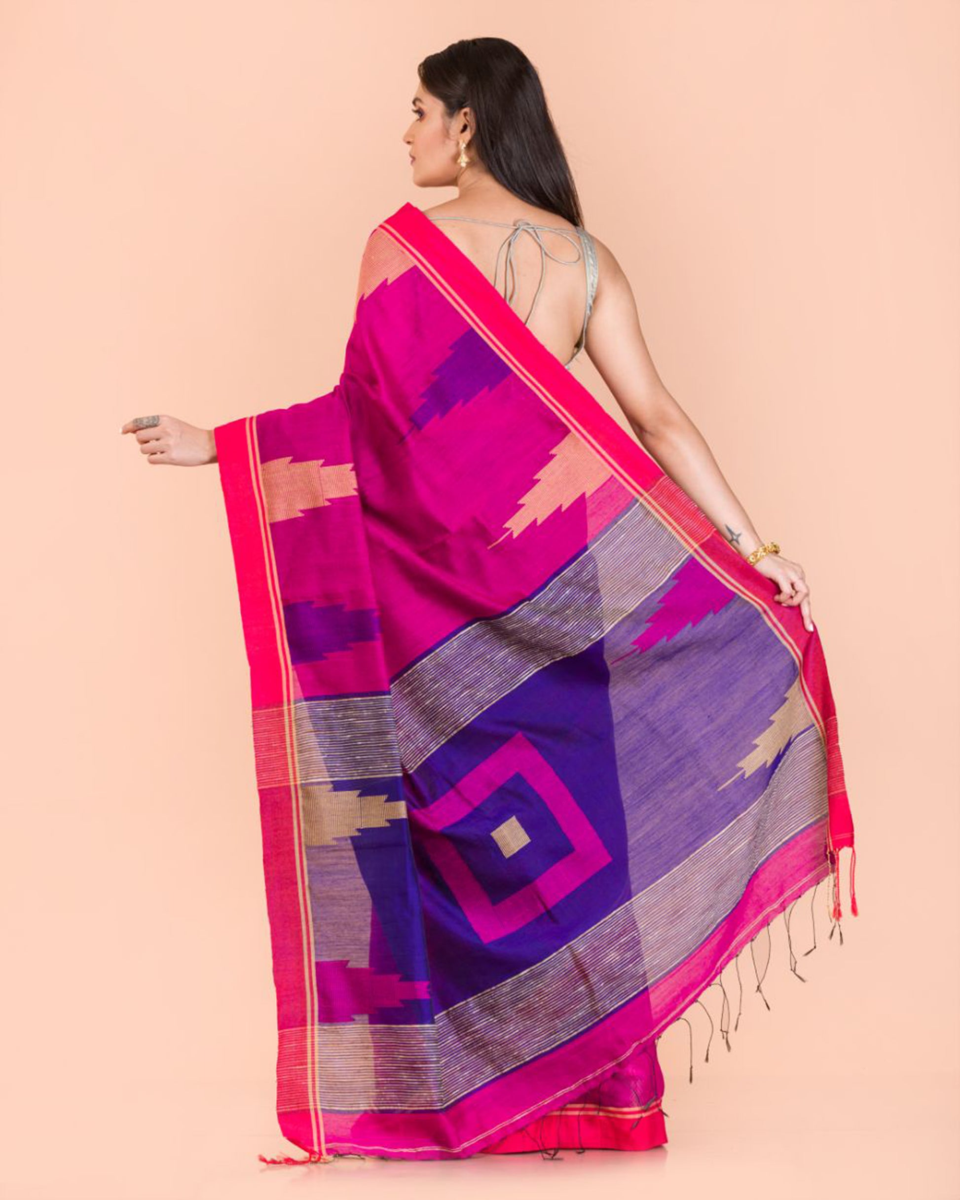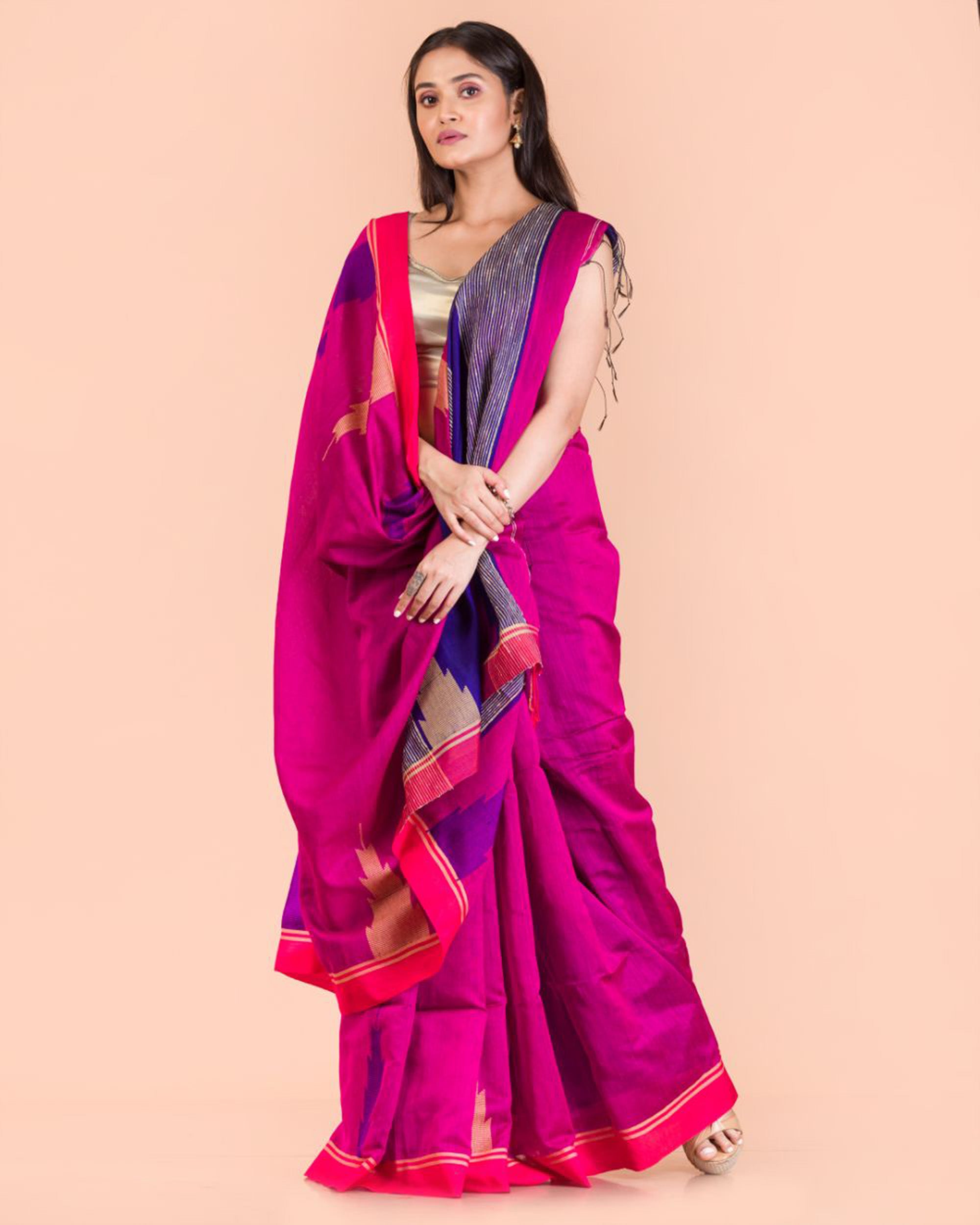Pink Temple Border Blended Cotton Jamdani Saree