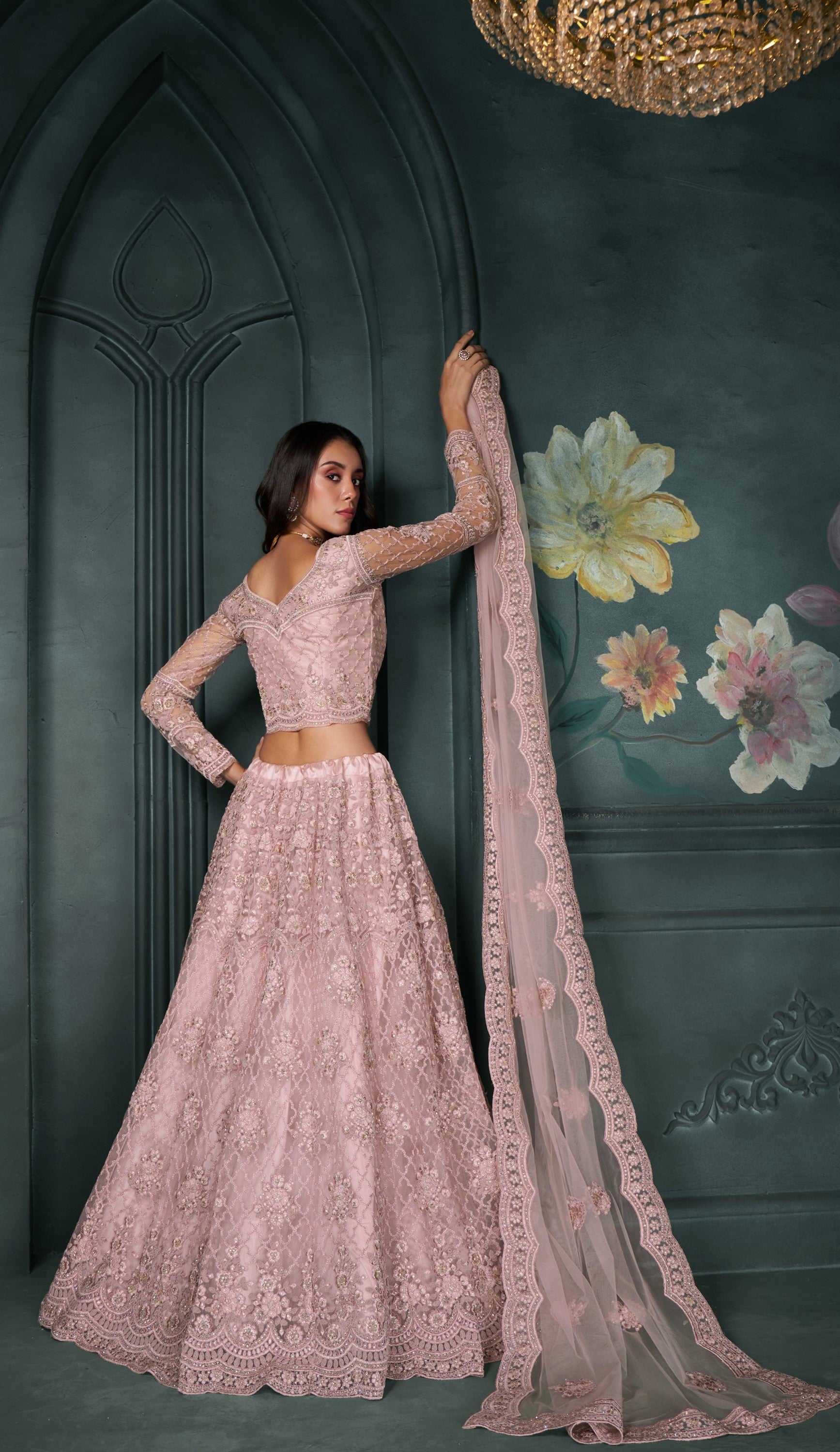 Pink Thread & Badla Embroidered Net Engagement Lehenga