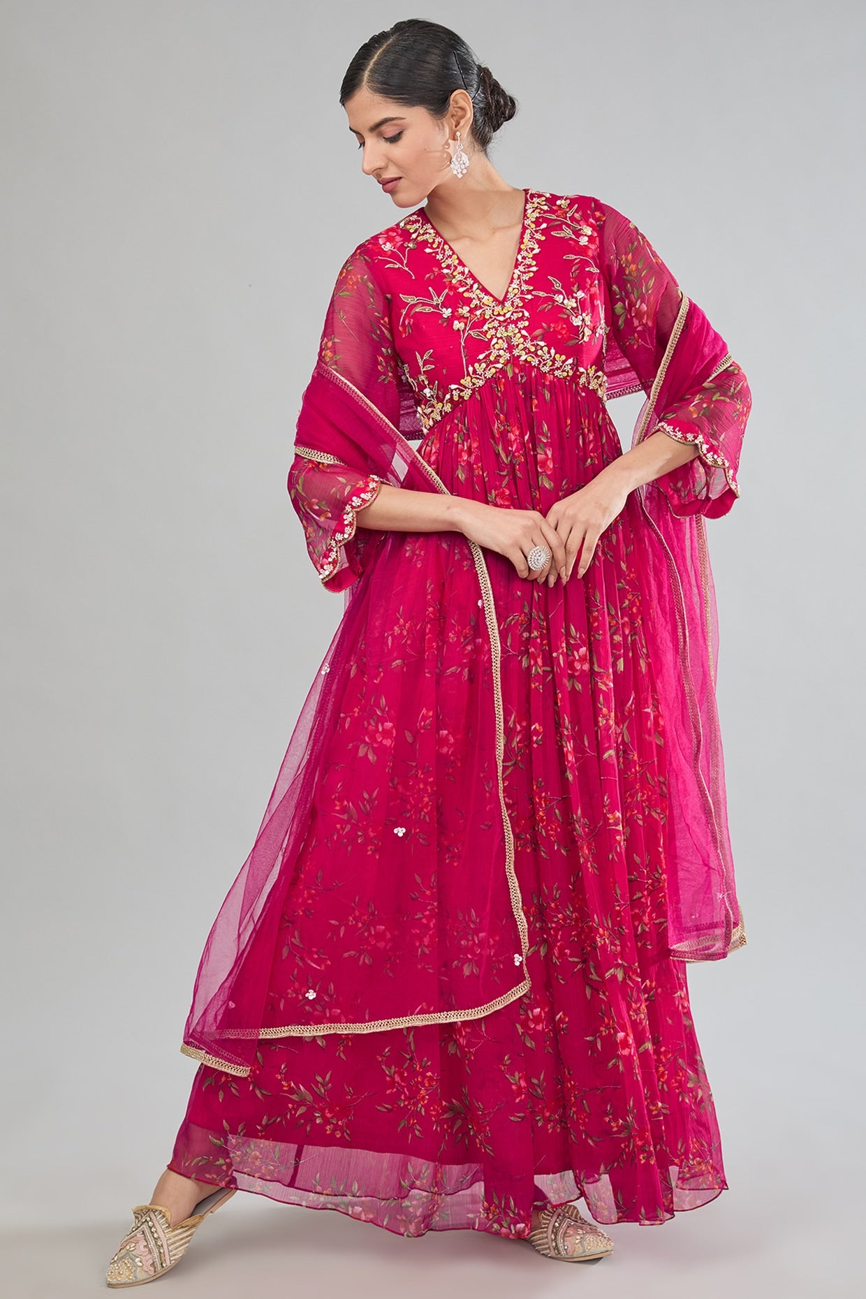 Chiffon Printed Anarkali with embroidery details on Neck, Scallop embroidery on bell sleeves hem. Comes along with butie embroidered dupatta with lace