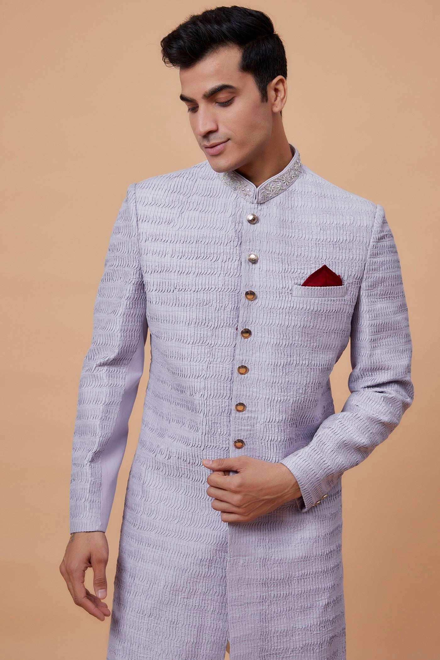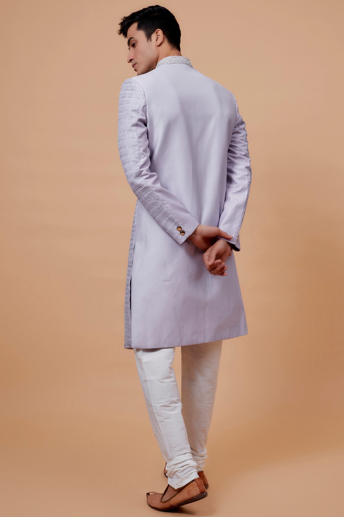 Featuring a purple indowestern jacket in silk base with pintucks detail and zardosi hand work. It is paired with contrasting white pants.