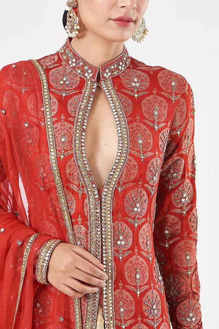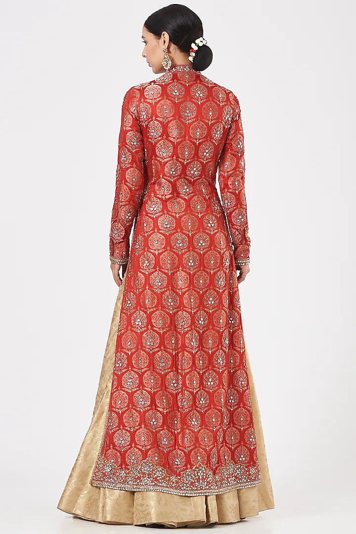 Featuring a beige lehenga in pure silk base with embossed gold flowers. It is paired with a red embroidered long banarasi brocade jacket and an organza dupatta having kundan embroidery. Style it with statement jewellery and heels for a sangeet or wedding ceremony.