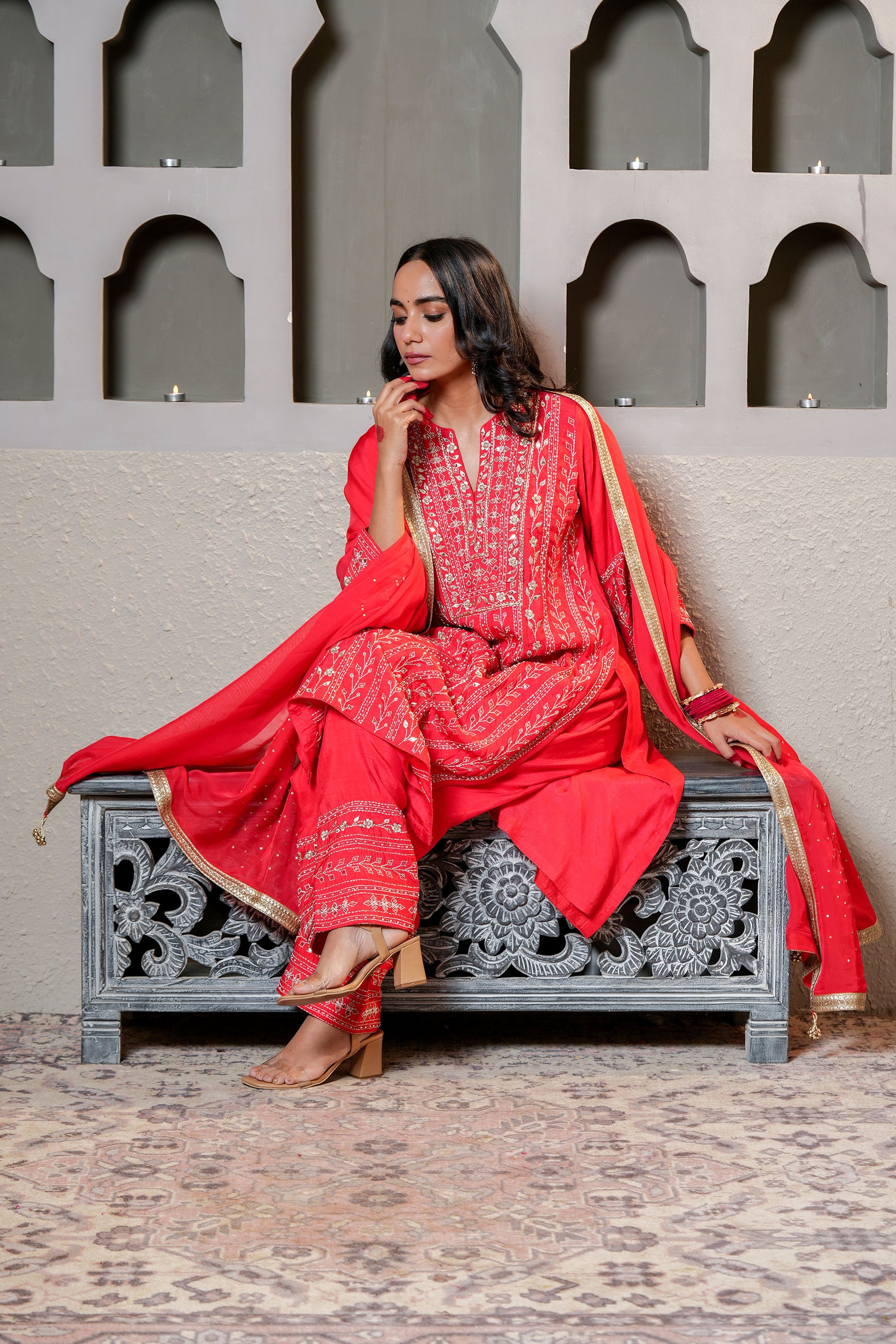 Make a dazzling arrival with this eye-catching red chanderi kurti set, which will instantly elevate any event.