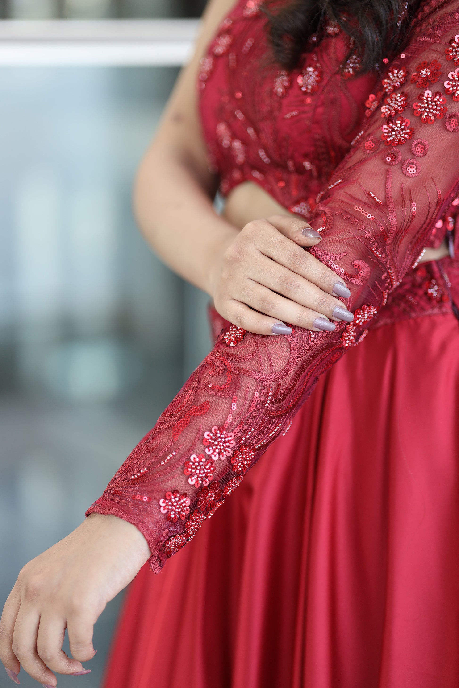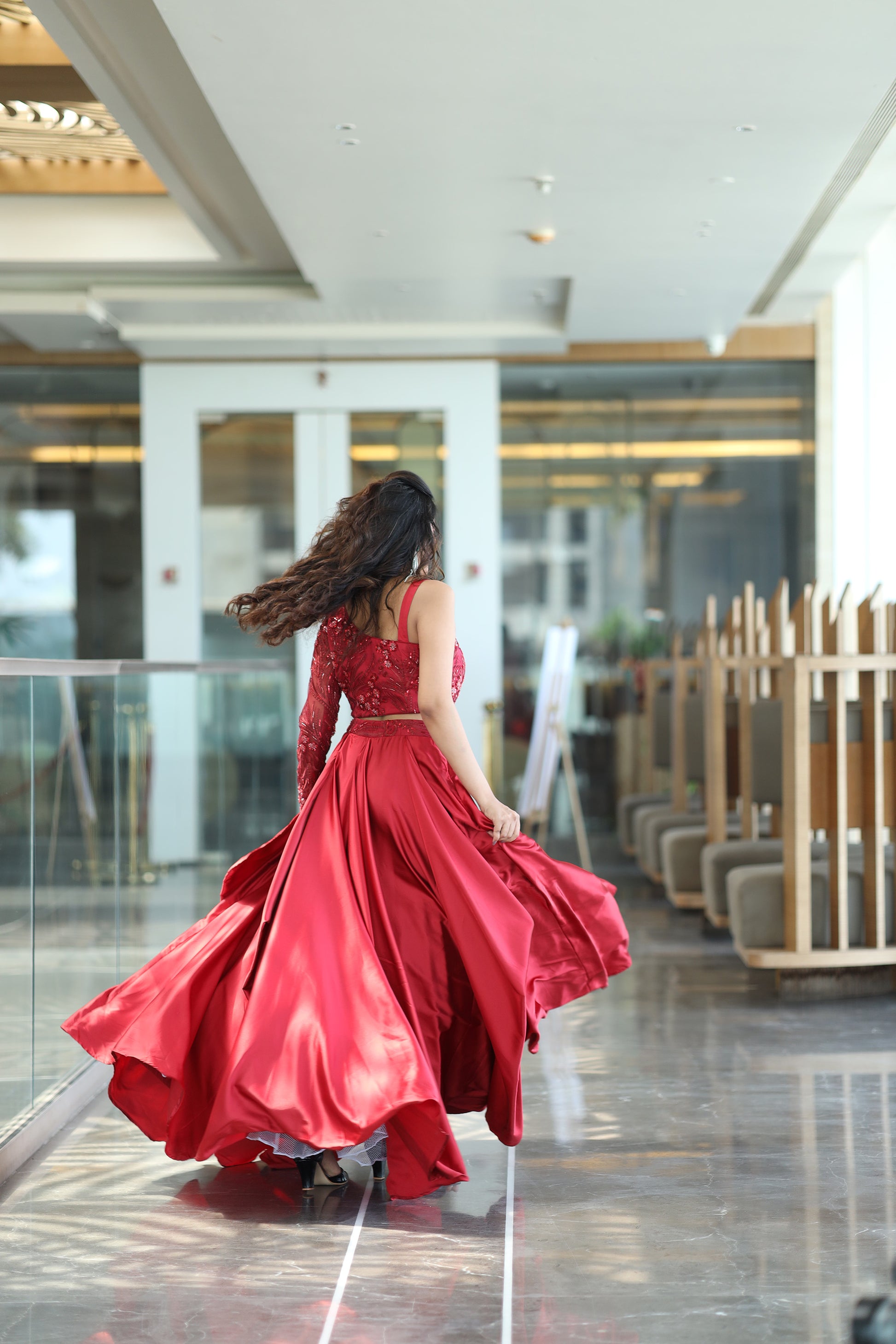 Adorned in fiery red, this ensemble boasts a full-sleeve top with intricate detailing on one side and striking striped sleeves. The red lehenga, with its abundant fabric and captivating wavy ghera, is a masterpiece of artistry.