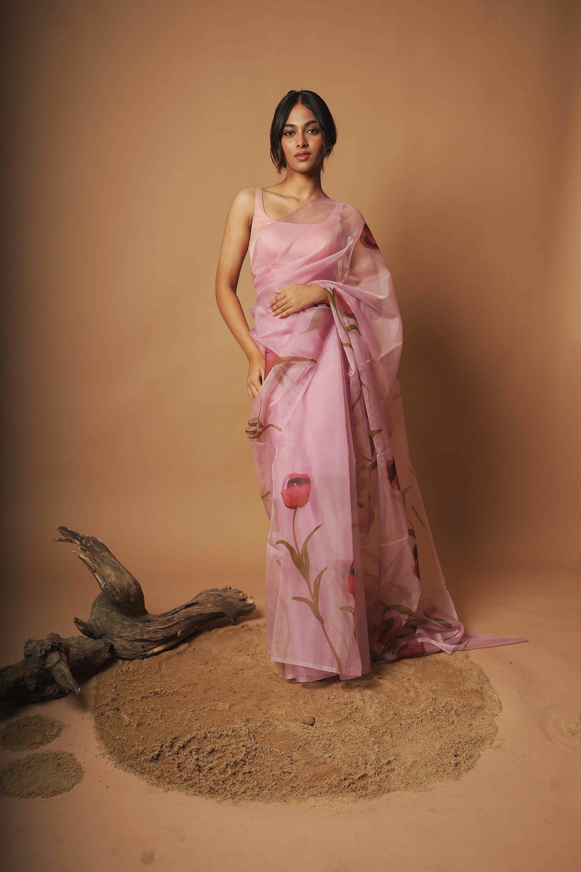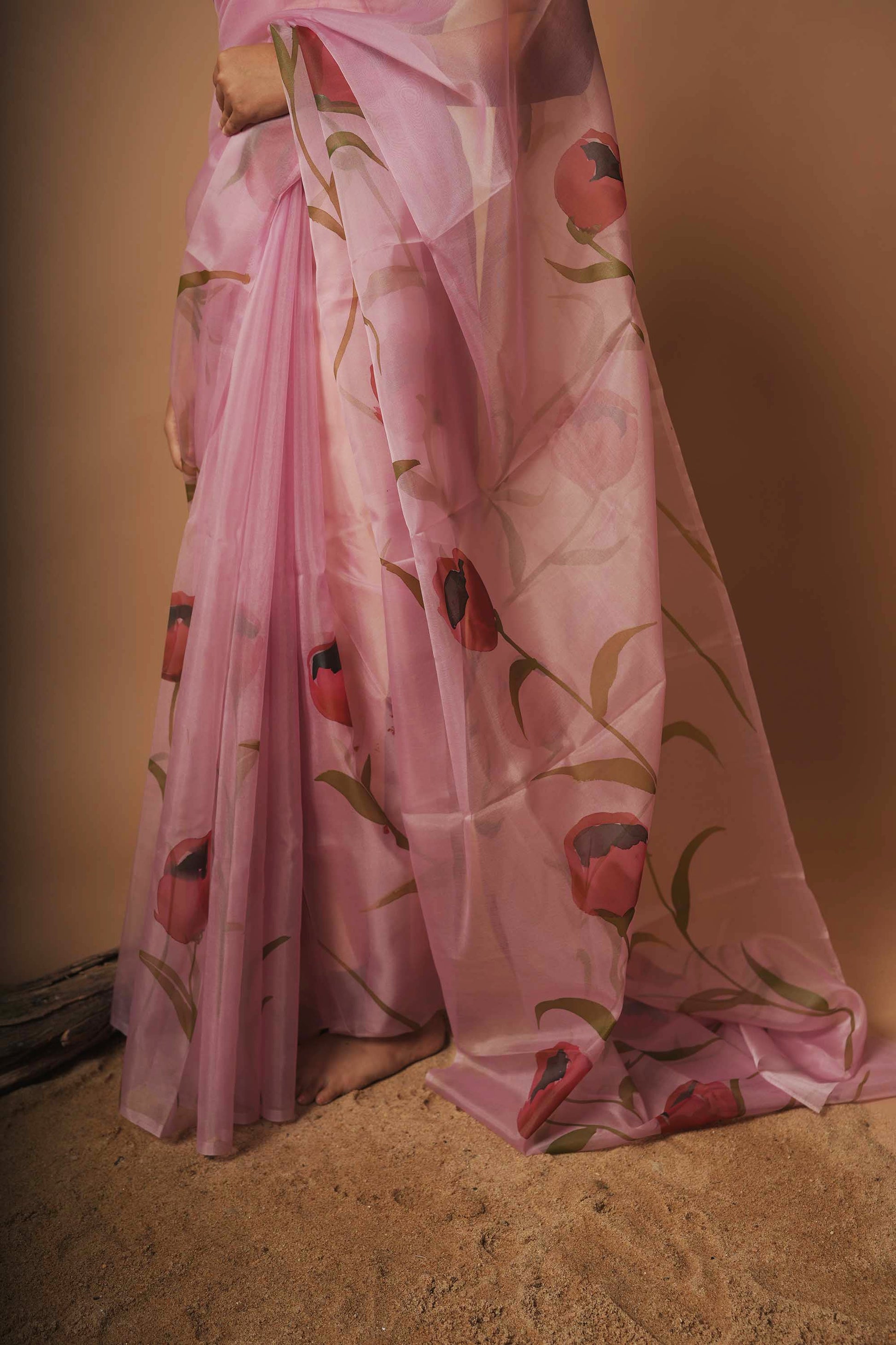 Rose Blush | Lavender Floral Hand Painted Organza Saree