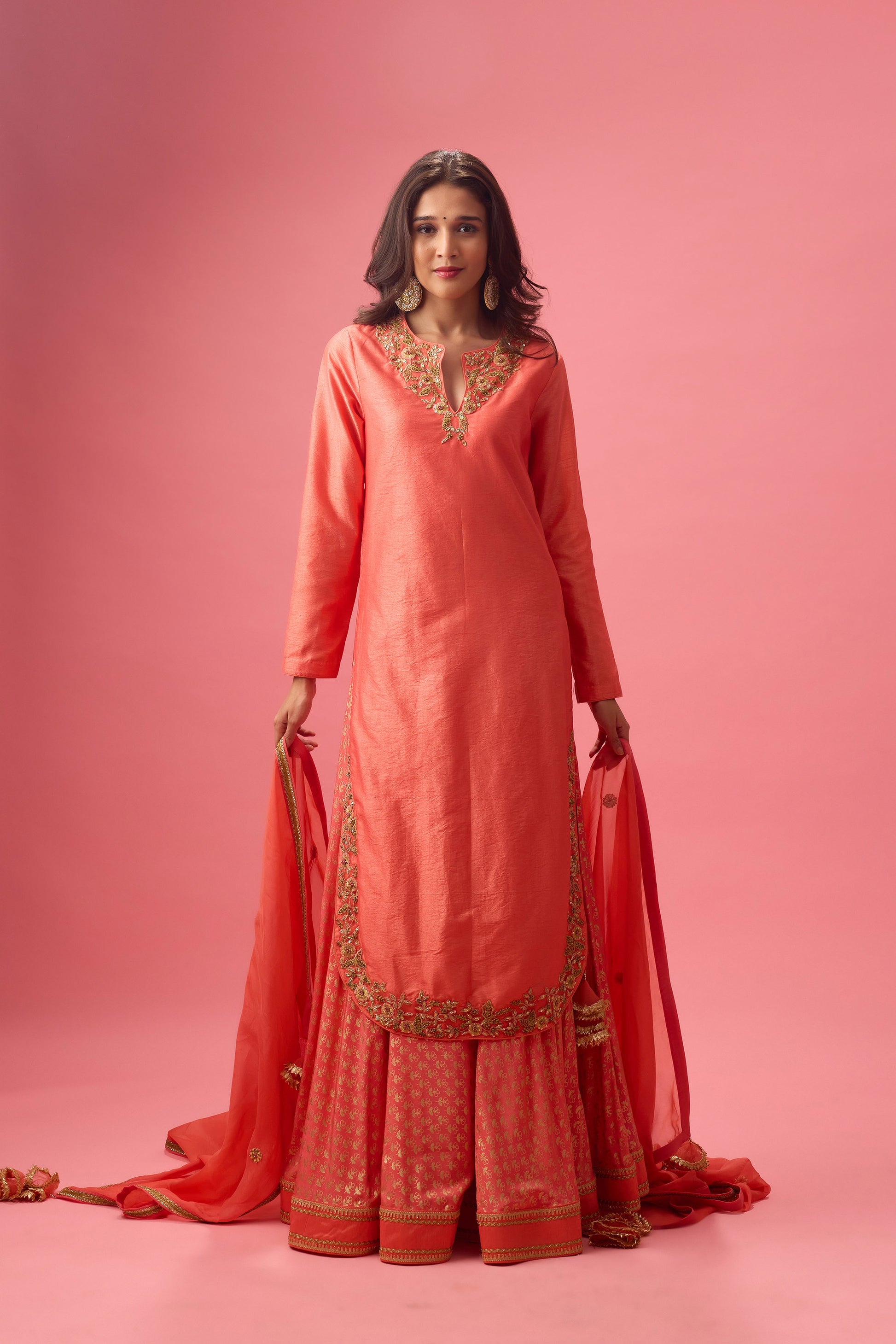Rose salmon pure raw silk hand embroidered kurta paired with crepe foil printed skirt and hand embroidered dupatta.