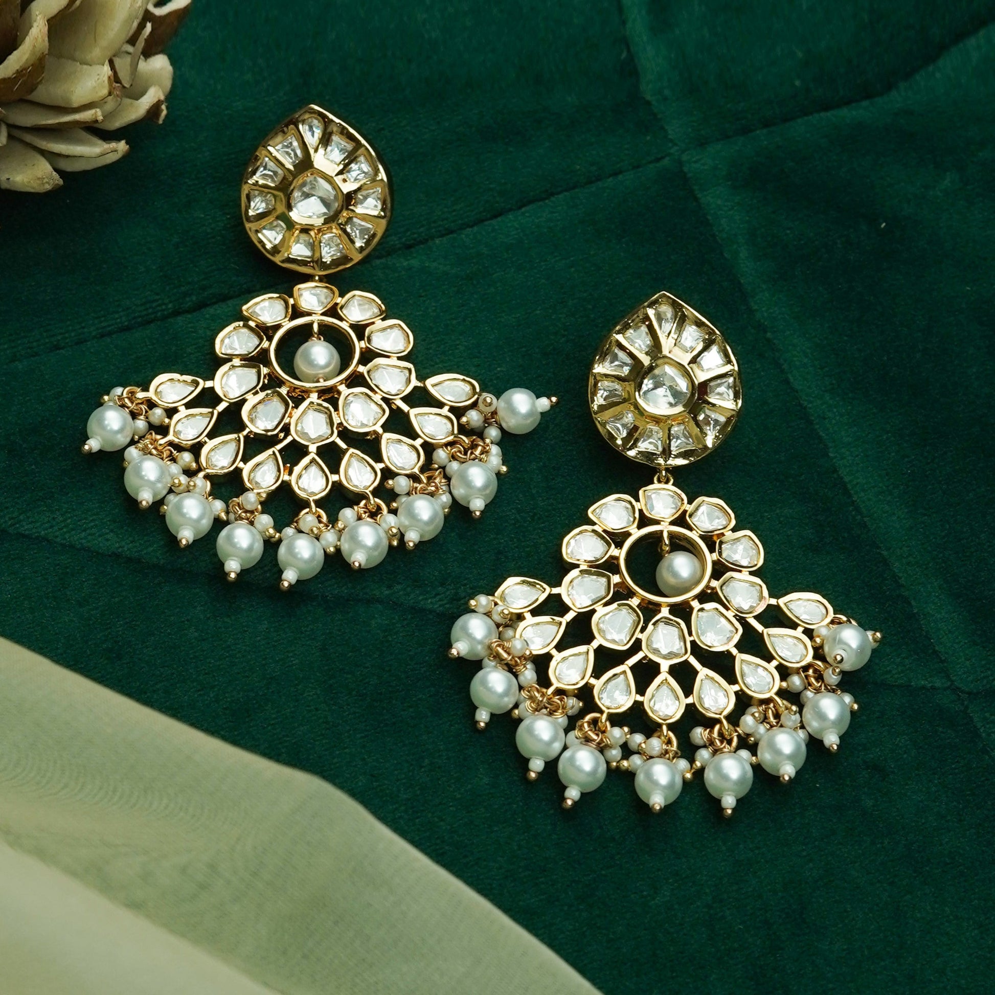 Add a touch of royal elegance to your jewellery collection with the Roshini Kundan Pearl Chand Baalis by Zevar Club. These stunning earrings feature a perfect blend of uncut Kundan stones and lustrous pearls, creating a captivating design that reflects grace and tradition. The crescent-shaped chand baalis are meticulously handcrafted, with each detail carefully crafted to bring out their timeless beauty.