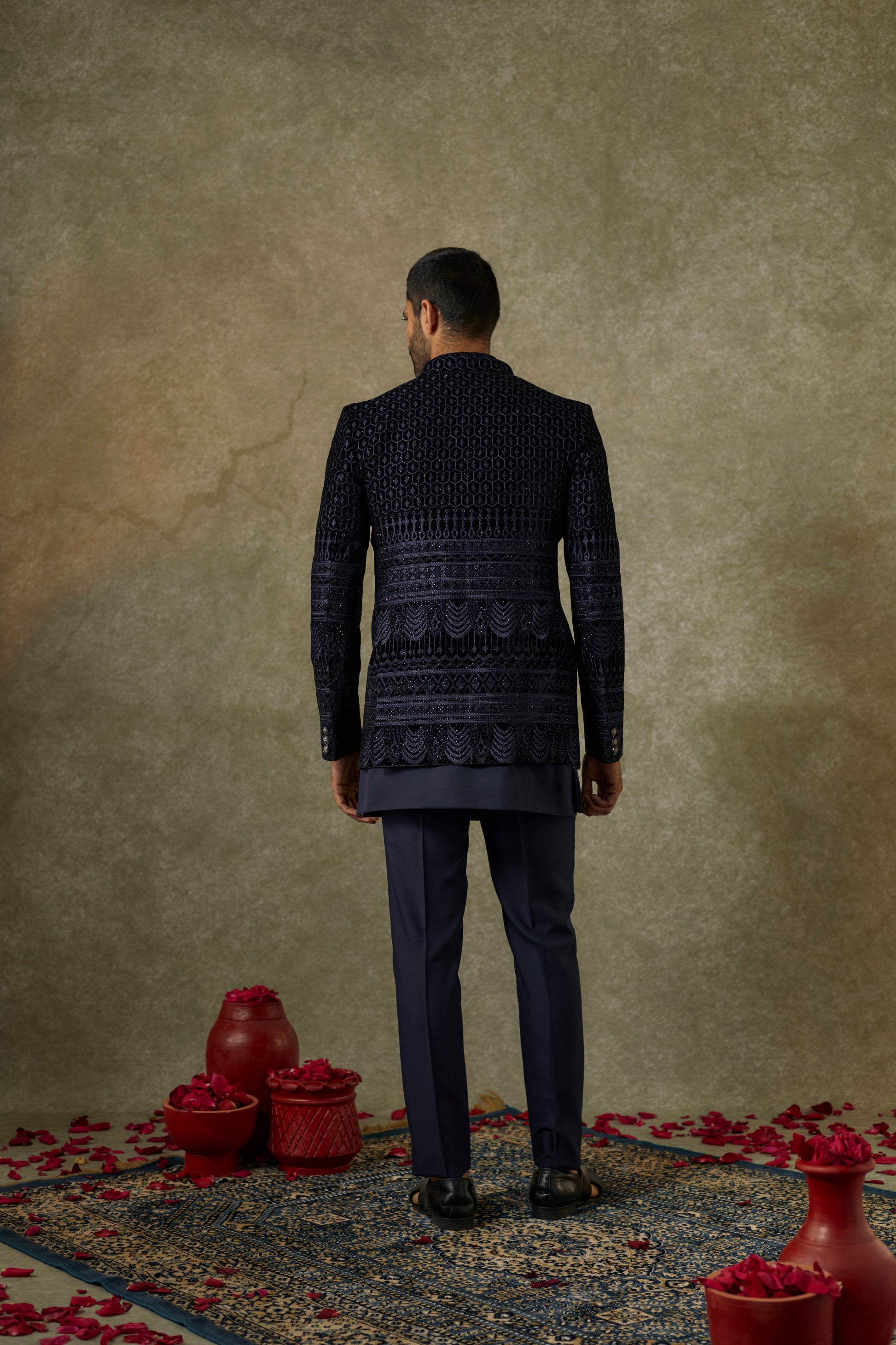 Royal Blue Satin silk and Velevt Embroidery Open indo western set