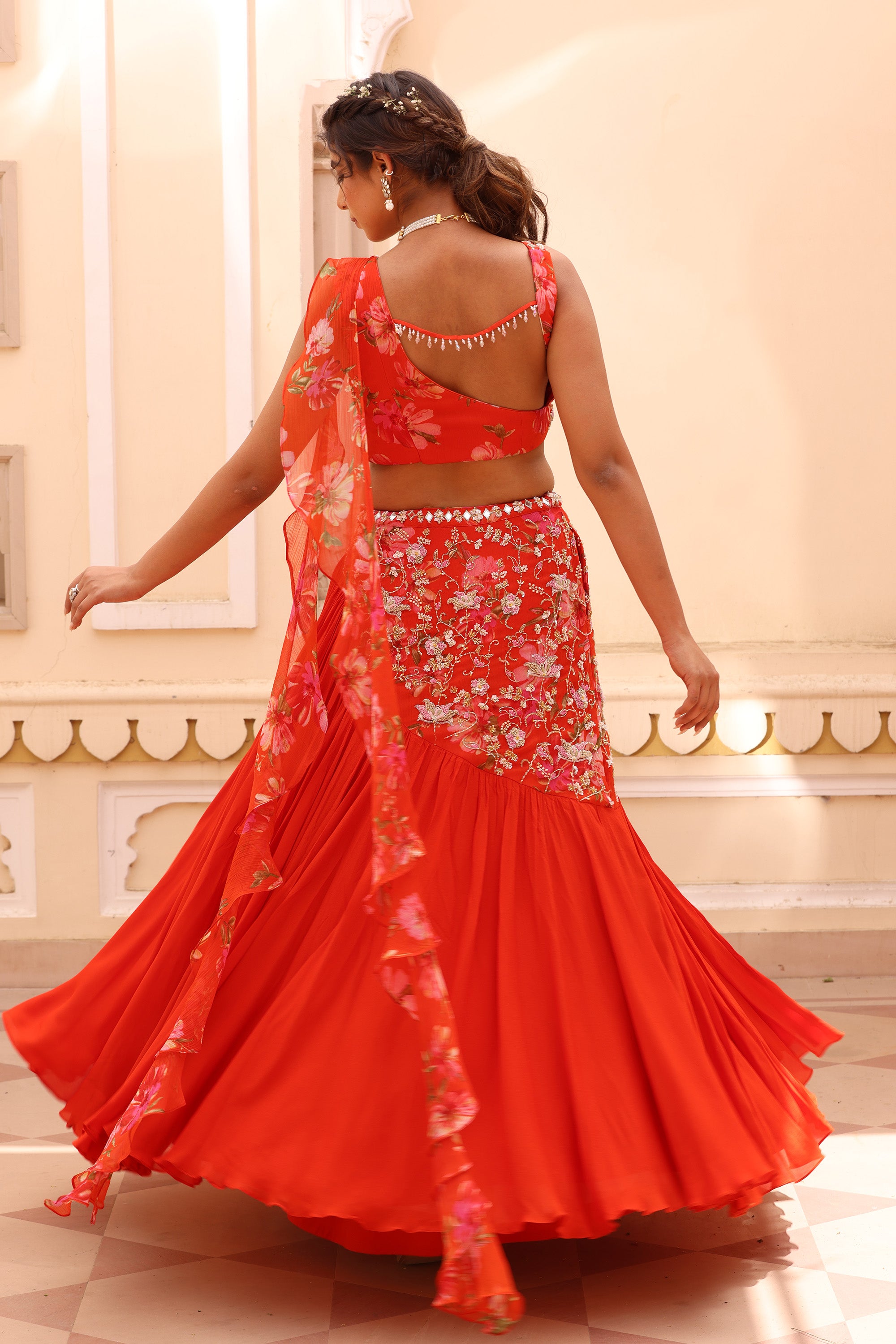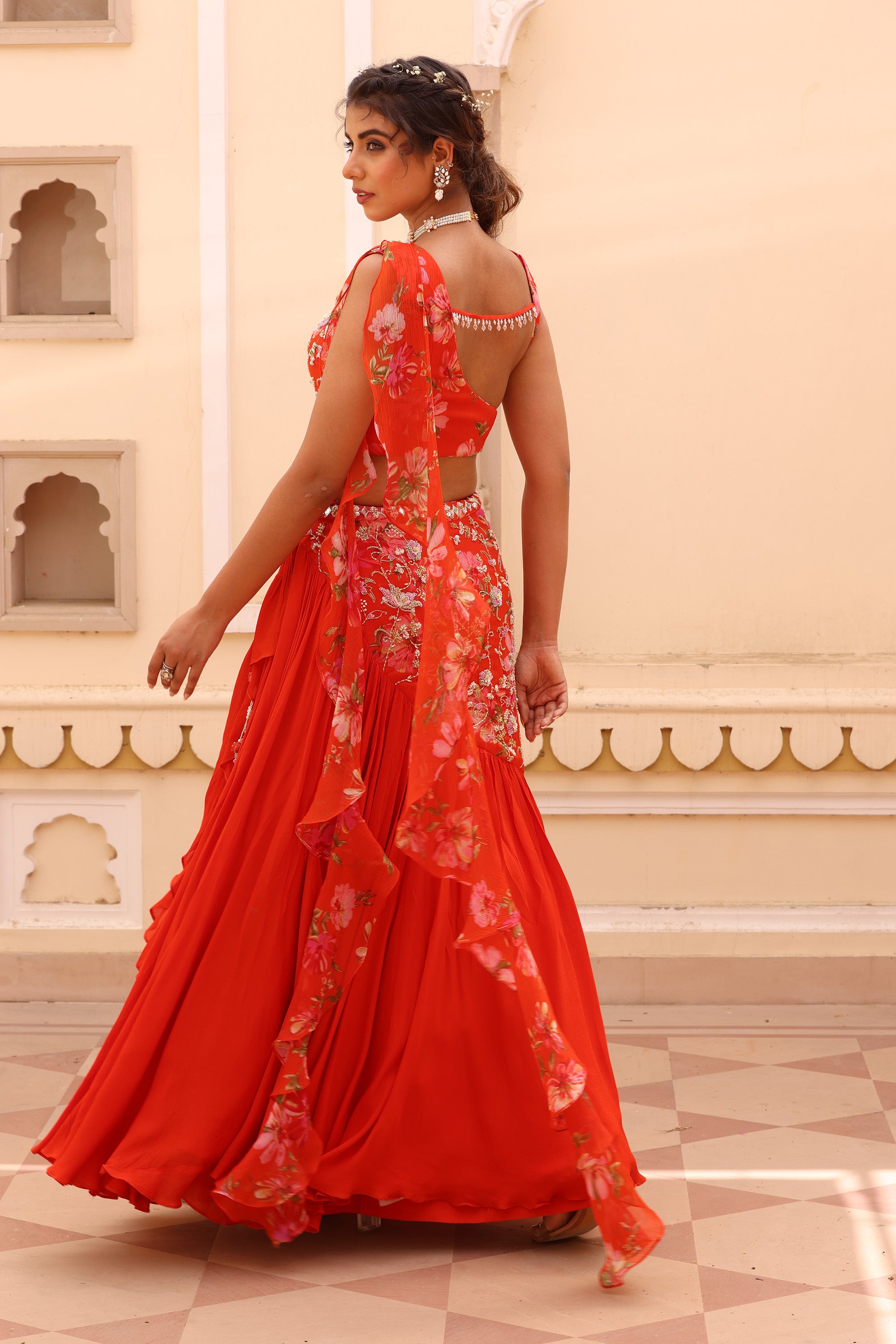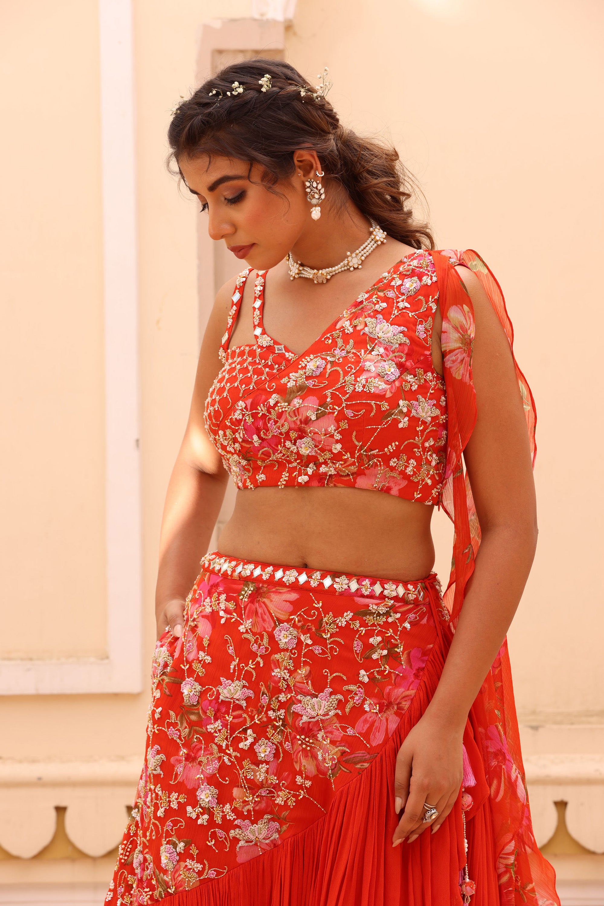 Georgette crepe lehenga with fish cut embroidered style on both front and back. Paired with one shoulder embroidered blouse with attached chiffon double ruffled dupatta